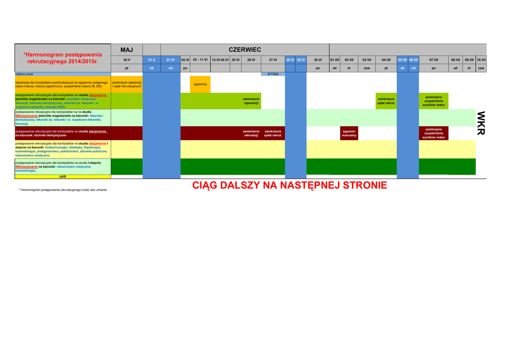 *Harmonogram postępowania rekrutacyjnego 2014/2015r. CZERWIEC MAJ 30.V 31.V 01.VI 02.VI pt sb nd pn 03 - 11.VI 12.VI-24.VI 25.VI 26.VI matura nowa 27.VI 28.VI 29.VI 30.VI 01.VII 02.VII 03.VII 04.VII pn wt śr czw pt 05.VII 06.VII sb nd 07.VII 08.VII pn wt 09.VII 10.VII śr czw WYNIKI rejestracja dla kandydatów podchodzących do egzaminu wstępnego (stara matura, matura zagraniczna, uzupełnienie matury IB, EB). postępowanie rekrutacyjne dla kandydatów na studia stacjonarne jednolite magisterskie na kierunki: analityka medyczna; farmacja; lekarsko-dentystyczny, lekarski (w. lekarski i w. wojskowo-lekarski), lekarski MON. zamknięcie rejestracji i opłat rekrutacyjnych egzaminy zamknięcie rejestracji zamknięcie opłat rekrut. zamknięcie uzupełniania wyników matur postępowanie rekrutacyjne dla kandydatów na studia stacjonarne na kierunek: techniki dentystyczne zamkniecie rekrutacji zamkniecie opłat rekrut. egzamin manualny postępowanie rekrutacyjne dla kandydatów na studia stacjonarne I stopnia na kierunki: biotechnologia, dietetyka, fizjoterapia, kosmetologia, pielęgniarstwo, położnictwo, zdrowie publiczne, ratownictwo medyczne, postępowanie rekrutacyjne dla kandydatów na studia I stopnia NIEstacjonarne na kierunki: ratownictwo medyczne, kosmetologia, UKR * Harmonogram postępowania rekrutacyjnego może ulec zmianie CIĄG DALSZY NA NASTĘPNEJ STRONIE zamknięcie uzupełniania wyników matur WKR postepowanie rekutacyjne dla kandydatów na na studia NIEstacjonarne jednolite magisterskie na kierunki: lekarskodentystyczny, lekarski (w. lekarski i w. wojskowo-lekarski), farmacja. SIER LIPIEC 11.VII pt 12.VII 13.VII sb nd 14.VII 15.VII 16.VII 17.VII 18.VII pn wt śr czw pt 19.VII 20.VII 21.VII 22.VII sb nd pn wt przyjmowanie dokumetów I próg pkt zamknięcie rejestracji zamknięcie opłat rekrut. zamknięcie uzupełniania wyników matur śr czw pt sb nd pn 29.VII 30.VII wt śr ew. II próg pkt przyjmowanie dokumentów przyjmowanie dokumentów I próg pkt przyjmowanie dokumentów przyjmowanie dokumentów ew. II próg pkt przyjmowanie dokumentów przyjmowanie dokumentów I próg pkt przyjmowanie dokumkentów przyjmowanie dokumentów zamknięc ie rejestracj i UKR 26.VII 27.VII 28.VII UKR 31.VII 01.VIII 02.VIII 03.VIII 04.VIII czw pt sb nd zamknięc ie zamknięci uzupełnia e opłat nia wyników CIĄG DALSZY NA NASTĘPNEJ STRONIE pn 05.VIII 06.VIII wt śr 07.VIII 08.VIII 09.VIII 10.VIII czw ew. III próg pkt przyjmowanie dokumentów ew. II próg pkt przyjmowanie dokumentów ew. III próg pkt przyjmowanie dokumentów ew. II próg pkt przyjmowanie dokumentów I próg pkt przyjmowanie dokumentów UKR pt sb nd 11.VIII pn 12.VIII 13.VIII 14.VIII wt śr czw WKR WKR przyjmowanie dokumentów I próg pkt 25.VII WKR zamknięcie uzupełniania wyników matur 24.VII WKR zamknięcie opłat rekrut. WKR WKR zamknięcie rejestracji 23.VII SIERPIEŃ 15.VIII 16.VIII pt sb WRZESIEŃ 17.VIII 18.VIII nd pn 19.VIII 20.VIII 21.VIII 22.VIII wt śr czw pt przyjmowanie dokumentów ew. IV próg pkt przyjmowanie dokumentów ew. III próg pkt przyjmowanie dokumentów ew. II próg pkt przyjmowanie dokumentów UKR pn wt śr czw pt sb nd 02.IX 03.IX 04.IX 05.IX 06.IX 07.IX 08.IX 09.IX 10.IX pn wt śr czw pt sb nd pn wt śr ew. V próg przyjmowanie dokumentów przyjmowanie dokumentów ew. IV próg przyjmowanie dokumentów przyjmowanie dokumentów ew. V próg przyjmowanie dokumentów przyjmowanie dokumentów ew. IV próg przyjmowanie dokumentów przyjmowanie dokumentów UKR 11.IX 12.IX czw pt ew. VI próg przyjmowanie dokumentów ew. V próg przyjmowanie dokumentów ew. VI próg przyjmowanie dokumentów ew. V próg przyjmowanie dokumentów UKR CIĄG DALSZY NA NASTĘPNEJ STRONIE 13.IX 14.IX 15.IX 16.IX 17.IX 18.IX 19.IX 20.IX sb nd pn wt śr czw pt sb ew. VII przyjmowanie próg dokumentów WKR WKR ew. III próg pkt nd 01.IX WKR WKR przyjmowanie dokumentów sb 24.VIII 25.VIII 26.VIII 27.VIII 28.VIII 29.VIII 30.VIII 31.VIII WKR ew. IV próg pkt 23.VIII ew. VI przyjmowanie próg dokumentów ew. VII przyjmowanie próg dokumentów ew. VI przyjmowanie próg dokumentów UKR 21.IX nd
