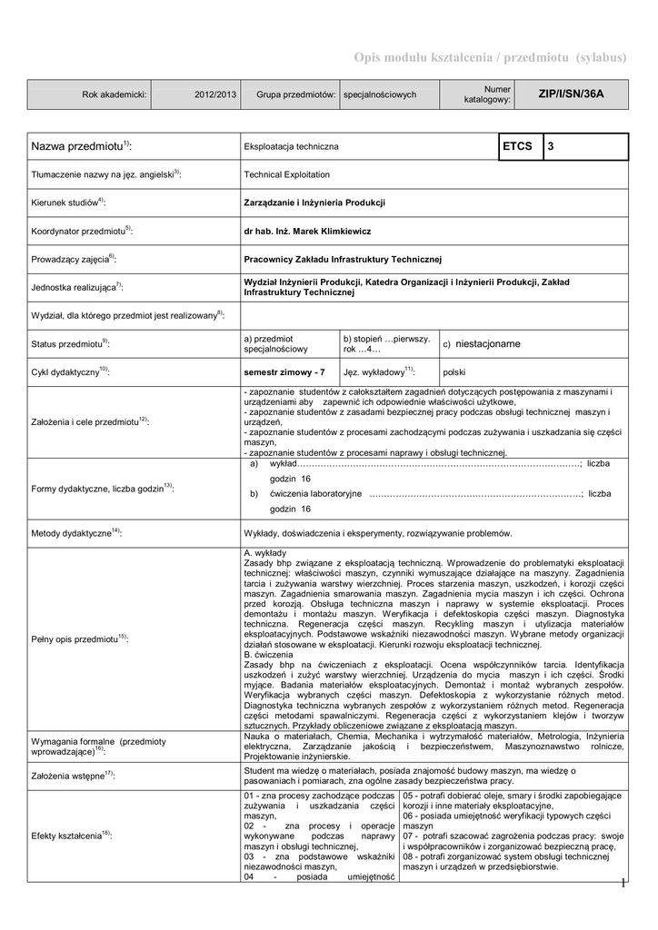 Opis modułu kształcenia / przedmiotu (sylabus) Rok akademicki: 2012/2013 Nazwa przedmiotu1): Grupa przedmiotów: specjalnościowych Numer katalogowy: ETCS Eksploatacja techniczna 3) Tłumaczenie nazwy na jęz. angielski : ZIP/I/SN/36A 3 Technical Exploitation 4) Kierunek studiów : Zarządzanie i Inżynieria Produkcji 5) Koordynator przedmiotu : dr hab. Inż. Marek Klimkiewicz 6) Prowadzący zajęcia : Pracownicy Zakładu Infrastruktury Technicznej Wydział Inżynierii Produkcji, Katedra Organizacji i Inżynierii Produkcji, Zakład Infrastruktury Technicznej 7) Jednostka realizująca : 8) Wydział, dla którego przedmiot jest realizowany : 9) Status przedmiotu : 10) Cykl dydaktyczny : a) przedmiot specjalnościowy b) stopień …pierwszy. rok …4… semestr zimowy - 7 Jęz. wykładowy : 11) c) niestacjonarne polski - zapoznanie studentów z całokształtem zagadnień dotyczących postępowania z maszynami i urządzeniami aby zapewnić ich odpowiednie właściwości użytkowe, - zapoznanie studentów z zasadami bezpiecznej pracy podczas obsługi technicznej maszyn i urządzeń, - zapoznanie studentów z procesami zachodzącymi podczas zużywania i uszkadzania się części maszyn, - zapoznanie studentów z procesami naprawy i obsługi technicznej. a) wykład……………………………………………………………………………………; liczba 12) Założenia i cele przedmiotu : godzin 16 13) Formy dydaktyczne, liczba godzin : b) ćwiczenia laboratoryjne ………………………………………………………………; liczba godzin 16 14) Metody dydaktyczne : 15) Pełny opis przedmiotu : Wymagania formalne (przedmioty 16) wprowadzające) : 17) Założenia wstępne : 18) Efekty kształcenia : Wykłady, doświadczenia i eksperymenty, rozwiązywanie problemów. A. wykłady Zasady bhp związane z eksploatacją techniczną. Wprowadzenie do problematyki eksploatacji technicznej: właściwości maszyn, czynniki wymuszające działające na maszyny. Zagadnienia tarcia i zużywania warstwy wierzchniej. Proces starzenia maszyn, uszkodzeń, i korozji części maszyn. Zagadnienia smarowania maszyn. Zagadnienia mycia maszyn i ich części. Ochrona przed korozją. Obsługa techniczna maszyn i naprawy w systemie eksploatacji. Proces demontażu i montażu maszyn. Weryfikacja i defektoskopia części maszyn. Diagnostyka techniczna. Regeneracja części maszyn. Recykling maszyn i utylizacja materiałów eksploatacyjnych. Podstawowe wskaźniki niezawodności maszyn. Wybrane metody organizacji działań stosowane w eksploatacji. Kierunki rozwoju eksploatacji technicznej. B. ćwiczenia Zasady bhp na ćwiczeniach z eksploatacji. Ocena współczynników tarcia. Identyfikacja uszkodzeń i zużyć warstwy wierzchniej. Urządzenia do mycia maszyn i ich części. Środki myjące. Badania materiałów eksploatacyjnych. Demontaż i montaż wybranych zespołów. Weryfikacja wybranych części maszyn. Defektoskopia z wykorzystanie różnych metod. Diagnostyka techniczna wybranych zespołów z wykorzystaniem różnych metod. Regeneracja części metodami spawalniczymi. Regeneracja części z wykorzystaniem klejów i tworzyw sztucznych. Przykłady obliczeniowe związane z eksploatacją maszyn. Nauka o materiałach, Chemia, Mechanika i wytrzymałość materiałów, Metrologia, Inżynieria elektryczna, Zarządzanie jakością i bezpieczeństwem, Maszynoznawstwo rolnicze, Projektowanie inżynierskie. Student ma wiedzę o materiałach, posiada znajomość budowy maszyn, ma wiedzę o pasowaniach i pomiarach, zna ogólne zasady bezpieczeństwa pracy. 01 - zna procesy zachodzące podczas zużywania i uszkadzania części maszyn, 02 zna procesy i operacje wykonywane podczas naprawy maszyn i obsługi technicznej, 03 - zna podstawowe wskaźniki niezawodności maszyn, 04 posiada umiejętność 05 - potrafi dobierać oleje, smary i środki zapobiegające korozji i inne materiały eksploatacyjne, 06 - posiada umiejętność weryfikacji typowych części maszyn 07 - potrafi szacować zagrożenia podczas pracy: swoje i współpracowników i zorganizować bezpieczną pracę, 08 - potrafi zorganizować system obsługi technicznej maszyn i urządzeń w przedsiębiorstwie. 1 bezpiecznego posługiwania się narzędziami używanymi w naprawach, 19) Sposób weryfikacji efektów kształcenia : Forma dokumentacji osiągniętych efektów 20) kształcenia : Elementy i wagi mające wpływ na ocenę 21) końcową : 22) Miejsce realizacji zajęć : - kolokwium na zajęciach ćwiczeniowych, - ocena wynikająca z obserwacji w trakcie zajęć, - egzamin pisemny. ocena wynikająca z obserwacji zajęć – lista, okresowe prace pisemne, treść pytań egzaminacyjnych z oceną. kolokwium na zajęciach ćwiczeniowych – 20%, ocena wynikająca z obserwacji w trakcie ćwiczeń – 10%, egzamin pisemny 70%. sala dydaktyczna, laboratorium. 23) Literatura podstawowa i uzupełniająca : a) podstawowa: 1. Bocheński I.C., Klimkiewicz M., Kojtych A.: Wybrane zagadnienia z technicznej obsługi pojazdów i maszyn. Wyd. SGGW, Warszawa 2001. 2. Klimkiewicz M. (Red.) Praca zbiorowa: Przewodnik do ćwiczeń z eksploatacji technicznej. Wyd. SGGW, Warszawa 2010 3. .Klimkiewicz M., Bocheński C.: Trwałość i niezawodność maszyn. Wyd. SGGW, Warszawa 1991. 4. Rzeźnik C. Podstawy obsługi technicznej maszyn rolniczych. Wyd. Akad. Rol. im. Augusta Cieszkowskiego w Poznaniu 2002. b) uzupełniająca: 1. Hebda M.: Procesy tarcia, smarowania i zużywania maszyn. Instytut Technologii Eksploatacji – PIB, 2007. 2. Żółtowski B. Cempel Cz. (redaktorzy nauk.): Inżynieria diagnostyki maszyn Polskie Tow. Diag. Tech. Inst. Tech. i Ekspl. Warszawa, Bydgoszcz, Radom 2004. 24) UWAGI : Z każdego z trzech elementów oceny student musi uzyskać minimum ocenę dostateczną - 3. Wskaźniki ilościowe charakteryzujące moduł/przedmiot 25) : Szacunkowa sumaryczna liczba godzin pracy studenta (kontaktowych i pracy własnej) niezbędna dla osiągnięcia zakł