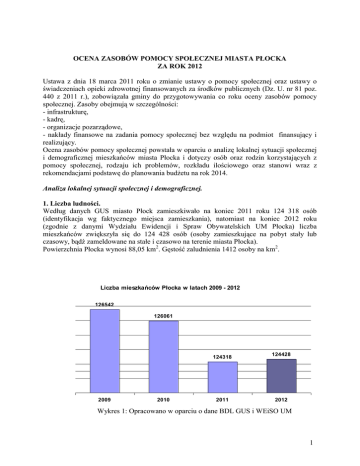 OCENA ZASOBÓW POMOCY SPOŁECZNEJ MIASTA PŁOCKA ZA ROK 2012 Ustawa z dnia 18 marca 2011 roku o zmianie ustawy o pomocy społecznej oraz ustawy o świadczeniach opieki zdrowotnej finansowanych za środków publicznych (Dz. U. nr 81 poz. 440 z 2011 r.), zobowiązała gminy do przygotowywania co roku oceny zasobów pomocy społecznej. Zasoby obejmują w szczególności: - infrastrukturę, - kadrę, - organizacje pozarządowe, - nakłady finansowe na zadania pomocy społecznej bez względu na podmiot finansujący i realizujący. Ocena zasobów pomocy społecznej powstała w oparciu o analizę lokalnej sytuacji społecznej i demograficznej mieszkańców miasta Płocka i dotyczy osób oraz rodzin korzystających z pomocy społecznej, rodzaju ich problemów, rozkładu ilościowego oraz stanowi wraz z rekomendacjami podstawę do planowania budżetu na rok 2014. Analiza lokalnej sytuacji społecznej i demograficznej. 1. Liczba ludności. Według danych GUS miasto Płock zamieszkiwało na koniec 2011 roku 124 318 osób (identyfikacja wg faktycznego miejsca zamieszkania), natomiast na koniec 2012 roku (zgodnie z danymi Wydziału Ewidencji i Spraw Obywatelskich UM Płocka) liczba mieszkańców zwiększyła się do 124 428 osób (osoby zamieszkujące na pobyt stały lub czasowy, bądź zameldowane na stałe i czasowo na terenie miasta Płocka). Powierzchnia Płocka wynosi 88,05 km2. Gęstość zaludnienia 1412 osoby na km2. Liczba mieszkańców Płocka w latach 2009 - 2012 126542 126061 124318 2009 2010 2011 124428 2012 Wykres 1: Opracowano w oparciu o dane BDL GUS i WEiSO UM 1 2. Struktura demograficzna ludności. Struktura wieku w Płocku jest zbliżona do średniej miast - powiatów grodzkich w przedziale od 80 do 200 tys. mieszkańców oraz miast podobnych. Statystyczny mieszkaniec Płocka był stosunkowo młody i miał w 2010 roku 38,6 lat, przy czym przeciętny wiek pań (41 lat) był o blisko 5 lat wyższy od przeciętnego wieku panów (36,3 lat). Statystyczny Płocczanin jest zatem nieznacznie młodszy od mieszkańca Warszawy (40,8 lat), ale starszy od mieszkańca Radomia (38,4 lat), Ostrołęki (36,9) czy Siedlec (36,5 lat). S tru k tu raw ie k um ie s z k a ń c ó w P ło c k az aro k2 0 1 1 1 2 0 0 0 1 0 0 0 0 8 0 0 0 m ę ż c z y ź n i k o b ie ty 6 0 0 0 4 0 0 0 2 0 0 0 0 0 -4 5 -9 1 0 -1 41 5 -1 92 0 -2 42 5 -2 93 0 -3 43 5 -3 94 0 -4 44 5 -4 95 0 -5 45 5 -5 96 0 -6 46 5i w ię c e j Wykres 2: Opracowano w oparciu o BDL GUS 0-4 5-9 10-14 15-19 20-24 25-29 30-34 35-39 40-44 45-49 50-54 55-59 60-64 65 i więcej 3326 2879 2812 3515 4146 5074 5358 4870 3919 3663 3963 4507 4213 6644 3094 2734 2713 3470 3912 5011 5373 4888 4123 3910 4772 5828 5259 10342 mężczyźni kobiety Coraz wyraźniej zaznacza się dysproporcja pomiędzy liczbą mężczyzn a liczbą kobiet. W 2000 roku panowie stanowili 48,1% ludności Płocka, a 11 lat później 47,5%. Na 100 płocczan przypadało 111 płocczanek, przy czym udział kobiet w ogólnej liczbie ludności jest nieznacznie niższy od 50% w młodszych grupach wiekowych, a w grupie 75 lat i więcej wynosi ponad 65%. Rezultatem przemian w procesach demograficznych jest zmniejszanie się liczby dzieci i młodzieży (0-17 lat). Ich udział w ogólnej liczbie ludności Płocka w 2011 roku wynosił 17,3% (w 2000 roku – 22,6%). Najbardziej liczne są roczniki w wieku od 20 do 29 lat, od 30 2 do 39 oraz od 50 do 59 lat. Każdy z nich stanowi ok. 14% ogółu ludności Płocka. Najmniej liczne są roczniki w wieku poniżej 9 lat – stanowią 9,5% ogółu ludności Płocka. 3. Poziom wykształcenia Struktura ludności według wykształcenia należy do kategorii danych uzyskiwanych wyłącznie podczas spisów powszechnych ludności. Obecnie dysponujemy danymi z Narodowego Spisu Powszechnego Ludności i Mieszkań, który odbył się w 2002 r., badaniem poziomu wykształcenia objęte zostały osoby w wieku 13 lat i więcej. Poziom wykształcenia mieszkańców Płocka w 2002 roku był nieznacznie gorszy w porównaniu z wykształceniem mieszkańców miast województwa mazowieckiego. Płock charakteryzuje niższy odsetek ludności z wykształceniem wyższym (o blisko 5 punktów procentowych) oraz średnim i policealnym (niemal 1,6 punktu procentowego). Kobiety częściej niż mężczyźni mają ukończoną co najmniej szkołę średnią, natomiast wśród absolwentów zasadniczych szkół zawodowych jest zdecydowanie większy udział mężczyzn niż kobiet. Także kobiety częściej niż mężczyźni kończą studia. Wykształcenie mieszkańców Płocka w oparciu o dane Narodowego Spisu Powszechnego z roku 2002 50000 45000 40000 35000 30000 25000 20000 15000 10000 5000 0 43603 20903 23303 15036 wyższe średnie i policealne zasadnicze zawodowe podstawowe ukończone 1950 2446 podstawowe nieukończone i bez wykształcenia szkolnego nieustalony Wykres 3: Opracowano w oparciu o dane BDL GUS Według danych spisowych najliczniejszą grupę stanowiły wówczas w Płocku osoby z wykształceniem średnim i policealnym (40,7%). Na drugim miejscu znalazła się grupa z wykształceniem podstawowym ukończonym (23,6%), a na trzecim z wykształceniem zasadniczym zawodowym (19,5%). Wyższym wykształceniem pochwalić się mógł zaledwie co czternasty mieszkaniec miasta. 3 4. Osoby niepełnosprawne. Poniższe zestawienie opracowane zostało na podstawie informacji zawartych w Narodowym Spisie Powszechnym Ludności i Mieszkań z 2002 roku. W Płocku odnotowano wówczas 12.658 osób niepełnosprawnych, które stanowiły blisko 10% ogółu populacji mieszkańców. Spis powszechny jako jedyne badanie pozwala ustalić liczbę osób niepełnosprawnych. W związku ze złożonością definicji osoby niepełnosprawnej zbiorowość osób niepełnosprawnych podzielono na dwie podstawowe grupy: · osoby niepełnosprawne prawnie, tj. takie, które posiadały odpowiednie, aktualne orzeczenie wydane przez organ do tego uprawniony; · osoby niepełnosprawne tylko biologicznie, tj. takie, które nie 