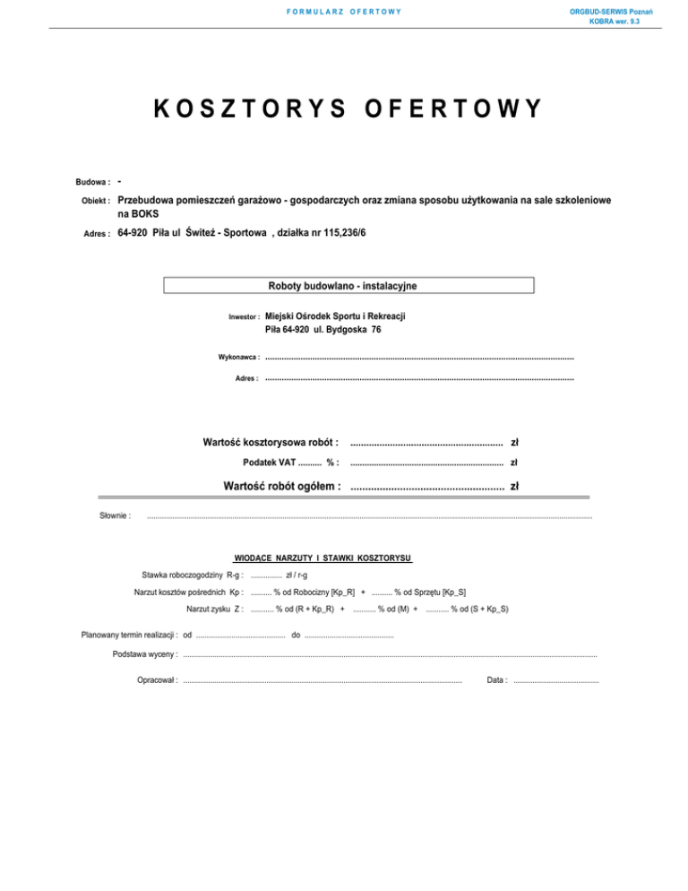 FORMULARZ OFERTOWY ORGBUD-SERWIS Poznań KOBRA wer. 9.3 KOSZTORYS OFERTOWY Budowa : - Obiekt : Przebudowa pomieszczeń garaŜowo - gospodarczych oraz zmiana sposobu uŜytkowania na sale szkoleniowe na BOKS Adres : 64-920 Piła ul ŚwiteŜ - Sportowa , działka nr 115,236/6 Roboty budowlano - instalacyjne Inwestor : Miejski Ośrodek Sportu i Rekreacji Piła 64-920 ul. Bydgoska 76 Wykonawca : ................................................................................................................................... Adres : ................................................................................................................................... Wartość kosztorysowa robót : .......................................................... zł Podatek VAT .......... % : ................................................................. zł Wartość robót ogółem : ..................................................... zł Słownie : ...................................................................................................................................................................................................................... WIODĄCE NARZUTY I STAWKI KOSZTORYSU Stawka roboczogodziny R-g : ............... zł / r-g Narzut kosztów pośrednich Kp : .......... % od Robocizny [Kp_R] + .......... % od Sprzętu [Kp_S] Narzut zysku Z : ........... % od (R + Kp_R) + ........... % od (M) + ........... % od (S + Kp_S) Planowany termin realizacji : od ........................................... do ........................................... Podstawa wyceny : ....................................................................................................................................................................................................... Opracował : ...................................................................................................................................... Data : ......................................... TABELA ELEMENTÓW SCALONYCH ORGBUD-SERWIS Poznań KOBRA wer. 9.3 Roboty budowlano - instalacyjne Budowa : Obiekt : Przebudowa pomieszczeń garaŜowo - gospodarczych oraz zmiana sposobu uŜytkowania na sale szkoleniowe na BOKS Adres : 64-920 Piła ul ŚwiteŜ - Sportowa , działka nr 115,236/6 WIODĄCE NARZUTY I STAWKI KOSZTORYSU Stawka roboczogodziny R-g : ............... zł / r-g Narzut kosztów pośrednich Kp : ............... % od Robocizny [Kp_R] + ............... % od Sprzętu [Kp_S] Narzut zysku Z : ............... % od (R + Kp_R) + ............... % od (M) + ............... % od (S + Kp_S) Poziom cen : ....................................................................... TABELA ELEMENTÓW SCALONYCH Lp. Str: 1 Wartość [ zł ] Opis stanu / elementu 1 STAN : Sale szkoleniowe na Boks , Judo , L.A. roboty budowlano - instalacyjne 1.1 ELEMENT : Roboty budowlane sale boksu , judo , L.A. .................................... 1.2 ELEMENT : Wewnętrzna instalacja wod - kan co , wentylacja pom boksun , judo , L.A .................................... 1.3 ELEMENT : Przyłącze wodociągowe .................................... 1.4 ELEMENT : Instalacje wewnętrzne elektryczne pom sal boksu , judo , L.A. .................................... Razem : Sale szkoleniowe na Boks , Judo , L.A. roboty budowlano - instalacyjne .................................... Wartość kosztorysowa robót : ....................................