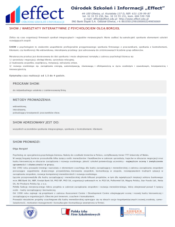 SHOW / WARSZTATY INTERAKTYWNE Z PSYCHOLOGIEM OLGĄ BORGIEŁ Zbliża się czas organizacji firmowych spotkań integracyjnych i wyjazdów motywacyjnych. Warto zadbać by uatrakcyjnić spotkanie elementami szkoleń rozwijających zespół. S HO W z psychologiem to znakomite uzupełnienie profesjonalnie przygotowanego spotkania firmowego z pracownikami, spotkania z kontrahentami, klientami, czy konferencji. Ma widowiskowy, interaktywny przebieg i jest adresowany do zróżnicowanych liczebnie grup odbiorców. Merytoryczny przekaz jest dostosowany do idei spotkania i może obejmować tematykę z zakresu psychologii biznesu np: 1/ sprzedaży i negocjacji, obsługi klienta, sprzedaży relacyjnej, 2/ budowania zespołów, współpracy, motywacji, wdrażania zmian, 3/ rozwoju osobistego np. zarządzania energią, automotywacją, równowagą i efektywnością w życiu osobistym i zawodowym, kreatywnością i innowacyjnością. O p tyma lny c za s re a liza c ji: o d 1 , 5 d o 4 g o d zin. PROGRAM SHOW: do indywidualnego ustalenia z zainteresowaną firmą. METODY PROWADZENIA: widowiskowy, interaktywny, pobudzający kreatywność pracowników show. SHOW ADRESOWANY JEST DO: wszystkich uczestników spotkania integracyjnego, spotkania z kontrahentami, klientami. SHOW PROWADZI: O lg a Bo rg ie ł Psycholog ze specjalnością psychologia biznesu. Należy do czołówki trenerów w Polsce, certyfikowany trener TTT University of Wales. W swojej bogatej karierze przeszkoliła kilka tysięcy osób: menedżerów i handlowców w zakresie sprzedaży, kupców w obszarze negocjacji oraz kadry kierowniczej w obszarze zarządzania i rozwoju osobistego. Jakość szkoleń potwierdzają uczestnicy na jwyższe o c e ny i zwię ksze nie sp ra wno śc i i skute c zno śc i w p ra c y. Od 1992 roku prowadzi treningi i warsztaty z elementami coachingu dla kadry zarządzającej i menedżerskiej z zakresu zarządzania zespołami poruszające zagadnienia skutecznego przywództwa, kierowania zespołem, komunikacją w zespole, rozwiązywaniem trudnych sytuacji w zarządzaniu zespołem, rozwoju kompetencji menedżerskich i rozwoju osobistego. Łącznie przeprowadziła dla kadry zarządzającej i menedżerskiej około kilkuset projektów, w tym dla największych instytucji sektora bankowego m.in. BRE Bank SA, NBP, Kredyt Bank SA, PKO BP, PKO SA, organizacji rynkowych m. in. PGE SA, Polkomtel SA, Magna Polska, Star Foods Ltd., Netia SA, Air Products Polska Sp. z o.o. Pełniła funkcję merytorycznego lidera projektu w zakresie zarządzania zespołem i rozwoju menedżerskiego, który obejmował ponad 5 tysięcy osób kadry zarządzającej i kierowniczej. Od 1998 roku zajmuje się projektami z zakresu Assessment Centre i Development Centre obejmującymi ocenę i rozwój kadry kierowniczej i zarządzającej w organizacjach. Obecnie jest trenerem, coachem i konsultantem. Prowadzi niezależne projekty coachingowe dla kadry menedżerskiej opierające się na ideach socjo-kognitywistycznych (rozwój osobisty, samoświadomość, motivation management) i konsultacyjne (komunikacja wewnętrzna w firmie). Prowadziła projekty w obszarze HR dla kadry takich organizacji m.in. jak: PKO BP SA, Kredyt Bank SA, BRE Bank SA, CJ International, MPiPS, Formes sp. z o.o., PCP sp. z o.o., EC Zabrze SA, PKO BP SA we współpracy z Ernst&Young. Projekty z AC/DC prowadziła m.in. dla: PRInż Holding SA, Totalizator Sportowy, SOS Wioski Dziecięce, Huta Buczek SA, Kredyt Bank SA. W ramach współpracy realizuje złożone sesje AC / DC dla kilku wiodących firm konsultingowych na stanowiska menedżerskie, handlowe i wysokospecjalistyczne. SHOW ODBĘDZIE SIĘ W TERMINIE: ustalonym indywidualnie z zainteresowanymi firmami. WSZELKICH DODATKOWYCH INFORMACJI UDZIELAJĄ: K a ta rzyna K rzyża no wska Jo a nna Ja ro sz - O p o lka tel. (32) 33 55 153 tel. (32) 33 55 150 fax (32) 33 55 151 fax (32) 33 55 151 tel. kom. 662 297 689 tel. kom. 662 297 689 e-mail: effect@ effect.edu.pl e-mail: effect@ effect.edu.pl Serdecznie zapraszamy! Ta strona używa plików cookies Zamknij Więcej informacji o plikach cookies