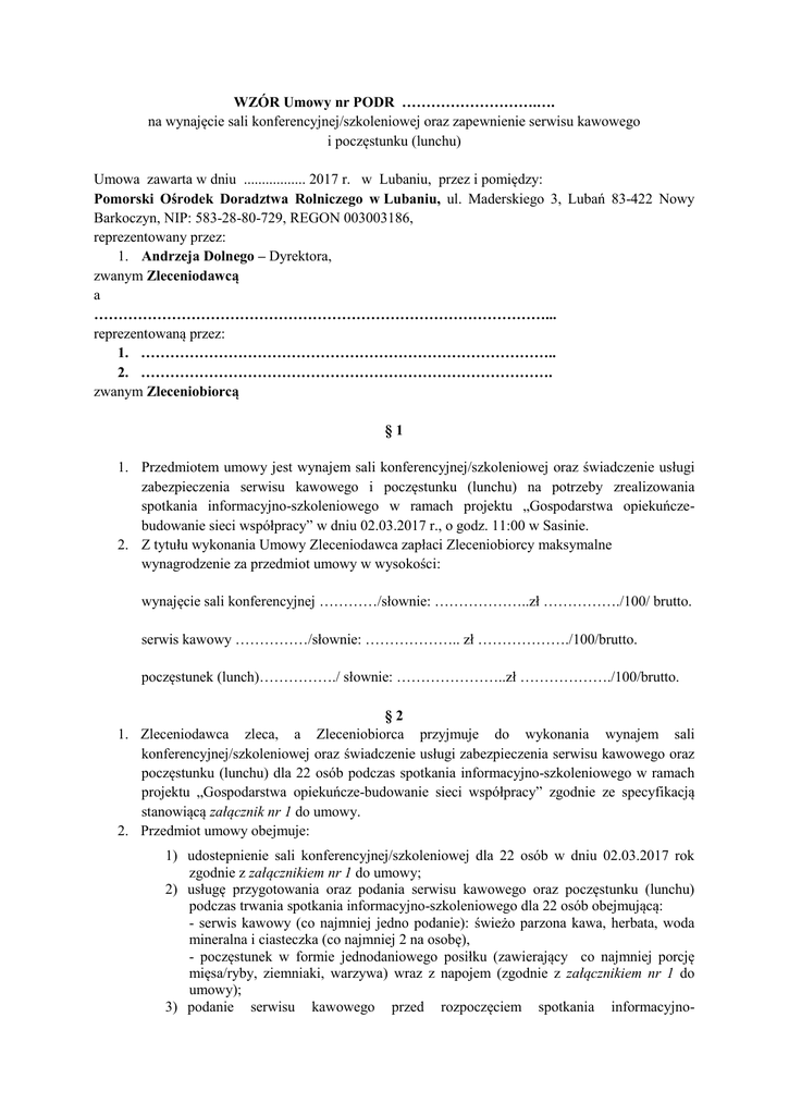 WZÓR Umowy nr PODR ……………………….…. na wynajęcie sali konferencyjnej/szkoleniowej oraz zapewnienie serwisu kawowego i poczęstunku (lunchu) Umowa zawarta w dniu ................. 2017 r. w Lubaniu, przez i pomiędzy: Pomorski Ośrodek Doradztwa Rolniczego w Lubaniu, ul. Maderskiego 3, Lubań 83-422 Nowy Barkoczyn, NIP: 583-28-80-729, REGON 003003186, reprezentowany przez: 1. Andrzeja Dolnego – Dyrektora, zwanym Zleceniodawcą a …………………………………………………………………………………... reprezentowaną przez: 1. ………………………………………………………………………….. 2. …………………………………………………………………………. zwanym Zleceniobiorcą §1 1. Przedmiotem umowy jest wynajem sali konferencyjnej/szkoleniowej oraz świadczenie usługi zabezpieczenia serwisu kawowego i poczęstunku (lunchu) na potrzeby zrealizowania spotkania informacyjno-szkoleniowego w ramach projektu „Gospodarstwa opiekuńczebudowanie sieci współpracy” w dniu 02.03.2017 r., o godz. 11:00 w Sasinie. 2. Z tytułu wykonania Umowy Zleceniodawca zapłaci Zleceniobiorcy maksymalne wynagrodzenie za przedmiot umowy w wysokości: wynajęcie sali konferencyjnej …………/słownie: ………………..zł ……………./100/ brutto. serwis kawowy ……………/słownie: ……………….. zł ………………./100/brutto. poczęstunek (lunch)……………./ słownie: …………………..zł ………………./100/brutto. §2 1. Zleceniodawca zleca, a Zleceniobiorca przyjmuje do wykonania wynajem sali konferencyjnej/szkoleniowej oraz świadczenie usługi zabezpieczenia serwisu kawowego oraz poczęstunku (lunchu) dla 22 osób podczas spotkania informacyjno-szkoleniowego w ramach projektu „Gospodarstwa opiekuńcze-budowanie sieci współpracy” zgodnie ze specyfikacją stanowiącą załącznik nr 1 do umowy. 2. Przedmiot umowy obejmuje: 1) udostepnienie sali konferencyjnej/szkoleniowej dla 22 osób w dniu 02.03.2017 rok zgodnie z załącznikiem nr 1 do umowy; 2) usługę przygotowania oraz podania serwisu kawowego oraz poczęstunku (lunchu) podczas trwania spotkania informacyjno-szkoleniowego dla 22 osób obejmującą: - serwis kawowy (co najmniej jedno podanie): świeżo parzona kawa, herbata, woda mineralna i ciasteczka (co najmniej 2 na osobę), - poczęstunek w formie jednodaniowego posiłku (zawierający co najmniej porcję mięsa/ryby, ziemniaki, warzywa) wraz z napojem (zgodnie z załącznikiem nr 1 do umowy); 3) podanie serwisu kawowego przed rozpoczęciem spotkania informacyjno- 4) 5) 6) 7) szkoleniowego oraz podanie jednodaniowego posiłku po zakończeniu spotkania informacyjno-szkoleniowego; zebrania naczyń oraz resztek pokonsumpcyjnych najpóźniej 30 min. po zakończeniu każdego spotkania; zapewnienie czystej i nieuszkodzonej zastawy stołowej ceramicznej, sztućców metalowych, szklanek, filiżanek, oraz obecności na czas trwania wydawania posiłków obsługi kelnerskiej, zachowania zasad higieny i obowiązujących przepisów sanitarnych przy przygotowywaniu posiłków, przygotowywania posiłków pełnowartościowych, ze świeżych produktów z ważnymi terminami przydatności do spożycia. 3. Wykonanie usługi będzie realizowane na terenie województwa pomorskiego w miejscowości: Sasino w terminie 02.03.2017 rok. 4. Wykonawca oświadcza, że dysponuje odpowiednią wiedzą i doświadczeniem oraz zapleczem organizacyjnym i technicznym koniecznymi do wykonania przedmiotu umowy. 5. Zleceniobiorca zrealizuje przedmiot umowy zgodnie z obowiązującymi przepisami dotyczącymi zbiorowego żywienia. 6. Zleceniobiorca zapewni Zleceniodawcy dostęp do pomieszczenia, w którym będzie świadczona usługa. 7. Zleceniobiorca odpowiada za usuwanie i utylizację odpadków, śmieci oraz innych pozostałości powstałych w związku z wykonywaniem przedmiotu umowy. 8. Zleceniobiorca odpowiada za transport przedmiotu zamówienia oraz podanie go zgodnie z wymaganiami sanitarnymi dotyczącymi żywności i żywienia. 9. Zleceniobiorca zapewni odpowiednią liczbę osób do obsługi. 10. Zleceniobiorca zapewni niezbędny sprzęt, tj. warnik, podgrzewacze, termosy, naczynia (zapewnienie czystej i nieuszkodzonej zastawy stołowej ceramicznej, sztućców metalowych, szklanek, filiżanek), obrusy, serwetki, a także inny konieczny sprzęt i materiały niezbędne do realizacji przedmiotu Umowy. §3 1. W ramach niniejszej umowy Zleceniodawca zobowiązuje się do zapłaty za należytą realizację całego przedmiotu umowy przez Zleceniobiorcę, w terminie ….. dni od daty otrzymania przez Zleceniodawcę prawidłowo wystawionego rachunku co nie może nastąpić szybciej niż po zakończeniu ww. zadania i podpisaniu przez Strony protokołu odbioru, stanowiącego załącznik nr 2 do niniejszej umowy, na rzecz Zleceniobiorcy kwoty pieniężnej wskazanej w §1 pkt.2 . 2. Strony ustalają, że za dzień zapłaty uważa się datę obciążenia rachunku Zleceniodawcy. 3. Kwota ta zostanie przekazana na konto zleceniobiorcy ……………………………………….. §4 1. Strony niniejszej umowy wyznaczą po jednym przedstawicielu odpowiedzialnym za współdziałanie i czuwanie nad właściwą realizacją postanowień umowy. a. Ze strony zleceniodawcy – Barbara Ditrich, tel. 607-143-790 b. Ze strony zleceniobiorcy – ………………., tel……………… §5 1. Strony niniejszej umowy zobowiązują się do wzajemnego poszanowania swoich interesów i udzielania sobie wszelkich informacji niezbędnych do prawidłowego wykonania postanowień umowy. 2. Strony zobowiązują się w trakcie obowiązywania niniejszej umowy do powstrzymania się od wszelkich działań, które mogłyby narazić na szwank dotychczasową renomę każdej ze Stron. §6 1. Strony zobowiązują się do dochowania tajemnicy co do treści niniejszej umowy. 2. Strony zobowiązują się ponadto do zachowania poufności i nie 