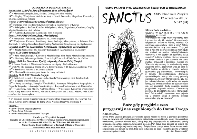 OGŁOSZENIA DUSZPASTERSKIE Poniedziałek 13.09 13.09 Św. Jana Chryzostoma, (wsp. obo obowiązkowe) 700 + Mariannę Domagała, Jana, Stefana, Domagałów z int. rodziny 1800 + Reginę, Władysława Nosków (r. śm), + Józefa Woźniaka, Magdalenę Kowalską z int. syna Andrzeja z rodziną Wtorek 14.09 Podwyższenie Krzyża Świętego, (święto) 1700 w intencji tych co odnowili Krzyż przy szkole Podstawowej w Kowali 1730 + Władysława, Stefanię Kruków, Władysława, Marię, Eugeniusza, Czesława, Cecylię, Monikę Śmietanów z int. rodziny 1800 + Andrzeja Kubickiego (r. śm) z int. żony z dziećmi Środa 15.09 NMP Bolesnej, (wsp. obowiązkowe) 700 + Franciszka i Mariannę Zegadłów z int. Józefa Zegadły 1800 Władysława Korbana, Stanisławę, Annę Andrzeja, Mieczysława, + Edwarda Paradowskich, + Helenę, Stanisława Kasprzyków, Waldemara Bieleckiego z int. Korbanowej Czwartek 16.09 Św. męczenników Korneliusza Korneliusza i Cypriana (wsp. obowiązko obowiązkowe) 1800 + Józefę Ramiączek i zm. z rodziny Ramiączków i Zawadzkich z int. rodziny Piątek 17.09 Dzień Powszedni 1730 + Jana Machulskiego, + Krzysztofa Machulskiego z int. Jacka Machulskiego z rodziną 1800 + Mariannę, Wincentego Golów, Franciszkę i Franciszka Klisików z int. Golów Sobota 18.09 Św. Stanisława Kostki, zakonnika, Patrona Polski (święto) 700 + Dorotę Gawior, + Mirosława Gawiora z int. Agaty i Darka Gawiora 730 Do SPJ i MB dziękcz. z prośbą o bł. w dorosłym życiu w 18-tą r. ur. Magdaleny Woś 1730 + Stanisława Kaczora z int. żony z dziećmi 1800 + Mariana Bentkowskiego (r. śm) z int. żony z dziećmi Niedziela 19.09 XXV Niedziela Niedziela Zwykła 800 + Zofię Lech (r. śm), + Henryka Lecha, Karola Tetelewskiego z int. Tetelewskich 1000 + Bogdana Wawrzeńczyka (r. śm) 1200 + Annę, Antoniego, Henryka Wierzbickich, Katarzynę Władysława Kasprzyków, + Edwarda Kasperka, + Andrzeja Czarnieckiego, + Lucjana Frankowicza z int. Kasperków 1600 + Genowefę, Jana Majów, Andrzeja Bosia, + Wincentego, Katarzynę Wojciechowskich, Annę Stanisława Roberta, Mariana Krawczyków, zm. z rodz. Majów, rodz. Krawczyków z int. Krawczyków PISMO PARAFII P.W. WSZYSTKICH ŚWIĘTYCH W BRZEZINACH SANC SANCTUS Słowo Boże na dziś… Czytania: Wj 32,7-11.13-14 / 1 Tm 1,12-17 Ewangelia: Łk 15,1-10 Przychodzili do Niego wszyscy poborcy opłat i grzesznicy, aby Go słuchać. Szemrali na to faryzeusze i uczeni w Piśmie, mówiąc: "On przyjmuje grzeszników i jada z nimi". Wtedy opowiedział im taką przypowieść: "Czy jeśli ktoś z was ma sto owiec i jedną z nich zgubi, nie zostawi na pustyni dziewięćdziesięciu dziewięciu i nie pójdzie za zgubioną, aż ją znajdzie? A kiedy znajdzie, bierze z radością na swoje ramiona i po powrocie do domu zwołuje przyjaciół i sąsiadów, mówiąc im: "Cieszcie się ze mną, bo znalazłem tę swoją zgubioną owcę". Zapewniam was, że taka radość będzie w niebie z powodu jednego grzesznika, gdy się nawraca, i to bardziej niż z powodu dziewięćdziesięciu dziewięciu sprawiedliwych, którzy nie czują potrzeby nawrócenia. Albo czy któraś kobieta, gdy mając dziesięć drachm, zgubi jedną, nie zapala lampy, nie wymiata domu i nie szuka dokładnie, aż znajdzie? Kiedy znajdzie, zwołuje przyjaciółki i sąsiadki mówiąc: "Cieszcie się ze mną, bo znalazłam drachmę, którą zgubiłam". Taka radość, zapewniam was, pojawia się u aniołów Boga z powodu jednego grzesznika, gdy się nawraca". † W ostatnim czasie z naszej wspólnoty parafialnej pożegnaliśmy śp. Henryka Klisika z Kowali który odszedł do domu Ojca. Niech odpoczywa w pokoju † Ekstra… × 12.09 – Święto Wojsk Lądowych × 17.09 – Dzień Sybiraka × 18.09 – Międzynarodowy Dzień Turystyki Parafia p.w. Wszystkich Świętych Brzeziny ul. Chęcińska 312, 26-026 Morawica, e-mail: [email protected] nr tel. ks. Proboszcz 041 311 42 59, ks. Wikariusz 041 311 48 98 Numer konta: Bank Spółdzielczy w Kielcach Oddział w Morawicy 08 84930004 0070 0205 4104 0001 D O U Ż Y T K U W E W E N Ę T R Z N E G O XXIV Niedziela Zwykła 12 września 2010 r. Nr 42 (94) Boże gdy przyjdzie czas przygarnij nas zagubionych do Domu Twego Komentarz… Słowa Pana Jezusa głoszące, że większa będzie radość w niebie z jednego grzesznika, który się nawraca, niż z dziewięćdziesięciu dziewięciu sprawiedliwych, którzy nie potrzebują nawrócenia, powinny ośmielić tych, którzy boją się przystępować do sakramentu pokuty uważając, że są tego niegodni. Ewangelia głosi, że Pan Jezus staje zawsze po stronie najsłabszych, choćby jednej bezbronnej owcy. Święty Paweł podaje słowa Pana Jezusa: większą radością jest dawać niż brać. Bóg stale raduje się, że daje – wypełnia pustkę w ludzkim sercu swoją obecnością. /ks. Jan Twardowski/ Boży człowiek… - św. Jan Chryzostom (13 września) A w parafii… ▪ Pismo SANCTUS w ostatnim czasie zakupiło do Kościoła komplet lekcjonarzy ▪ 05.09. b. r. w kościele odbyły się modlitwy dzieci i młodzieży szkolnej o błogosławieństwo w nauce w nowym roku szkolnym ▪ W ubiegłym tygodniu po odnowieniu wrócił do kościoła obraz Św. Teresy od Dzieciątka Jezus i akt oddania Matce Najświętszej. ▪ W najbliższą sobotę 18 września przypada święto Św. Stanisława Kostki patrona dzieci i młodzieży, zapraszamy na Msze Świętą. ▪ Pani Irena Gola zrobiła dwa piękne różańce z materiału. Podczas pielgrzymki jeden z nich przekazała do radia Jasna Góra w Częstochowie, a drugi do opactwa Cystersów w Jędrzejowie. W poszukiwaniu… Z życia wsi… „Zmarły… Uczczono go przez długie pięć minut milczenia, nikt bowiem o nim nie miał nic do powiedzenia” jakże często jest tak, że można żyć obok kogoś wiele lat a tak naprawde nic o nim nie wiedzieć. Zapatrzeni na własne sprawy nie mamy czasu, nie mamy chęci spojrzeć na drugiego człowieka, zatrzymać się porozmawiać chwilę.