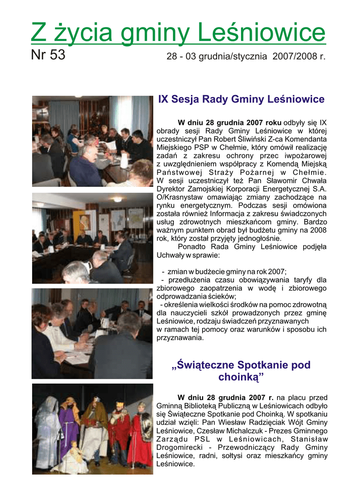 Z ¿ycia gminy Leœniowice Nr 53 28 - 03 grudnia/stycznia 2007/2008 r. IX Sesja Rady Gminy Leœniowice W dniu 28 grudnia 2007 roku odby³y siê IX obrady sesji Rady Gminy Leœniowice w której uczestniczy³ Pan Robert Œliwiñski Z-ca Komendanta Miejskiego PSP w Che³mie, który omówi³ realizacjê zadañ z zakresu ochrony przec iwpo¿arowej z uwzglêdnieniem wspó³pracy z Komend¹ Miejsk¹ Pañstwowej Stra¿y Po¿arnej w Che³mie. W sesji uczestniczy³ te¿ Pan S³awomir Chwa³a Dyrektor Zamojskiej Korporacji Energetycznej S.A. O/Krasnystaw omawiaj¹c zmiany zachodz¹ce na rynku energetycznym. Podczas sesji omówiona zosta³a równie¿ Informacja z zakresu œwiadczonych us³ug zdrowotnych mieszkañcom gminy. Bardzo wa¿nym punktem obrad by³ bud¿etu gminy na 2008 rok, który zosta³ przyjêty jednog³oœnie. Ponadto Rada Gminy Leœniowice podjê³a Uchwa³y w sprawie: - zmian w bud¿ecie gminy na rok 2007; - przed³u¿enia czasu obowi¹zywania taryfy dla zbiorowego zaopatrzenia w wodê i zbiorowego odprowadzania œcieków; - okreœlenia wielkoœci œrodków na pomoc zdrowotn¹ dla nauczycieli szkó³ prowadzonych przez gminê Leœniowice, rodzaju œwiadczeñ przyznawanych w ramach tej pomocy oraz warunków i sposobu ich przyznawania. „Œwi¹teczne Spotkanie pod choink¹” W dniu 28 grudnia 2007 r. na placu przed Gminn¹ Bibliotek¹ Publiczn¹ w Leœniowicach odby³o siê Œwi¹teczne Spotkanie pod Choink¹. W spotkaniu udzia³ wziêli: Pan Wies³aw Radziêciak Wójt Gminy Leœniowice, Czes³aw Michalczuk - Prezes Gminnego Zarz¹du PSL w Leœniowicach, Stanis³aw Drogomirecki - Przewodnicz¹cy Rady Gminy Leœniowice, radni, so³tysi oraz mieszkañcy gminy Leœniowice. Spotkanie otworzy³ Wójt Gminy, który wyg³osi³ krótkie przemówienie okolicznoœciowe. Nastêpnie Ks. Andrzej Pyter Proboszcz Parafii w Kumowie Plebañskim zmówi³ modlitwê, po której wszyscy zgromadzeni prze³amali siê op³atkiem. Œwi¹teczny charakter spotkania podkreœli³y jase³ka i kolêdy w wykonaniu m³odzie¿y z Publicznego Gimnazjum w Sielcu, kolêdy w wykonaniu M³odzie¿owej Orkiestry Dêtej oraz zespo³ów œpiewaczych: „Sielanki”, „Kumowianki” i „Rako³upianki. Narada Kierownictwa Urzêdu Gminy Leœniowice . W dniu 3 stycznia 2008 roku odby³a siê narada Kierownictwa, podczas której Wójt Gminy Leœniowice przekaza³ kierownikom wnioski oraz Uchwa³y przyjête podczas IX obrad sesji Rady Gminy Leœniowice. Ponadto omówione zosta³y sprawy bie¿¹ce dotycz¹ce funkcjonowania Urzêdu.