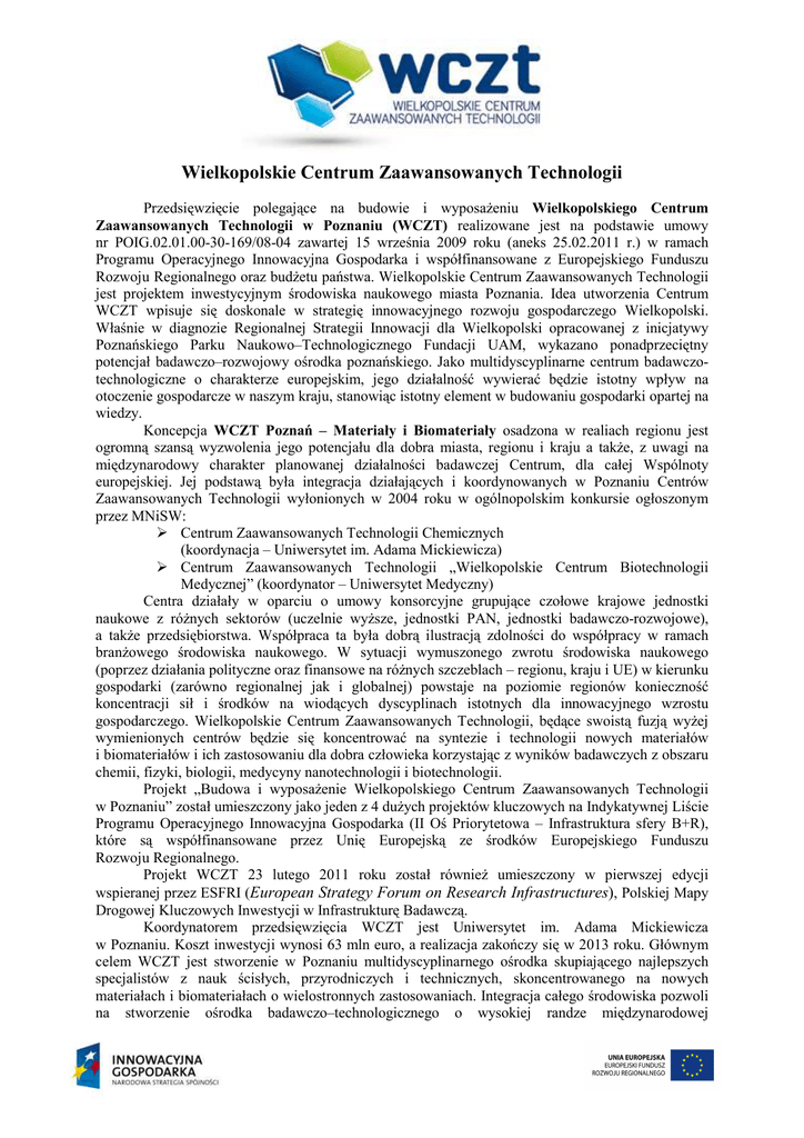 Wielkopolskie Centrum Zaawansowanych Technologii Przedsięwzięcie polegające na budowie i wyposaŜeniu Wielkopolskiego Centrum Zaawansowanych Technologii w Poznaniu (WCZT) realizowane jest na podstawie umowy nr POIG.02.01.00-30-169/08-04 zawartej 15 września 2009 roku (aneks 25.02.2011 r.) w ramach Programu Operacyjnego Innowacyjna Gospodarka i współfinansowane z Europejskiego Funduszu Rozwoju Regionalnego oraz budŜetu państwa. Wielkopolskie Centrum Zaawansowanych Technologii jest projektem inwestycyjnym środowiska naukowego miasta Poznania. Idea utworzenia Centrum WCZT wpisuje się doskonale w strategię innowacyjnego rozwoju gospodarczego Wielkopolski. Właśnie w diagnozie Regionalnej Strategii Innowacji dla Wielkopolski opracowanej z inicjatywy Poznańskiego Parku Naukowo–Technologicznego Fundacji UAM, wykazano ponadprzeciętny potencjał badawczo–rozwojowy ośrodka poznańskiego. Jako multidyscyplinarne centrum badawczotechnologiczne o charakterze europejskim, jego działalność wywierać będzie istotny wpływ na otoczenie gospodarcze w naszym kraju, stanowiąc istotny element w budowaniu gospodarki opartej na wiedzy. Koncepcja WCZT Poznań – Materiały i Biomateriały osadzona w realiach regionu jest ogromną szansą wyzwolenia jego potencjału dla dobra miasta, regionu i kraju a takŜe, z uwagi na międzynarodowy charakter planowanej działalności badawczej Centrum, dla całej Wspólnoty europejskiej. Jej podstawą była integracja działających i koordynowanych w Poznaniu Centrów Zaawansowanych Technologii wyłonionych w 2004 roku w ogólnopolskim konkursie ogłoszonym przez MNiSW: Centrum Zaawansowanych Technologii Chemicznych (koordynacja – Uniwersytet im. Adama Mickiewicza) Centrum Zaawansowanych Technologii „Wielkopolskie Centrum Biotechnologii Medycznej” (koordynator – Uniwersytet Medyczny) Centra działały w oparciu o umowy konsorcyjne grupujące czołowe krajowe jednostki naukowe z róŜnych sektorów (uczelnie wyŜsze, jednostki PAN, jednostki badawczo-rozwojowe), a takŜe przedsiębiorstwa. Współpraca ta była dobrą ilustracją zdolności do współpracy w ramach branŜowego środowiska naukowego. W sytuacji wymuszonego zwrotu środowiska naukowego (poprzez działania polityczne oraz finansowe na róŜnych szczeblach – regionu, kraju i UE) w kierunku gospodarki (zarówno regionalnej jak i globalnej) powstaje na poziomie regionów konieczność koncentracji sił i środków na wiodących dyscyplinach istotnych dla innowacyjnego wzrostu gospodarczego. Wielkopolskie Centrum Zaawansowanych Technologii, będące swoistą fuzją wyŜej wymienionych centrów będzie się koncentrować na syntezie i technologii nowych materiałów i biomateriałów i ich zastosowaniu dla dobra człowieka korzystając z wyników badawczych z obszaru chemii, fizyki, biologii, medycyny nanotechnologii i biotechnologii. Projekt „Budowa i wyposaŜenie Wielkopolskiego Centrum Zaawansowanych Technologii w Poznaniu” został umieszczony jako jeden z 4 duŜych projektów kluczowych na Indykatywnej Liście Programu Operacyjnego Innowacyjna Gospodarka (II Oś Priorytetowa – Infrastruktura sfery B+R), które są współfinansowane przez Unię Europejską ze środków Europejskiego Funduszu Rozwoju Regionalnego. Projekt WCZT 23 lutego 2011 roku został równieŜ umieszczony w pierwszej edycji wspieranej przez ESFRI (European Strategy Forum on Research Infrastructures), Polskiej Mapy Drogowej Kluczowych Inwestycji w Infrastrukturę Badawczą. Koordynatorem przedsięwzięcia WCZT jest Uniwersytet im. Adama Mickiewicza w Poznaniu. Koszt inwestycji wynosi 63 mln euro, a realizacja zakończy się w 2013 roku. Głównym celem WCZT jest stworzenie w Poznaniu multidyscyplinarnego ośrodka skupiającego najlepszych specjalistów z nauk ścisłych, przyrodniczych i technicznych, skoncentrowanego na nowych materiałach i biomateriałach o wielostronnych zastosowaniach. Integracja całego środowiska pozwoli na stworzenie ośrodka badawczo–technologicznego o wysokiej randze międzynarodowej z perspektywą utworzenia w Poznaniu Międzynarodowego Instytutu Technologicznego. Istotą multidyscyplinarnych działań tego ośrodka będzie opracowanie oryginalnych syntez chemikaliów, biochemikaliów i agrochemikaliów (tzw. fine chemicals), a takŜe nowej generacji bio- i nanomateriałów oraz ich prekursorów, a następnie opracowanie zaawansowanych technologii i biotechnologii ich wytwarzania z przeznaczeniem m.in. dla optoelektroniki, medycyny, farmacji rolnictwa oraz wielu innych dziedzin przemysłu i techniki. Celem tych badań jest równieŜ stworzenie podstaw technologicznych dla szeregu zastosowań chemii bioorganicznej, biologii molekularnej i biotechnologii w szeroko pojętej ochronie zdrowia (tj. molekularnej i komórkowej terapii i diagnostyce medycznej), a takŜe dla zastosowań agrotechnicznych i w przemyśle spoŜywczym (testy DNA w uprawie roślin i hodowli zwierząt, dodatki do Ŝywności i pasz, biodegradowalne opakowania, itp.). WCZT jako przedsięwzięcie infrastrukturalne środowiska naukowego miasta Poznania tworzone jest przez następujące instytucje: Uniwersytet im. Adama Mickiewicza w Poznaniu - Koordynator Uniwersytet Przyrodniczy w Poznaniu Politechnika Poznańska Uniwersytet Medyczny im. K. Marcinkowskiego w Poznaniu Uniwersytet Ekonomiczny w Poznaniu Instytut Chemii Bioorganicznej PAN Instytut Fizyki Molekularnej PAN Instytut Genetyki Roślin PAN Instytut Genetyki Człowieka PAN Instytut Włókien Naturalnych i Roślin Zielarskich Poznański Park Naukowo-Technologiczny Fundacji UAM Na podstawie umowy konsorcjum zawartej 22 grudnia 2006 roku przedstawiciele Konsorcjum tworzą Komitet Koordynacyjny Wielkopolskiego Centrum Zaawansowanych Technologii. Komitet Koordynacyjny planuje ustanowienie Międzynarodowego Komitetu Doradczego Wielkopolskiego Centrum Zaawansowanych Technologii. WCZT - Materiały i Biomateriały zlokalizowane będzie w Poznaniu na Kampusie UA