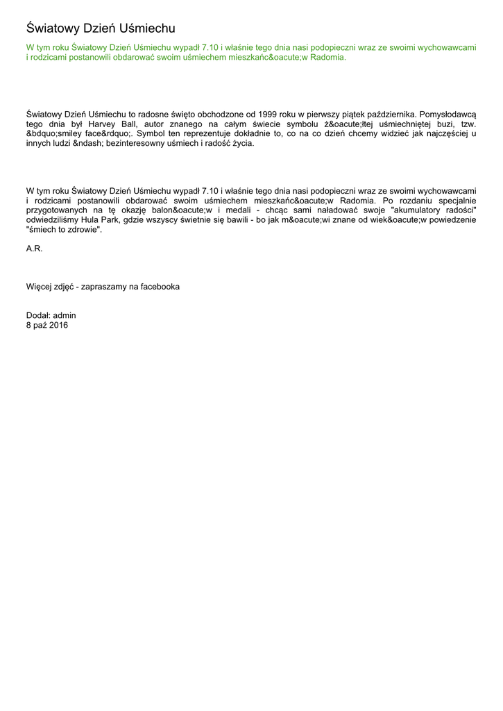 Światowy Dzień Uśmiechu W tym roku Światowy Dzień Uśmiechu wypadł 7.10 i właśnie tego dnia nasi podopieczni wraz ze swoimi wychowawcami i rodzicami postanowili obdarować swoim uśmiechem mieszkańców Radomia. Światowy Dzień Uśmiechu to radosne święto obchodzone od 1999 roku w pierwszy piątek października. Pomysłodawcą tego dnia był Harvey Ball, autor znanego na całym świecie symbolu żółtej uśmiechniętej buzi, tzw. „smiley face”. Symbol ten reprezentuje dokładnie to, co na co dzień chcemy widzieć jak najczęściej u innych ludzi – bezinteresowny uśmiech i radość życia. W tym roku Światowy Dzień Uśmiechu wypadł 7.10 i właśnie tego dnia nasi podopieczni wraz ze swoimi wychowawcami i rodzicami postanowili obdarować swoim uśmiechem mieszkańców Radomia. Po rozdaniu specjalnie przygotowanych na tę okazję balonów i medali - chcąc sami naładować swoje "akumulatory radości" odwiedziliśmy Hula Park, gdzie wszyscy świetnie się bawili - bo jak mówi znane od wieków powiedzenie "śmiech to zdrowie". A.R. Więcej zdjęć - zapraszamy na facebooka Dodał: admin 8 paź 2016