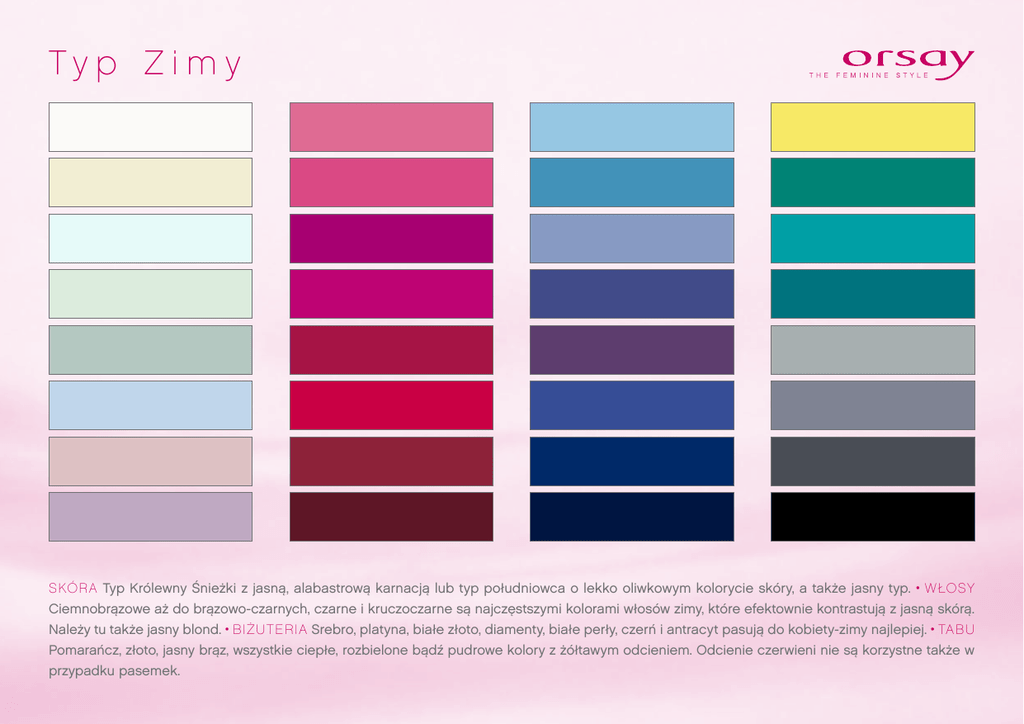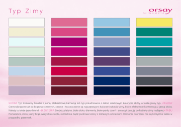 Ty p Z i m y SKÓRA Typ Królewny Śnieżki z jasną, alabastrową karnacją lub typ południowca o lekko oliwkowym kolorycie skóry, a także jasny typ. • WŁOSY Ciemnobrązowe aż do brązowo-czarnych, czarne i kruczoczarne są najczęstszymi kolorami włosów zimy, które efektownie kontrastują z jasną skórą. Należy tu także jasny blond. • B I Ż U T E R I A Srebro, platyna, białe złoto, diamenty, białe perły, czerń i antracyt pasują do kobiety-zimy najlepiej. • TaBU Pomarańcz, złoto, jasny brąz, wszystkie ciepłe, rozbielone bądź pudrowe kolory z żółtawym odcieniem. Odcienie czerwieni nie są korzystne także w przypadku pasemek.