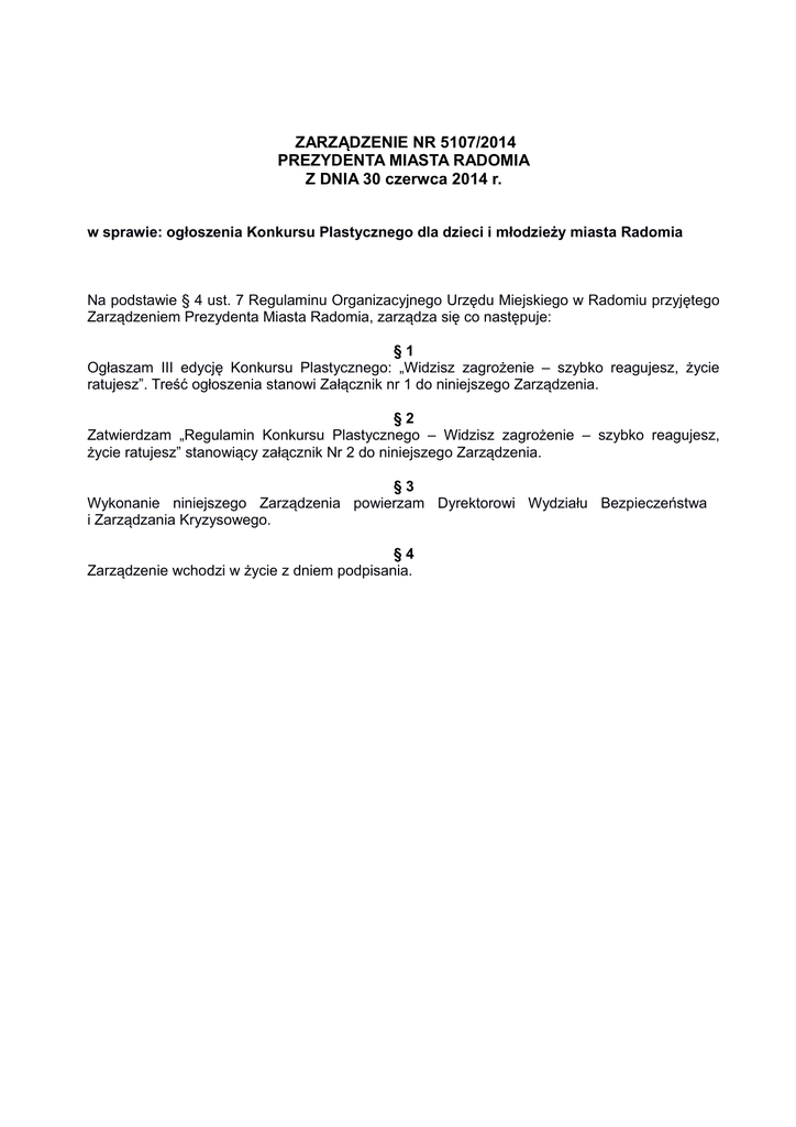 ZARZĄDZENIE NR 5107/2014 PREZYDENTA MIASTA RADOMIA Z DNIA 30 czerwca 2014 r. w sprawie: ogłoszenia Konkursu Plastycznego dla dzieci i młodzieży miasta Radomia Na podstawie § 4 ust. 7 Regulaminu Organizacyjnego Urzędu Miejskiego w Radomiu przyjętego Zarządzeniem Prezydenta Miasta Radomia, zarządza się co następuje: §1 Ogłaszam III edycję Konkursu Plastycznego: „Widzisz zagrożenie – szybko reagujesz, życie ratujesz”. Treść ogłoszenia stanowi Załącznik nr 1 do niniejszego Zarządzenia. §2 Zatwierdzam „Regulamin Konkursu Plastycznego – Widzisz zagrożenie – szybko reagujesz, życie ratujesz” stanowiący załącznik Nr 2 do niniejszego Zarządzenia. §3 Wykonanie niniejszego Zarządzenia powierzam Dyrektorowi Wydziału Bezpieczeństwa i Zarządzania Kryzysowego. §4 Zarządzenie wchodzi w życie z dniem podpisania. Załącznik nr 1 do Zarządzenia Nr 5107/2014 Prezydenta Miasta Radomia z dnia 30 czerwca 2014 r. PREZYDENT MIASTA RADOMIA ogłasza III EDYCJĘ KONKURSU PLASTYCZNEGO DLA DZIECI I MŁODZIEŻY MIASTA RADOMIA „WIDZISZ ZAGROŻENIE – SZYBKO REAGUJESZ, ŻYCIE RATUJESZ” W Konkursie mogą uczestniczyć uczniowie szkół podstawowych i gimnazjów w wieku 5 – 16 lat oraz uczniowie szkół specjalnych - bez ograniczeń wiekowych. Regulamin Konkursu dostępny jest w siedzibie Wydziału Bezpieczeństwa i Zarządzania Kryzysowego, ul. Reja 5, 26 - 600 Radom lub na stronie internetowej Urzędu Miejskiego WBiZK. Uczestnicy Konkursu do dnia 14 października br. mogą nadsyłać prace dotyczące szeroko rozumianego zachowania bezpieczeństwa i udzielania pomocy w momencie wystąpienia zagrożenia. Zgłoszenia do konkursu, zawierające prace konkursowe, należy dostarczyć osobiście lub pocztą na adres: Urząd Miejski w Radomiu – Wydział Bezpieczeństwa i Zarządzania Kryzysowego, ul. Reja 5, 26 – 600 Radom z dopiskiem „Konkurs plastyczny”. Prezydent Miasta Radomia zastrzega sobie prawo unieważnienia konkursu bez podania przyczyny. Załącznik nr 2 do Zarządzenia Nr 5107/2014 Prezydenta Miasta Radomia z dnia 30 czerwca 2014 r. REGULAMIN III Edycji Konkursu Plastycznego dla dzieci i młodzieży miasta Radomia pod hasłem: „Widzisz zagrożenie – szybko reagujesz, życie ratujesz” Organizatorzy Organizatorem konkursu jest Wydział Bezpieczeństwa i Zarządzania Kryzysowego UM. Cele konkursu Celem konkursu jest edukacja dzieci i młodzieży w zakresie zachowania bezpieczeństwa w momencie wystąpienia wszelkiego typu zagrożeń. Zadaniem konkursu jest wyrobienie skutecznych sposobów reakcji w czasie różnego rodzaju zagrożeń, takich jak: wypadki - na drodze, w domu czy nad wodą, pożary (wypalanie traw) powodzie, katastrofy ekologiczne i budowlane. Konkurs ma kształtować właściwe zachowania dzieci i młodzieży w obliczu zagrożenia, udzielanie pierwszej pomocy, uświadamiać – jak postępować w momencie jego zaistnienia i gdzie szukać pomocy. Konkurs adresowany jest do uczniów szkół podstawowych i gimnazjów w wieku od 5 do 16 lat oraz uczniów szkół specjalnych bez ograniczeń wiekowych. Uczestnicy konkursu podzielenie zostali na następujące grupy: I grupa - grupa młodsza – szkoła podstawowa klasy 0-III; II grupa - grupa średnia: szkoła podstawowa- klasy IV-VI; III grupa - grupa starsza: gimnazjaliści; IV grupa - uczniowie szkół specjalnych. Termin nadsyłania prac Prace należy przesłać lub dostarczyć osobiście do Wydziału Bezpieczeństwa i Zarządzania Kryzysowego UM, Radom, ul. Reja 5, w terminie do 14 października br. do godz. 15.00 wraz z wymaganymi oświadczeniami i zgodą opiekuna prawnego (rodzica) – załącznik do regulaminu. O wynikach eliminacji poinformowani zostaną opiekunowie lub nauczyciele. Autorzy wyróżnionych prac zostaną nagrodzeni podczas uroczystego spotkania w listopadzie br. (o terminie powiadomi Wydział BiZK). Komitet organizacyjny Na szczeblu miasta Radomia eliminacjami kieruje komitet organizacyjny złożony z pracowników Wydziału Bezpieczeństwa i Zarządzania Kryzysowego Urzędu Miejskiego. Do jego zadań należy w szczególności: ogłoszenie konkursu w szkołach i ośrodkach w mieście Radomiu, zapewnienie środków materialnych i rzeczowych do zorganizowania i przeprowadzenia eliminacji, podanie postanowień regulaminu do wiadomości zainteresowanych, powołanie jury, wyłonienie finalistów, sporządzenie protokółu z prac komisji konkursowej, ogłoszenie wyników w środkach masowego przekazu, Internecie. Jury Jury powoływane jest przez komitet organizacyjny. W jego skład wchodzą Pani Agnieszka Sieradzka Kierownik Galerii w Radomskim Klubie Środowisk Twórczych i Galeria „ŁAŹNIA”, przedstawiciele: Straży Pożarnej, Policji, Wydziału Bezpieczeństwa i Zarządzania Kryzysowego. Jury wybiera spośród siebie przewodniczącego oraz sekretarza. Zadaniem jury jest: ocena (jawna) prac pod względem zgodności z tematyką konkursu oraz pod kątem plastycznym, ustalenie wyników eliminacji, sporządzenie protokołu zawierającego wyniki eliminacji według kolejności miejsc w danych grupach, poinformowanie opiekunów lub nauczycieli o wynikach eliminacji, Orzeczenia Jury są ostateczne. Technika wykonania prac Dopuszczalna technika wykonania prac do wyboru: rysunek, grafika, malarstwo. Format prac – nie większy niż A-2. Popularyzacja Organizatorzy nie przewidują zwrotu prac finałowych. Pozostałe prace można będzie odebrać po zakończeniu konkursu w siedzibie Wydziału do dnia 30 listopada br. Wybrane prace finałowe będą eksponowane na uroczystościach finałowych, jak również zamieszczone na stronie internetowej www.radom.pl. Wydział Bezpieczeństwa i Zarządzania Kryzysowego UM w Radomiu zastrzega sobie prawo do wykorzystania nadesłanych prac do projektowania materiałów popularyzatorskich i promocyjnych. Opis pracy według wzoru – proszę o wypełnienie drukowanymi literami: III EDYCJA Konkurs Plastyczny dla dzieci i młodzieży miasta Rad