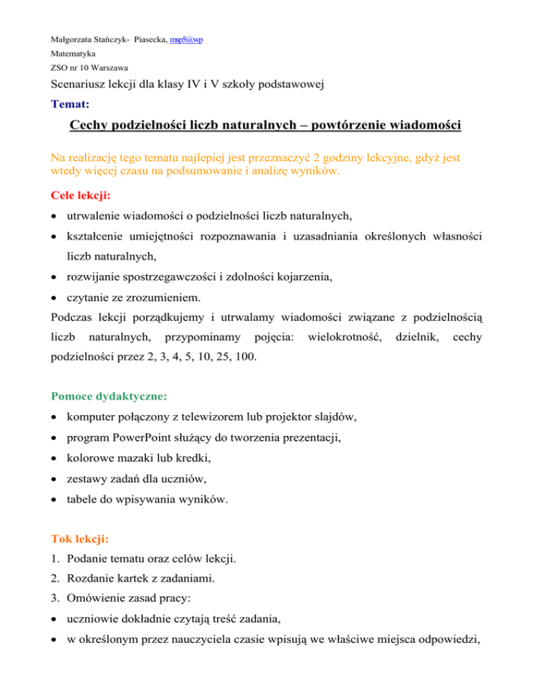 Małgorzata Stańczyk- Piasecka, msp5@wp Matematyka ZSO nr 10 Warszawa Scenariusz lekcji dla klasy IV i V szkoły podstawowej Temat: Cechy podzielności liczb naturalnych – powtórzenie wiadomości Na realizację tego tematu najlepiej jest przeznaczyć 2 godziny lekcyjne, gdyż jest wtedy więcej czasu na podsumowanie i analizę wyników. Cele lekcji: • utrwalenie wiadomości o podzielności liczb naturalnych, • kształcenie umiejętności rozpoznawania i uzasadniania określonych własności liczb naturalnych, • rozwijanie spostrzegawczości i zdolności kojarzenia, • czytanie ze zrozumieniem. Podczas lekcji porządkujemy i utrwalamy wiadomości związane z podzielnością liczb naturalnych, przypominamy pojęcia: wielokrotność, dzielnik, cechy podzielności przez 2, 3, 4, 5, 10, 25, 100. Pomoce dydaktyczne: • komputer połączony z telewizorem lub projektor slajdów, • program PowerPoint służący do tworzenia prezentacji, • kolorowe mazaki lub kredki, • zestawy zadań dla uczniów, • tabele do wpisywania wyników. Tok lekcji: 1. Podanie tematu oraz celów lekcji. 2. Rozdanie kartek z zadaniami. 3. Omówienie zasad pracy: • uczniowie dokładnie czytają treść zadania, • w określonym przez nauczyciela czasie wpisują we właściwe miejsca odpowiedzi, • porównanie wyników z odpowiedzią, którą nauczyciel pokazuje na ekranie i zapisanie właściwej ilości punktów, • utrwalenie definicji, która pojawia się na ekranie monitora. 4. Analiza wyników i podsumowanie. Uwagi końcowe: Wykorzystanie komputera, kolorowych obrazów, ruchu i dźwięku powoduje, że uczniowie są bardziej zaangażowani, a lekcja jest dla nich ciekawsza niż prowadzona metodami tradycyjnymi. Nauczyciel w czasie lekcji może zaobserwować, którzy uczniowie pracują szybko a którzy mają trudności. Uczeń sumując zdobyte przez siebie punkty dokonuje samooceny i jest w stanie stwierdzić, czy właściwie przygotował się do sprawdzianu. Na zakończenie lekcji nauczyciel ocenia uczniów, którzy zdobyli największą liczbę punktów. Jeśli pracujemy z klasą słabą, ilość zadań można zmniejszyć i wybrać te na których nam najbardziej zależy. Lekcję tą można przeprowadzić również w klasie V jako przypomnienie wiadomości. Opracowała mgr inż. Małgorzata Stańczyk Piasecka