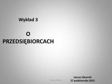 Wykład 3 O PRZEDSIĘBIORCACH Janusz Olearnik Janusz Olearnik 27 października 2015 Przedsiębiorca Osoba decydująca się na poszukiwanie zysku wiążące się z niepewnością Odważny poszukiwacz, ryzykant Janusz Olearnik Przedsiębiorca Podejmujący decyzje Decydent, stanowczy, ktoś, czyje zdanie rozstrzyga ostatecznie jeśli jest kilku decydentów Janusz Olearnik Przedsiębiorca Dokonujący zmian Poszukiwacz zmian, realizator zmian, beneficjent zmian Janusz Olearnik Przedsiębiorca Podejmujący zobowiązania w imieniu firmy Odpowiedzialny, zdecydowany Janusz Olearnik Przedsiębiorca Finansujący przedsięwzięcie, zapewniający kapitał Zasobny lub potrafiący przekonać banki lub inwestorów Janusz Olearnik Przedsiębiorca Menedżer lub nadzorujący Planista, organizator, kontroler Janusz Olearnik Przedsiębiorca Organizujący i koordynujący wykorzystanie zasobów Rozważny menedżer i gospodarz Janusz Olearnik Przedsiębiorca Właściciel przedsiębiorstwa Pan i władca Janusz Olearnik Przedsiębiorca wg prawa polskiego Osoba fizyczna lub osoba prawna która zawodowo i we własnym imieniu wykonuje działalność gospodarczą Janusz Olearnik ZMYSŁ PRZEDSIĘBIORCZOŚCI Janusz Olearnik JAKIE CECHY TWORZĄ ZMYSŁ PRZEDSIĘBIORCZOŚCI? Janusz Olearnik Jakie cechy tworzą „zmysł przedsiębiorczości”? (1) wg M.Bratnickiego i T.Kraśnickiej Wiara we własne siły • Zaufanie do własnych możliwości • Optymizm • Entuzjazm Janusz Olearnik Jakie cechy tworzą „zmysł przedsiębiorczości”? (2) wg M.Bratnickiego i T.Kraśnickiej Orientacja na zadania • • • • • • • Potrzeba osiągnięć Wytrwałość Upór Determinacja Energia Konsekwencja Orientacja na zysk Janusz Olearnik Jakie cechy tworzą „zmysł przedsiębiorczości”? (3) wg M.Bratnickiego i T.Kraśnickiej Podejmowanie ryzyka • Zdolność do podejmowania ryzyka • Umiejętność i chęć podejmowania wyzwań • Odwaga i rozwaga Janusz Olearnik Jakie cechy tworzą „zmysł przedsiębiorczości”? (4) wg M.Bratnickiego i T.Kraśnickiej Przywództwo • • • • • • Zachowania przywódcze Autorytet Niezależność Indywidualizm Dobra współpraca z ludźmi Odpowiadanie na sugestie i krytykę Janusz Olearnik Jakie cechy tworzą „zmysł przedsiębiorczości”? (5) wg M.Bratnickiego i T.Kraśnickiej Innowacyjność • • • • • Inwencja Kreatywność „Otwarty umysł” Wszechstronność Dążenie do „bycia dobrze poinformowanym” Janusz Olearnik Jakie cechy tworzą „zmysł przedsiębiorczości”? (6) wg M.Bratnickiego i T.Kraśnickiej Zorientowanie na przyszłość • Umiejętność obserwowania uwarunkowań • Zdolność przewidywania Janusz Olearnik O naturze przedsiębiorcy czyli nauczmy się polować Hunting or fishing? Janusz Olearnik O naturze przedsiębiorcy czyli orientacja na sukces PRZEDSIĘBIORCA TO DRAPIEŻNIK, ZWYCIĘZCA, CZŁOWIEK SUKCESU • In America we celebrate success, we don't apologise for success. Mitt Romney w przemówieniu na konwencji wyborczej partii republikańskiej, wrzesień 2012 Janusz Olearnik OSOBOWOŚĆ PRZEDSIĘBIORCY cechy warunkujące sukces w biznesie Z badań B.Ujda-Dyńka • Otwartość na zmiany • Skłonność do ryzyka • Zaangażowanie w podejmowane działania • • • • Konsekwencja Uczciwość Wysoka inteligencja Bycie wymagającym • Optymizm • Rozwaga • Wysoki poziom energii życiowej • Dokładność Janusz Olearnik PRZEDSIĘBIORCA – główne cechy wg Leszka Czarneckiego kreatywny, otwarty na innowacje zdolny do nawiązywania i rozwijania kontaktów z ludźmi przywódca, ma zdolność zarażania swoimi pomysłami oraz przyciągania ludzi do ich realizacji sprzedawca zna i rozumie swój biznes Janusz Olearnik Przedsiębiorca jest kreatywny, otwarty na innowacje 1. Kreatywność opiera się na stałym niepokoju twórczym, trzeba go mieć jako cechę wrodzoną. 2. Kreatywność opiera się na otwartości na innowacje. 3. Kreatywność to zdolność generowania własnych innowacji Janusz Olearnik Przedsiębiorca jest zdolny do nawiązywania i rozwijania kontaktów z ludźmi 1. Umiejętność nawiązywania kontaktów międzyludzkich; 2. Empatia; 3. Zdolność wczuwania się w nastroje i potrzeby innych ludzi. 4. Budowanie firmy warto zaczynać od najbliższego otoczenia – znajomych, przyjaciół, rodziny. Biznes robi się zJanusz ludźmi, dla ludzi i dzięki ludziom. Olearnik L. Czarnecki Przedsiębiorca jest przywódcą, ma zdolność zarażania ludzi swoimi pomysłami i przyciągania do ich realizacji. 1. Naturalny autorytet; 2. Zdolność przyciągnięcia grupy dobrych osób chcących pracować z nami i dla nas. 3. Bardziej skuteczna jest postawa typu „trener” niż twardy „boss”. Jack Welch (1935), prezes GE jako przykład skutecznego lidera: Firmą trzeba zarządzać tak, jakby miała za rok zbankrutować. Janusz Olearnik Wszystkie ręce na pokład, myślmy i działajmy natychmiast . Przedsiębiorca jest sprzedawcą – w szerokim znaczeniu 1. Sprzedaje się usługi, towary, swoją wiedzę, bez względu na to w jakiej branży prowadzi działalność. 2. Adresatem sprzedawanych dóbr są zawsze inne osoby, toteż kontakt z ludźmi jest stałą cechą działalności przedsiębiorcy. Janusz Olearnik Przedsiębiorca zna i rozumie swój biznes 1. Potrafi zidentyfikować potrzeby rynkowe; 2. Umie wymyślić produkt, który będzie się sprzedawał. 3. Rozumie zagrożenia podejmowanego biznesu; 4. Zna konkurencję; 5. Wie jakich ludzi potrzebuje; 6. Ma wizję kierunku ewolucji rynku; Janusz Olearnik Filozofia przedsiębiorcy a filozofia sportowca Poniżej przedstawiam 7 cech „pracy” sportowca, przygotowań i rywalizacji sportowej. Każda z tych cech może być odniesiona także do pracy i postawy przedsiębiorcy. Janusz Olearnik Filozofia przedsiębiorcy a filozofia sportowca 1/7 Lata treningu budują świadomość i wiarę w zwycięstwo w kolejnych zawodach sportowych. Janusz Olearnik Filozofia przedsi