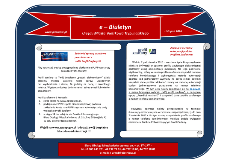 e – Biuletyn www.piotrkow.pl Urzędu Miasta Piotrkowa Trybunalskiego Załatwiaj sprawy urzędowe przez Internet załóż Profil Zaufany !!! Aby korzystać z usług dostępnych na platformie ePUAP wystarczy posiadać Profil Zaufany. Profil zaufany to Twój bezpłatny „podpis elektroniczny” dzięki któremu możesz załatwić wiele spraw urzędowych bez wychodzenia z domu, 24 godziny na dobę, z dowolnego miejsca. Wystarczy dostęp do Internetu i adres e-mail lub telefon komórkowy. Profil zaufany w 3 krokach: 1. załóż konto na www.epuap.gov.pl, 2. podaj numer PESEL (pole nieobowiązkowe) podczas zakładania konta na ePUAP a system automatycznie złoży wniosek o Profil Zaufany, 3. w ciągu 14 dni udaj się do Punktu Informacyjnego Biura Obsługi Mieszkańców na ul. Szkolnej 28 (wejście A) w celu potwierdzenia danych. Listopad 2016 Zmiana w metodzie autoryzacji podpisu Profilem Zaufanym: W dniu 7 października 2016 r. weszło w życie Rozporządzanie Ministra Cyfryzacji w sprawie profilu zaufanego elektronicznej platformy usług administracji publicznej. Na jego podstawie użytkownicy, którzy w swoim profilu zaufanym nie podali numeru telefonu komórkowego i wykorzystują metodę autoryzacji poprzez kod jednorazowy wysyłany na adres e-mail powinni uzupełnić dane profilu i dokonać zmiany na metodę autoryzacji kodem jednorazowym przesłanym na numer telefonu komórkowego. W tym celu należy zalogować się na pz.gov.pl, z menu bocznego wybrać: „Mój profil zaufany”, a następnie opcję: „Przedłuż ważność” i uzupełnić dane profilu zaufanego o numer telefonu komórkowego. Powyższą operację należy przeprowadzić w terminie 6 miesięcy od daty wejścia w życie ww. rozporządzenia, tj. do dnia 7 kwietnia 2017 r. Po tym czasie, uzupełnienie profilu zaufanego o numer telefonu komórkowego, możliwe będzie wyłącznie osobiście w Punkcie Potwierdzającym Profil Zaufany. Wejdź na www.epuap.gov.pl i zdobądź swój bezpłatny klucz do e-administracji !!! Biuro Obsługi Mieszkańców czynne: pn. – pt. 800-1700 · tel.: 0 800 241 251, 44 732 77 01, 44 732 18 00, 44 732 18 01 e-mail: [email protected]