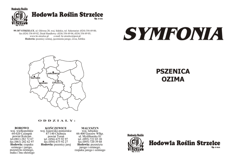 Hodowla Roœlin Strzelce Sp. z o.o. 99-307 STRZELCE, ul. G³ówna 20, woj. ³ódzkie, tel. Sekretariat: (024) 356 69 00; fax (024) 356 69 02, Dzia³ Handlowy: (024) 356 69 04, (024) 356 69 05; www.hr-strzelce.pl e-mail: [email protected] Hodowla: pszenicy ozimej, jêczmienia jarego, owsa, bobiku PSZENICA OZIMA KOÑCZEWICE MA£YSZYN BOROWO SYMFONIA STRZELCE O D D Z I A £ Y: BOROWO woj. wielkopolskie 64-020 Czempiñ powiat Koœcian tel.(061) 282 72 67 fax (061) 282 62 97 Hodowla: rzepaku ozimego i jarego, pszen¿yta ozimego, maku i lnu oleistego KOÑCZEWICE woj. kujawsko-pomorskie 87-140 Che³m¿a powiat Toruñ tel. (056) 675 92 97 fax (056) 675 92 27 Hodowla: pszenicy jarej MA£YSZYN woj. lubuskie 66-400 Gorzów Wlkp. ul. Myœliborska 81 tel. (095) 722 85 20 fax (095) 720 39 68 Hodowla: pszen¿yta jarego i ozimego, rzepaku jarego i ozimego Hodowla Roœlin Strzelce Sp. z o.o. Mniejsz¹ iloœæ wysiewu stosujemy na glebach dobrych i po dobrych przedplonach, przy optymalnym terminie siewu i intensywnym nawo¿eniu azotem. Wy¿sz¹ iloœæ stosujemy na s³abszych glebach i po gorszych przedplonach oraz przy opóŸnionym terminie siewu. Pszenica ozima SYMFONIA Wyhodowana w Strzelcach w 1999 roku. Charakterystyka odmiany 1. K³os cylindryczny, ziarno czerwone o masie 1000 ziaren oko³o 45 g. Jest jedn¹ z najbardziej odpornych odmian na porastanie o i osypywanie (8 w skali 9 ) 2. •dŸb³o oko³o 90 cm. Nale¿y do najni¿szych odmian, co stanowi o wysokiej odpornoœci na wyleganie. 3. Odporna na m¹czniaka, rdzê ŸdŸb³ow¹, septoriê liœci i plew oraz choroby podstawy ŸdŸb³a. 4. Zimotrwa³oœæ bardzo dobra (6,5 w skali 9o). 5. Zalecana do uprawy na terenie ca³ego kraju. wzorzec dt/ha Symfonia I 63,3 Ia 74,4 3 6 1995 - 1997 Rejon II III IV 71,2 71,4 64,1 V 64,4 VI 68,3 VII 51,7 VIII 63,5 3,2 3,6 5 1,1 -1,8 3,5 4,9 Ziarno siewne winno byæ zaprawione jedn¹ z zapraw nasiennych np.: Baytan Uniwersal 19,5, Oxafun 500 FS, Maxim 025 FS, Vincit 050 FS, Beret 050 FS, Raxil, Dicvidand 030 FS itp. Nawo¿enie mineralne Odmiana dobrze wykorzystuje wysokie dawki azotu. Nawo¿enie azotowe zale¿y od zawartoœci N w glebie, kompleksu glebowego i spodziewanego plonu i wynosi 80 - 150 kgN/ha. Najlepiej stosowaæ w trzech terminach: Plon ziarna w rejonach (odchylenia od wzorca) wg COBORU Odmiana 3. I. w okresie ruszenia wegetacji, II. w fazie strzelania w ŸdŸb³o, III. na pocz¹tku fazy k³oszenia lub zaraz po k³oszeniu. Wysokoœæ nawo¿enia fosforowo-potasowego uzale¿niona jest od zawartoœci sk³adników przyswajalnych w glebie oraz kompleksu glebowego i powinna wynosiæ: P2O5 40 - 100 kg/ha, K2O 40 - 120 kg/ha. Wzorzec- wszystkie odmiany badane w danym roku. Ochrona roœlin Wymagania glebowe Stosowane herbicydy: Jesieñ: Dicuran 80 WP, Racer 25 EC, Quartz Super 550 SC, Puma Super, Cougar 600, Stomp 330 CE, Maraton 375 SC Wiosna: Chwastox Extra D, DF, F, M, Trio 540 SL, Turbo 340 SL, Starane 250 EC, Granstar 75 WG, Chisel 75 WG, Dicuran 80 WP I Grogyl 75 WG. Odmiana przystosowana do intensywnych warunków uprawy. Bardzo dobrze i dobrze plonuje na glebach wszystkich kompleksów pszennych i ¿ytnich bardzo dobrych i dobrych. Najlepszymi przedplonami s¹: rzepak ozimy, roœliny motylkowe i str¹czkowe oraz wczesne ziemniaki. Siew 1. 2. Odmiana wymaga siewu w terminie optymalnym dla poszczególnych rejonów. 2 Iloœæ wysiewu wynosi: 400 - 500 - ziaren/m (190 - 240 kg/ha). Jeœli zachodzi koniecznoœæ zwalczania chorób grzybowych liœci i k³osa, to zastosowaæ zabieg œrodkami: Tilt CB I Premium, Bayleton 25, Siarkol, Impact Super, Sportak, Amistar 250 SC, Alert, Tango. W razie wyst¹pienia mszyc i skrzypionki nale¿y zastosowaæ: Decis 2,5 EC, Fastac 10 EC, Sumi Alfa 050 EC, Karate 025 EC,