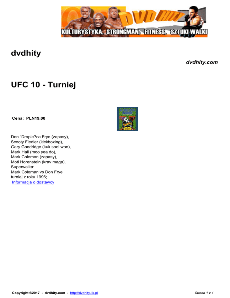 dvdhity dvdhity.com UFC 10 - Turniej Cena: PLN19.00 Don “Drapie?ca Frye (zapasy), Scooty Fiedler (kickboxing), Gary Goodridge (kuk sool won), Mark Hall (moo yea do), Mark Coleman (zapasy), Moti Horenstein (krav maga), Superwalka: Mark Coleman vs Don Frye turniej z roku 1996; Informacja o dostawcy Copyright ©2017 - dvdhity.com - http://dvdhity.llk.pl Strona 1 z 1