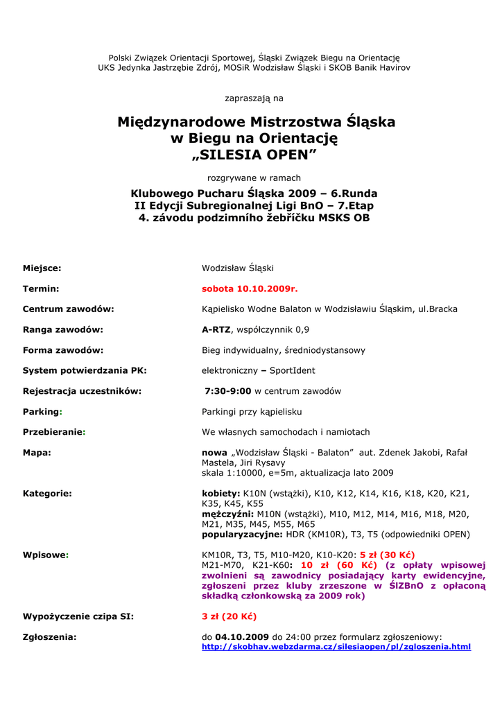 Polski Związek Orientacji Sportowej, Śląski Związek Biegu na Orientację UKS Jedynka Jastrzębie Zdrój, MOSiR Wodzisław Śląski i SKOB Banik Havirov zapraszają na Międzynarodowe Mistrzostwa Śląska w Biegu na Orientację „SILESIA OPEN” rozgrywane w ramach Klubowego Pucharu Śląska 2009 – 6.Runda II Edycji Subregionalnej Ligi BnO – 7.Etap 4. závodu podzimního žebříčku MSKS OB Miejsce: Wodzisław Śląski Termin: sobota 10.10.2009r. Centrum zawodów: Kąpielisko Wodne Balaton w Wodzisławiu Śląskim, ul.Bracka Ranga zawodów: A-RTZ, współczynnik 0,9 Forma zawodów: Bieg indywidualny, średniodystansowy System potwierdzania PK: elektroniczny – SportIdent Rejestracja uczestników: 7:30-9:00 w centrum zawodów Parking: Parkingi przy kąpielisku Przebieranie: We własnych samochodach i namiotach Mapa: nowa „Wodzisław Śląski - Balaton” aut. Zdenek Jakobi, Rafał Mastela, Jiri Rysavy skala 1:10000, e=5m, aktualizacja lato 2009 Kategorie: kobiety: K10N (wstążki), K10, K12, K14, K16, K18, K20, K21, K35, K45, K55 mężczyźni: M10N (wstążki), M10, M12, M14, M16, M18, M20, M21, M35, M45, M55, M65 popularyzacyjne: HDR (KM10R), T3, T5 (odpowiedniki OPEN) Wpisowe: KM10R, T3, T5, M10-M20, K10-K20: 5 zł (30 Kć) M21-M70, K21-K60: 10 zł (60 Kć) (z opłaty wpisowej zwolnieni są zawodnicy posiadający karty ewidencyjne, zgłoszeni przez kluby zrzeszone w ŚlZBnO z opłaconą składką członkowską za 2009 rok) Wypożyczenie czipa SI: 3 zł (20 Kć) Zgłoszenia: do 04.10.2009 do 24:00 przez formularz zgłoszeniowy: http://skobhav.webzdarma.cz/silesiaopen/pl/zgloszenia.html Start pierwszego zawodnika: 10:30 Zakończenie: ok. 13:30 Nagrody: - medale za miejsca I-III we wszystkich kategoriach oprócz KM10R, K-OPEN, M-OPEN - dyplomy dla wszystkich rodzin w kategorii KM10R, indywidualnie za miejsca I-VI w kategoriach KM10, KM10N i KM12, za miejsca I-III w pozostałych kategoriach Świadczenia dla uczestników: woda lub inny napój, mapa, pomoc medyczna Informacje: Rafał Mastela tel +48 668-046-915 http://skobhav.webzdarma.cz/silesiaopen/pl/ Pomoc medyczna: na mecie Uwagi: 1. Zakaz chodzenia po terenie zawodów w dniu zawodówdotyczy startujących zawodników i opiekunów. 2. Mapy po przybiegnięciu na metę zostają u sędziów – po zawodach odbierają kierownicy ekip. 3. Organizator dopuszcza możliwość łączenia kategorii, w przypadku zgłoszenia w danej kategorii mniej niż 3 uczestników. 4. Kategorie są oznaczone w języku polskim i czeskim polskie K to czeskie D (kobiety), natomiast M to H np. K21 to D21. Kategorie T3 i T5 są dla początkujących (odpowiedniki polskich OPEN) – różnią się długością. T3 ma ok.3km, natomiast T5 ok.5km. 5. Uczestnicy niepełnoletni startujący indywidualnie lub reprezentujący szkoły muszą być pod opieką opiekuna i posiadać zgodę rodziców na udział w zawodach wraz z oświadczeniem o dobrym stanie zdrowia. Zawodnicy z klubów muszą posiadać ważne badania lekarskie – odpowiadają kierownicy ekip. 6. Uczestnicy ubezpieczają się od NNW we własnym zakresie – odpowiadają kierownicy ekip. 7. Obowiązują zasady FAIR-PLAY (dotyczy w szczególności przekazywania informacji przez przybiegających na metę). 6 Pozostałe informacje i ewentualne zmiany podane będą w komunikacie technicznym dostępnym od dnia 7.10.2009r. na stronie http://skobhav.webzdarma.cz/silesiaopen/pl/ Obsługa zawodów: - kierownik zawodów: Rafał Mastela sekretarz zawodów: Tomas Sochor sędzia główny: Zdenek Jakobi budowniczy tras: Zdenek Juracka obsługa SI: Milan Bincik kierownik startu: Katarzyna Androsz kierownik mety: Aleksander Mencel