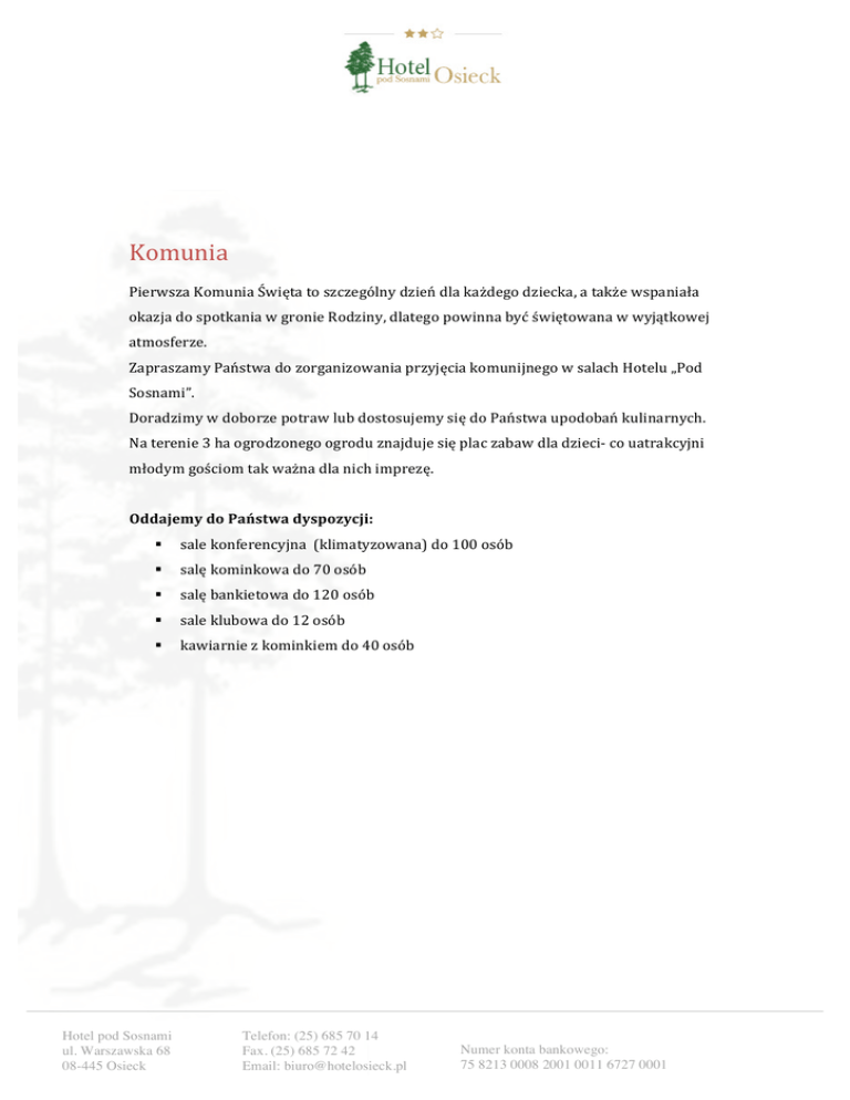 Komunia PierwszaKomuniaŚwiętatoszczególnydzieńdlakażdegodziecka,atakżewspaniała okazjadospotkaniawgronieRodziny,dlategopowinnabyćświętowanawwyjątkowej atmosferze. ZapraszamyPaństwadozorganizowaniaprzyjęciakomunijnegowsalachHotelu„Pod Sosnami”. DoradzimywdoborzepotrawlubdostosujemysiędoPaństwaupodobańkulinarnych. Naterenie3haogrodzonegoogroduznajdujesięplaczabawdladzieci-couatrakcyjni młodymgościomtakważnadlanichimprezę. OddajemydoPaństwadyspozycji: ! salekonferencyjna(klimatyzowana)do100osób ! salękominkowado70osób ! salębankietowado120osób ! saleklubowado12osób ! kawiarniezkominkiemdo40osób Hotel pod Sosnami 68 ul. Warszawska 08-445 Osieck Telefon: (25) 685 70 14 Fax. (25) 685 72 42 Email: [email protected] Numer konta bankowego: 75 8213 0008 2001 0011 6727 0001