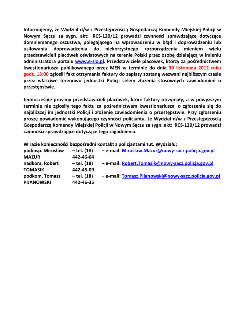 Informujemy, że Wydział d/w z Przestępczością Gospodarczą Komendy Miejskiej Policji w Nowym Sączu za sygn. akt: RCS-120/12 prowadzi czynności sprawdzające dotyczące domniemanego oszustwa, polegającego na wprowadzeniu w błąd i doprowadzeniu lub usiłowaniu doprowadzenia do niekorzystnego rozporządzenia mieniem wielu przedstawicieli placówek oświatowych na terenie Polski przez osobę działającą w imieniu administratora portalu www.e-sio.pl. Przedstawiciele placówek, którzy za pośrednictwem kwestionariusza publikowanego przez MEN w terminie do dnia 30 listopada 2012 roku godz. 13:00 zgłosili fakt otrzymania faktury do zapłaty zostaną wezwani najbliższym czasie przez właściwe terenowo jednostki Policji celem złożenia stosownych zawiadomień o przestępstwie. Jednocześnie prosimy przedstawicieli placówek, które faktury otrzymały, a w powyższym terminie nie zgłosiły tego faktu za pośrednictwem kwestionariusza o zgłoszenie się do najbliższej im jednostki Policji i złożenie zawiadomienia o przestępstwie. Przy zgłoszeniu proszę powiadomić wykonującego czynności policjanta, że Wydział d/w z Przestępczością Gospodarczą Komendy Miejskiej Policji w Nowym Sączu za sygn. akt: RCS-120/12 prowadzi czynności sprawdzające dotyczące tego zagadnienia. W razie konieczności bezpośredni kontakt z policjantami tut. Wydziału; podinsp. Mirosław – tel. (18) – e-mail: [email protected] MAZUR 442-46-64 nadkom. Robert – tel. (18) – e-mail: [email protected] TOMASIK 442-45-09 podkom. Tomasz – tel. (18) – e-mail: [email protected] PIJANOWSKI 442-46-35