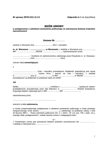 Nr sprawy ZS79/321/2/12 Załącznik nr 1 do Specyfikacji WZÓR UMOWY w postępowaniu o udzielenie zamówienia publicznego na sukcesywną dostawę artykułów żywnościowych Umowa Nr ………….… zawarta w Warszawie dnia …………………………….. 2012 r. pomiędzy: m. st. Warszawa - ……………………. w Warszawie, z siedzibą w Warszawie przy ………………….., NIP: …………………………….., REGON: ……………………………….., reprezentowanym przez: …………………………… – Dyrektora (nr pełnomocnictwa udzielonego przez Prezydenta m. st. Warszawy: …………………………… z dnia ………………………………………….. roku), zwanym dalej zamawiającym, a ………………………………………… (imię i nazwisko) prowadzącym działalność gospodarczą pod nazwą ………………………………………… (nazwa firmy i jeszcze raz imię i nazwisko), z siedzibą w …………………………. przy ul. ………………………., nr NIP: …………………………, nr REGON: ……………….. , prowadzącym/-cą działalność na podstawie wpisu do CEIDG lub Spółką ………………………………………………….. , z siedzibą w …………………………….. , wpisaną do rejestru przedsiębiorców prowadzonego przez Sąd Rejonowy w ………………… , …… Wydział Gospodarczy Krajowego Rejestru Sądowego pod nr KRS: ……………….. , NIP: ………………………….. , reprezentowaną przez: …………………………………. - ………………………………….. , zwanym/-ą dalej wykonawcą, w wyniku przeprowadzonego postępowania o udzielenie zamówienia publicznego w trybie przetargu nieograniczonego (znak sprawy: …………………………………), udzielonego na podstawie ustawy z dnia 29 stycznia 2004 r. – Prawo zamówień publicznych (Dz. U. z 2010 r. Nr 113, poz. 759, z późn. zm.), zwanego dalej „postępowaniem”, została zawarta umowa o następującej treści: §1 1. Przedmiotem umowy jest sukcesywna dostawa artykułów żywnościowych dla …………………………. z siedzibą w Warszawie przy …………………….. . 1 2. Szczegółowy zakres zamówienia, w tym ceny jednostkowe produktów, zawiera oferta wykonawcy wraz z załącznikami, złożona w postępowaniu o udzielenie zamówienia publicznego, stanowiąca integralną część niniejszej umowy. 3. Dostawy realizowane będą od dnia 1 stycznia 2013 r. do dnia 30 czerwca 2013 r. lub do wyczerpania kwoty umowy, wskazanej w § 2 ust. 1 niniejszej umowy. §2 1. Całkowita wartość brutto umowy nie przekroczy kwoty: ........................................ złotych (słownie: ............................................................................................................................ ), w tym podatek VAT. 2. Podane ilości produktów są szacunkowe i mogą ulec zmniejszeniu, tzn. nie stanowią ostatecznego rozmiaru zamówienia, w wyniku czego nie mogą stanowić podstaw do zgłaszania roszczeń z tytułu niezrealizowanych dostaw albo podstawy do odmowy realizacji dostaw. Zamawiający nie będzie ponosił ujemnych skutków finansowych spowodowanych zmniejszeniem ilości i wartości dostaw. Zamawiający zastrzega sobie prawo zmian ilościowych dostaw pomiędzy pozycjami w przedmiocie zamówienia z zastrzeżeniem, iż wartość umowy nie ulegnie zmianie. 3. Strony umowy nie przewidują waloryzacji cen produktów zawartych w ofercie wykonawcy w trakcie realizacji niniejszej umowy. 4. W cenach jednostkowych brutto, wskazanych w ofercie wykonawcy, zawierają się wszystkie koszty związane z dostawą towaru do siedziby zamawiającego (transport, opakowanie, ubezpieczenie towaru na czas transportu, koszt załadunku i rozładunku, itp.). 5. Należności za poszczególne dostawy będą regulowane przelewem na konto bankowe wykonawcy: ……………………………………………………………………………………………………………………………………………… , na podstawie prawidłowo wystawionej faktury VAT za zrealizowane dostawy. Płatność nastąpi w ciągu 21 dni od dnia otrzymania ww. dokumentu księgowego. §3 1. Dostawy realizowane będą na podstawie bieżących zamówień składanych przez uprawnionego pracownika Zamawiającego /telefonicznie, pisemnie lub elektronicznie/, wskazanego w § 6 ust. 1 niniejszej umowy, wykonywanych z jednodniowym wyprzedzeniem (składanych do godziny 15:00), od poniedziałku do piątku. 2. Dostawy realizowane będą od poniedziałku do piątku w godzinach …….-……. . 3. Wykonawca będzie wnosił przedmiot zamówienia do pomieszczeń wskazanych przez zamawiającego, znajdujących się w jego siedzibie w Warszawie przy ……………... Dostawa, rozładunek i wniesienie realizowane będą na koszt dostawy wkalkulowany w cenę produktów objętych umową. 4. Dostawa przedmiotu zamówienia wykonywana będzie środkami transportu spełniającymi wymogi sanitarne, zgodnie z Ustawą z dnia 25 sierpnia 2006 roku o bezpieczeństwie żywności i żywienia (Dz. U. z 2010 r. Nr 136, poz. 914, z późn. zm.). Osoby wykonujące dostawę muszą legitymować się aktualnym zaświadczeniem lekarskim do celów sanitarno-epidemiologicznych, które okazują na każde żądanie zamawiającego. 5. Oferowane produkty winny spełniać wymagania wymienione w obowiązujących przepisach prawa dotyczącego produkcji i obrotu żywności, a w szczególności: Ustawy z dnia 25 sierpnia 2006 r. o bezpieczeństwie żywności i żywienia (Dz. U. Nr 171, poz. 1225), wraz z przepisami wykonawczymi oraz Ustawy z dnia 21 grudnia 2000 r. o jakości handlowej artykułów rolno-spożywczych (Dz. U. z 2005 r. Nr 187, poz. 1577, z późn. zm.). Każdy produkt winny być wyprodukowany i wprowadzony do obrotu zgodnie z normami systemu HACCP. 6. Dostarczane produkty spełniać muszą prawem określone wy