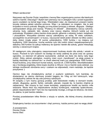 Witam serdecznie! Nazywam się Dorota Chyla i wspólnie z Iwoną Stec organizujemy pomoc dla biednych szkół w Gambi. Dlaczego? Byłam tam pierwszy raz w ubiegłym roku i przed wyjazdem sporo czytałam na temat tego kraju. Wiedziałam więc ,że niepisanym prawem każdy turysta zabiera jakieś szkolne pomoce. Więc i ja zabrałam co mogłam. Ale to jest kropelka w morzu potrzeb. Biegały za mną dzieci prosząc o ołówek, długopis . Dlatego zainicjowałam akcję pod nazwą: "Podaruj mi ołówek" . Zbierałyśmy rzeczy szkolne, ubrania, buty, zabawki, leki, okulary oraz rzeczy zbędne, których ludzie już nie potrzebują. Wysłałam cztery bardzo duże paczki, głównie z odzieżą, butam, książkami i pluszakami. Wszystkie szkolne rzeczy zabrałyśmy ze sobą. W wielu szkołach, szczególnie na prowincjach i w buszu, nauczyciel dzieli jeden ołówek na kilka cześci, żeby dzieci mogły pisać. W sumie uzbierałyśmy 1000 funtów i na miejscu już kupiłyśmy 1000 zeszytów, trochę worków ryżu dla rodzin dzieci niepełnosprawnych, dałyśmy 300 funtów na zakup materacy do spania i ławek dla szkoły, gdzie mieszkają sieroty z ościennych krajów. W następnym roku planujemy zasponsorować budowę studni dla szkoły i wioski w buszu. Pozwoli to tym ludziom na dostęp do wody zdatnej do picia oraz do uprawy ogrodów, co stanowi ich główne wyżywienie. Jednak we dwie nie damy rady tego zrobić. Żeby zebrać pieniądze, musimy mieć czym „handlować”; ja stoję prawie w każdą niedzielę na carboot’cie i w chwili obecnej mam juz utargowane 1000 funtów. Koszt budowy, przy obecnym kursie waluty, wynosi ok. 2,500 funtów. Skontaktowałam się z fundacją angielską, która kopie studnie w Afryce i ma w Gambi swój oddział, czy istnieje możliwość obniżenia ceny i czekam na odpowiedź, mam nadzieje, że będzie pozytywna :) Oprócz tego nie chciałybyśmy jechać z pustymi walizkami, tym bardziej, że dostaniemy za darmo darmowy przelot bagażu do 10kg od linii lotniczych, więc chciałybyśmy zebrać ile się uda pomocy szkolnych. W związku z tym mamy goracą prośbę: jeśli ktokolwiek miałby w domach kredki, ołówki, długopisy, gumki, farbki, ostrzałki, plecaki, mazaki itp. to bardzo chętnie je zabierzemy. Nie muszą to być nowe komplety, pojedyncze kredki są bardzo mile widziane. Może ktoś ma niepotrzebne okulary korekcyjne, materiały opatrunkowe, jakieś niepotrzebne leki? Tam nie ma naprawdę niczego, a droga do lekarza, nie dość, że płatna, to jest bardzo daleka... Poniżej przedstawiam kilka filmów z wizyty w szkole, dla której chcemy zbudować studnię. Dziękujemy bardzo za zrozumienie i chęć pomocy, każda pomoc jest na wagę złota! Z poważaniem, Dorota Chyla Iwona Stec