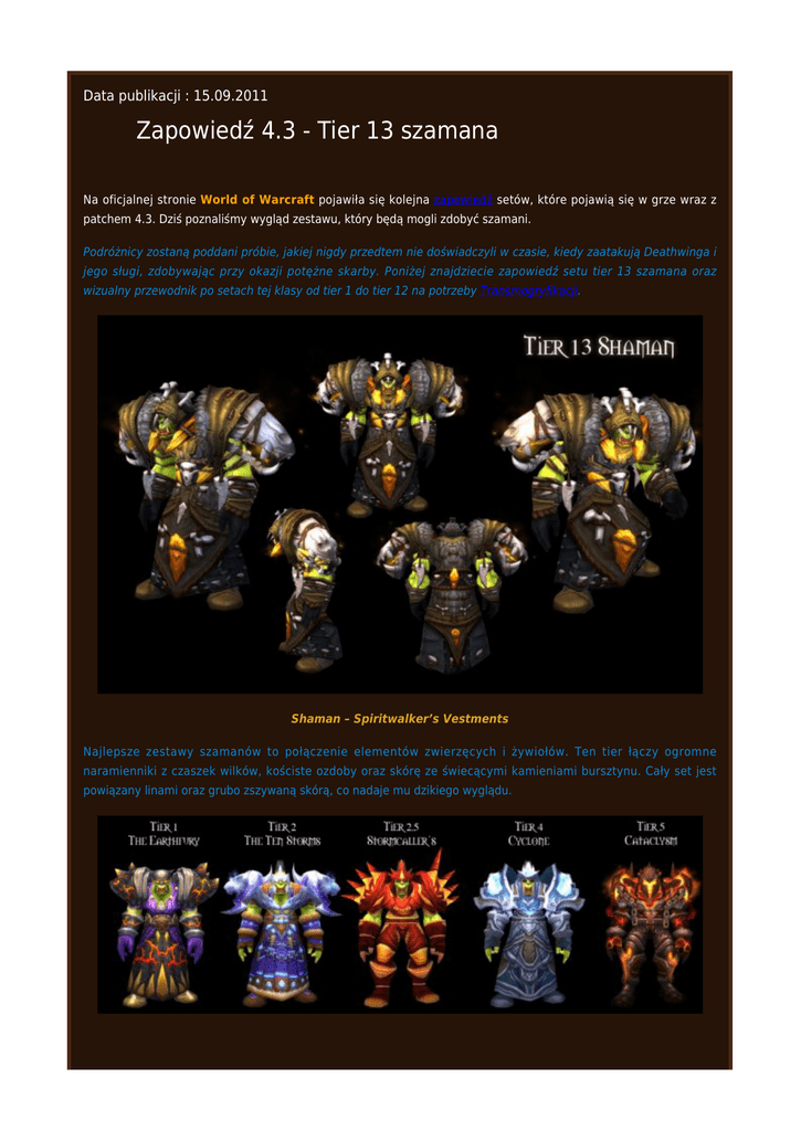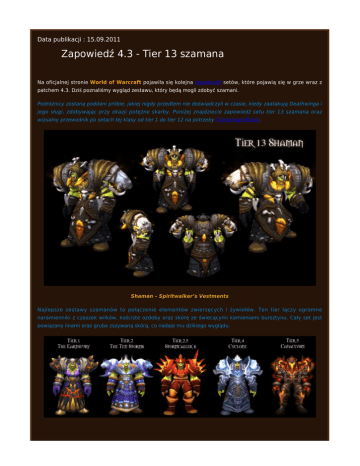 Data publikacji : 15.09.2011 Zapowiedź 4.3 - Tier 13 szamana Na oficjalnej stronie World of Warcraft pojawiła się kolejna zapowiedź setów, które pojawią się w grze wraz z patchem 4.3. Dziś poznaliśmy wygląd zestawu, który będą mogli zdobyć szamani. Podróżnicy zostaną poddani próbie, jakiej nigdy przedtem nie doświadczyli w czasie, kiedy zaatakują Deathwinga i jego sługi, zdobywając przy okazji potężne skarby. Poniżej znajdziecie zapowiedź setu tier 13 szamana oraz wizualny przewodnik po setach tej klasy od tier 1 do tier 12 na potrzeby Transmogryfikacji. Shaman – Spiritwalker’s Vestments Najlepsze zestawy szamanów to połączenie elementów zwierzęcych i żywiołów. Ten tier łączy ogromne naramienniki z czaszek wilków, kościste ozdoby oraz skórę ze świecącymi kamieniami bursztynu. Cały set jest powiązany linami oraz grubo zszywaną skórą, co nadaje mu dzikiego wyglądu. Autor: Grzegorz "Sigmar" Sadziński Liczba wyświetleń strony: 8879 Data publikacji : 15.09.2011 Data modyfikacji : 15.09.2011 Tagi: zapowiedź, Szaman, Shaman, patch 4.3, tier 13 Komentarz (19) dodaj komentarz Super tier! Cóż więcej mogę powiedzieć. Patrząc na niego przypomina mi się WarcraftIII~Elune 2011/09/15 08:37 Nie wiem czy ten zwierzęcy motyw nie pasuje bardziej do hunta. Ale tier nie mniej ciekawy jest, bardziej klasyczmy od poprzednich.~baka14 2011/09/15 08:57 No wreszcie ten tier wygląda jak powinien. Mam nadzieję, że nastepne również będą nawiązywać do klas, które go mają nosić.~metatron 2011/09/15 09:52 Bardzo ladny, swietna robota imo. Szaman nie mial zlego tieru, moze poza thrallem.~Nekkro 2011/09/15 10:18 Set bardzo ładny jeden z fajniejszych moim zdaniem, no ale shaman ogólnie zawsze miał bardzo ładne sety, nawet wtedy gdy nie odzwierciedlały charakteru klasy to po prostu wyglądały ładnie:) w mojej skali ocen od 1 do-10 wygląda to tak: t1 7, t2 8 t2.5 4, t4 9, t5 9,t6 10!, t7 9.5, t8 8, t9h 6, t9a 5, t10 9, t11 6, t12 9.5, t13 10!~thosu 2011/09/15 10:46 Świetny tier, nawet lepszy do warriora, bym powiedział :P~flaaj 2011/09/15 14:12 No, to jest tier. Dobrze, że Blizz poszedł po rozum do głowy i zaczął robić ładne tiery.~Xardas80 2011/09/15 15:18 te kostki na hełmie nie kojarzą wam się czasem z flinstonami?~thosu 2011/09/15 15:47 widząc taki tier mogę powiedziec ze to jest shaman a nie jakies, no...~guzimierz 2011/09/15 15:51 Taki był ich cel! Zrobić brzydkie tiery, żeby ludzie ponarzekali, żeby pod koniec dodatku dowalić takie zajebiste żeby ludzie mówili że ładne i żeby chciało im się je zbierać! XP~Garn 2011/09/15 16:32 Najlepszy tier szamana. W ogóle set, bo pvp też wymiękają. Za wcześnie skreśliłem kreatywność Blizzarda.~ zdenek117 2011/09/15 17:42 Bezapelacyjnie najlepszy tier shamana jaki kiedykolwiek powstał.~Filipeck 2011/09/15 18:46 a co powiecie o tym: http://us.battle.net/wow/en/blog/3502705/Mage_Tier_13_and_Visual_Retrospective-9_15_2011 ?? Zapewne niedlugo sie pojawi news na ten temat takze czekam z niecierpliwością.~sake2k9 2011/09/15 19:07 Wohoooo. This is fckng awesome!! Moj shaman dostaje najladniejsze sety :) Mysle ze to rekompensata za to, ze jest dosc slabym healerem xd. W moim odczuciu wyglada to tak t13 > t12 > t8 > t10.5 > t6~Aylene 2011/09/15 20:29 Genialny set. Gratki dla szamanów ^_^ Czuć w nim fajnego ducha fantasy. Chociaż jeden set bedzie ok - od bardzo bardzo dawna.~Darkpact 2011/09/16 07:06 uuuu musze przyznać że tak świetnie wykonanego setu to nawet w podstawce nie było~ufoahi 2011/09/16 11:51 Jak dla mnie set świetny, ale nie za bardzo pod szamana on kontroluje żywioły nie zwierzęta. Set fajny klasyczny ale jakoś taki...~WojtekS 2011/09/16 15:24 Właśnie że zwierzęce skóry i kości doskonale pasują do wizerunku szamana, w końcu to taki plemienny czarownik. To że kontroluje żywioły nie ma nic do rzeczy, z resztą szamani posiadają też więź z duchami zwierząt. Ogólnie metalowe zbroje nie pasują mi do szamka, nigdy mi się nie podobały jego sety.~ufoahi 2011/09/17 11:56 ZAJE***TY~guzimierz 2011/09/18 14:39 dodaj komentarz Pozostałe nowości Zapowiedź zmian w klasach - Mnich Legion wkroczył w fazę alfa testów w czasie których dostępna jest póki co jedynie lokacja startowa łowców demonów, a my przyglądamy się temu, jakich zmian doczeka się klasa, która stosunkowo niedawno pojawiła się w World of Warcraft. Oto co na najnowszy dodatek Blizzard przygotował dla mnichów.Data publikacji: 24.11.20150 Zapowiedź zmian w klasach - Wojownik Po krótkiej przerwie wracamy z tłumaczeniami blogów poświęconych zmianom, jakie pojawią się w klasach w nadchodzącym dodatku do World of Warcraft. Oto czego powinni spodziewać się wojownicy z Azeroth w LegionieData publikacji: 23.11.20150 Zapowiedź zmian w klasach - Szaman Kolejna zapowiedzieć, która pojawiła się jakiś czas temu na łamach oficjalnej strony społecznościowej dotyczy szamana. Największe zmiany w przypadku tej klasy dotknęły totemy oraz system zasobów specjalizacji Elemental oraz EnhancementData publikacji: 16.11.20150 11 urodziny World of Warcraft World of Warcraft obchodzi już swoje 11 urodziny. Z tej okazji Blizzard przygotował kilka zabawek, które powinny wszystkim przypomnieć sam początek przygody w świecie Azeroth - w rolach głównych Edwin VanCleef, Hogger, murlok oraz Windfury (w wersji nadmuchiwanej).Data publikacji: 16.11.20150 Zapowiedź zmian w klasach - Rycerz śmierci Kolejna zapowiedź opublikowana na łamach oficjalnej strony społecznościowej World of Warcraft poświęcona jest klasie rycerzy śmierci. Poniżej znajdziecie informacje między innymi o ujednoliceniu wszystkich run oraz nowej umiejętności specjalizacji Blood, która została zainspirowana Lordem Marrowgarem z Icecrown Citadel.Data publikacji: 15.11.20150 Wszystkie nowości