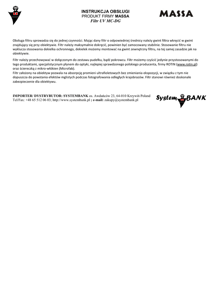 INSTRUKCJA OBSŁUGI PRODUKT FIRMY MASSA Filtr UV MC-DG Obsługa filtru sprowadza się do jednej czynności. Mając dany filtr o odpowiedniej średnicy należy gwint filtra wkręcić w gwint znajdujący się przy obiektywie. Filtr należy maksymalnie dokręcić, powinien być zamocowany stabilnie. Stosowanie filtru nie wyklucza stosowania dekielka ochronnego, dekielek możemy montować na gwint zewnętrzny filtru, na tej samej zasadzie jak na obiektywie. Filtr należy przechowywać w dołączonym do zestawu pudełku, bądź pokrowcu. Filtr możemy czyścić jedynie przystosowanymi do tego produktami, specjalistycznym płynem do optyki, najlepiej sprawdzonego polskiego producenta, firmy ROTIN (www.rotin.pl) oraz ściereczką z mikro-włókien (Microfab). Filtr założony na obiektyw pozwala na absorpcję promieni ultrafioletowych bez zmieniania ekspozycji, w związku z tym nie dopuszcza do powstania efektów mglistych podczas fotografowania odległych krajobrazów. Filtr stanowi również doskonałe zabezpieczenie dla obiektywu. IMPORTER/ DYSTRYBUTOR: SYSTEMBANK os. Awdańców 23, 64-010 Krzywiń Poland Tel/Fax: +48 65 512 06 03; http://www.systembank.pl ; e-mail: [email protected]