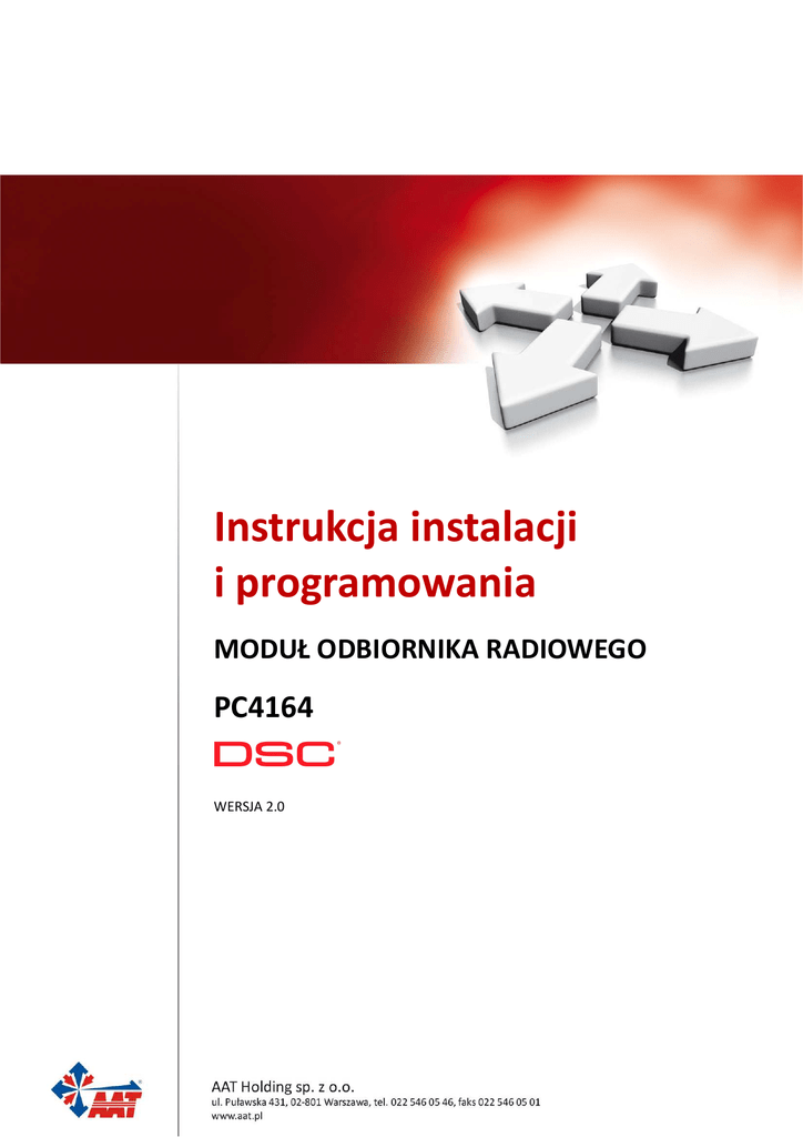 Instrukcja instalacji i programowania MODUŁ ODBIORNIKA RADIOWEGO PC4164 WERSJA 2.0 PC4164 – Instrukcja instalacji i programowania SPIS TREŚCI ROZDZIAŁ 1 1.1 1.2 1.3 1.4 UŻYWANIE INSTRUKCJI ............................................................................................................... 4 DANE TECHNICZNE .................................................................................................................... 4 KOMPATYBILNE URZĄDZENIA BEZPRZEWODOWE .......................................................................... 4 BATERIE .................................................................................................................................... 4 ROZDZIAŁ 2 2.1 2.2 2.3 2.4 WYMIANA I USUWANIE URZĄDZEŃ ...................................................................... 9 W YMIANA URZĄDZEŃ BEZPRZEWODOWYCH ................................................................................. 9 USUWANIE URZĄDZEŃ BEZPRZEWODOWYCH ............................................................................... 9 KASOWANIE NUMERÓW ESN URZĄDZEŃ ..................................................................................... 9 ROZDZIAŁ 6 6.1 6.2 TESTOWANIE I MONTAŻ ......................................................................................... 8 TEST DZIAŁANIA URZĄDZEŃ BEZPRZEWODOWYCH........................................................................ 8 TEST BRELOKÓW WLS909 ........................................................................................................ 8 MONTAŻ MODUŁU PC4164 I CZUJEK BEZPRZEWODOWYCH.......................................................... 8 ROZDZIAŁ 5 5.1 5.2 5.3 PRZYPISYWANIE URZĄDZEŃ BEZPRZEWODOWYCH ........................................ 6 ELEKTRONICZNY NUMER SERYJNY (ESN) ................................................................................... 6 PRZYPISYWANIE URZĄDZEŃ BEZPRZEWODOWYCH (WLS904, WLS907)..................................... 6 PRZYPISYWANIE I PROGRAMOWANIE BRELOKÓW WLS909 .......................................................... 6 ROZDZIAŁ 4 4.1 4.2 4.3 LOKALIZACJA I PODŁĄCZENIE ............................................................................. 5 W YPOSAŻENIE ZESTAWU HANDLOWEGO ..................................................................................... 5 W YBÓR MIEJSCA MONTAŻU MODUŁU PC4164............................................................................. 5 ANTENA .................................................................................................................................... 5 PODŁĄCZENIE I PRZYPISANIE MODUŁU PC4164 ........................................................................ 5 ROZDZIAŁ 3 3.1 3.2 3.3 WSTĘP...................................................................................................................... 4 UWAGI DODATKOWE .............................................................................................. 10 NADZÓR LINII BEZPRZEWODOWYCH ............................................................................................ 10 USTERKI.................................................................................................................................... 10 ROZDZIAŁ 7 ROZWIĄZYWANIE PROBLEMÓW .......................................................................... 12 ARKUSZE PROGRAMOWANIA ......................................................................................................... 13 AAT Holding sp. z o.o. Wszelkie prawa zastrzeżone. 3 PC4164 – Instrukcja instalacji i programowania ROZDZIAŁ 1 WSTĘP Niniejsza instrukcja opisuje sposób instalowania, programowania i obsługi odbiornika PC4164. Przed zainstalowaniem modułu PC4164, należy dokonać następujących czynności: 1. Wykonać pełny schemat instalacji systemu alarmowego; 2. Zainstalować centralę systemu i przynajmniej jedną klawiaturę do przeprowadzenia programowania; 3. Zainstalować dodatkowe moduły rozszerzeń (PC4108A i PC4116) jeśli są przewidziane. Programowanie PC4164 może odbywać się z klawiatury systemu lub przez użycie oprogramowania DLS. 1.1 Używanie instrukcji Przeczytaj instrukcję przed rozpoczęciem instalowania odbiornika PC4164. Zainstalowanie i konfiguracja modułu oraz bezprzewodowych składników systemu powinna odbywać się według określonego trybu postępowania. Poniżej podano przykładowy sposób takiego postępowania: 1. Zamocuj tymczasowo moduł, podłącz przewody magistrali komunikacyjnej COMBUS i przypisz moduł do systemu (patrz rozdział 2); 2. Dokonaj przypisania i zaprogramuj urządzenia bezprzewodowe (patrz rozdział 3); 3. Zaprogramuj linie dozorowe i pozostałe elementy systemu; 4. Przeprowadź testy lokalizacji urządzeń bezprzewodowych (patrz rozdział 4); 5. Zamocuj na stałe odbiornik PC4164 i urządzenia bezprzewodowe; Dodatkowe informacje dotyczące usterek, wykrywania sygnałów zakłócających i wymiany baterii zawarto w rozdziale 6. Pomoc w identyfikowaniu i usuwaniu usterek znajduje się w rozdziale 7 instrukcji. 1.2 Dane techniczne • • • • • • • • Pobór prądu: 80mA; Częstotliwość: 433MHz; Liczba linii bezprzewodowych - obsługuje maksimum 64 linie; Liczba breloków – maksimum 16; Antena - zestrojona przez producenta, zapewnia dobry odbiór sygnałów; Nadzór linii - programowany od 1 do 24 godzin; Instalacja modułu: - na magistrali COMBUS, w odległości do 230 m od centrali (pole przekroju żyły - minimum 0,35mm2); Kompatybilność – współpracuje z centralami PC4010A wer 3.0 i PC4020A wer. 3.0. 1.3 Kompatybilne urządzenia bezprzewodowe • • • WLS904NB — bezprzewodowa czujka ruchu (PIR); WLS907NB — nadajnik uniwersalny / czujnik magnetyczny; WLS909NB — brelok z przyciskami funkcyjnymi. 1.4 Baterie Urządzenia bezprzewodowe powinny być zasilane tylko z baterii alkalicznych. Użycie innych baterii może spowodować nieprawidłowości w dział