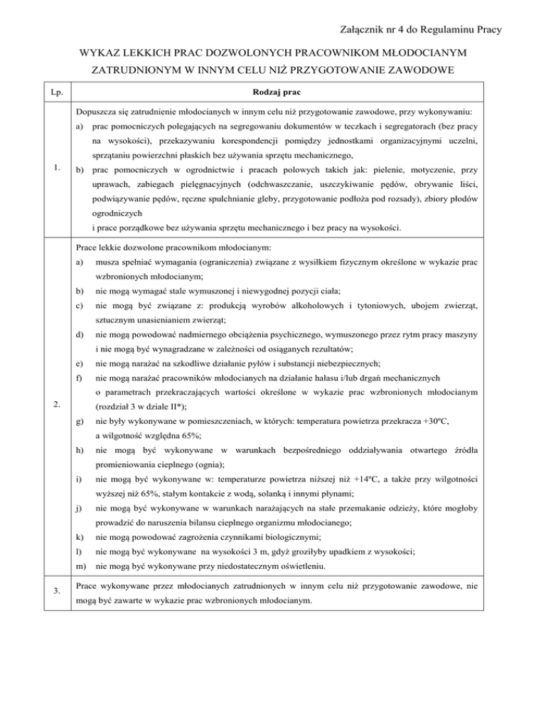 Załącznik nr 4 do Regulaminu Pracy WYKAZ LEKKICH PRAC DOZWOLONYCH PRACOWNIKOM MŁODOCIANYM ZATRUDNIONYM W INNYM CELU NIŻ PRZYGOTOWANIE ZAWODOWE Lp. Rodzaj prac Dopuszcza się zatrudnienie młodocianych w innym celu niż przygotowanie zawodowe, przy wykonywaniu: a) prac pomocniczych polegających na segregowaniu dokumentów w teczkach i segregatorach (bez pracy na wysokości), przekazywaniu korespondencji pomiędzy jednostkami organizacyjnymi uczelni, sprzątaniu powierzchni płaskich bez używania sprzętu mechanicznego, 1. b) prac pomocniczych w ogrodnictwie i pracach polowych takich jak: pielenie, motyczenie, przy uprawach, zabiegach pielęgnacyjnych (odchwaszczanie, uszczykiwanie pędów, obrywanie liści, podwiązywanie pędów, ręczne spulchnianie gleby, przygotowanie podłoża pod rozsady), zbiory płodów ogrodniczych i prace porządkowe bez używania sprzętu mechanicznego i bez pracy na wysokości. Prace lekkie dozwolone pracownikom młodocianym: a) musza spełniać wymagania (ograniczenia) związane z wysiłkiem fizycznym określone w wykazie prac wzbronionych młodocianym; b) nie mogą wymagać stale wymuszonej i niewygodnej pozycji ciała; c) nie mogą być związane z: produkcją wyrobów alkoholowych i tytoniowych, ubojem zwierząt, sztucznym unasienianiem zwierząt; d) nie mogą powodować nadmiernego obciążenia psychicznego, wymuszonego przez rytm pracy maszyny i nie mogą być wynagradzane w zależności od osiąganych rezultatów; e) nie mogą narażać na szkodliwe działanie pyłów i substancji niebezpiecznych; f) nie mogą narażać pracowników młodocianych na działanie hałasu i/lub drgań mechanicznych o parametrach przekraczających wartości określone w wykazie prac wzbronionych młodocianym 2. (rozdział 3 w dziale II*); g) nie były wykonywane w pomieszczeniach, w których: temperatura powietrza przekracza +30ºC, a wilgotność względna 65%; h) nie mogą być wykonywane w warunkach bezpośredniego oddziaływania otwartego źródła promieniowania cieplnego (ognia); i) nie mogą być wykonywane w: temperaturze powietrza niższej niż +14ºC, a także przy wilgotności wyższej niż 65%, stałym kontakcie z wodą, solanką i innymi płynami; j) nie mogą być wykonywane w warunkach narażających na stałe przemakanie odzieży, które mogłoby prowadzić do naruszenia bilansu cieplnego organizmu młodocianego; 3. k) nie mogą powodować zagrożenia czynnikami biologicznymi; l) nie mogą być wykonywane na wysokości 3 m, gdyż groziłyby upadkiem z wysokości; m) nie mogą być wykonywane przy niedostatecznym oświetleniu. Prace wykonywane przez młodocianych zatrudnionych w innym celu niż przygotowanie zawodowe, nie mogą być zawarte w wykazie prac wzbronionych młodocianym.