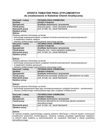 OFERTA TEMATÓW PRAC DYPLOMOWYCH do zrealizowania w Katedrze Chemii Analitycznej Kierunek i rodzaj TECHNOLOGIA CHEMICZNA studiów (studia II stopnia) Specjalność Analityka techniczna i procesowa Sztuczny język - nowe narzędzie analityczne Temat pracy prof. dr hab. inż. Jacek Namieśnik Kierownik pracy Opiekun pracy Zakres: Zostaną zebrane informacje na temat: - technologii wytwarzania takich urządzeń kontrolno-pomiarowych wykorzystywanych w badaniach mediów ciekłych - obszaru praktycznego wykorzystania sztucznego języka Kierunek i rodzaj TECHNOLOGIA CHEMICZNA studiów (studia II stopnia) Specjalność Analityka techniczna i procesowa Sztuczny nos - nowe narzędzie analityczne Temat pracy prof. dr hab. inż. Jacek Namieśnik Kierownik pracy Opiekun pracy Zakres: Zostaną zebrane informacje na temat: - technologii wytwarzania takich urządzeń kontrolno-pomiarowych wykorzystywanych w badaniach mediów gazowych - obszaru praktycznego wykorzystania sztucznego nosa Kierunek i rodzaj TECHNOLOGIA CHEMICZNA studiów (studia II stopnia) Specjalność Analityka techniczna i procesowa Miniaturowe przyrządy analityczne - laboratorium na czipie Temat pracy prof. dr hab. inż. Jacek Namieśnik Kierownik pracy Opiekun pracy Zakres: Zostaną zebrane informacje na temat: - technologii wytwarzania tego typu zminiaturyzowanych urządzeń kontrolno - pomiarowych - obszaru praktycznego wykorzystania tego typu urządzeń analitycznych Kierunek i rodzaj studiów Specjalność Temat pracy Kierownik pracy Opiekun pracy TECHNOLOGIA CHEMICZNA (studia II stopnia) Analityka techniczna i procesowa Ruchome laboratoria do monitoringu jakości powietrza atmosferycznego prof. dr hab. inż. Jacek Namieśnik Zakres: W ramach projektu dyplomowego zostaną zebrane informacje o różnych typach ruchomych (mobilnych) systemów monitorujących. Opisane zostaną przykłady aglomeracji miejskich w których takie systemy ą wykorzystywane do uzyskania informacji o stanie powietrza atmosferycznego. Kierunek i rodzaj studiów Specjalność Temat pracy Kierownik pracy Opiekun pracy TECHNOLOGIA CHEMICZNA (studia II stopnia) Analityka techniczna i procesowa Badania oddechu ludzkiego – droga do uzyskania informacji o stanie zdrowia człowieka i otaczającego środowiska prof. dr hab. inż. Jacek Namieśnik Zakres: Zostaną zebrane informacje literaturowe na temat: - urządzeń analitycznych wykorzystywanych na etapie pobierania próbek i analizy składu oddechu ludzkiego - wpływu rożnych parametrów na skład i poziom zawartości składników w oddechu ludzkim Kierunek i rodzaj TECHNOLOGIE OCHRONY ŚRODOWISKA studiów (studia II stopnia) Specjalność Monitoring i analityka zanieczyszczeń środowiska Sztuczny język - nowe narzędzie analityczne Temat pracy prof. dr hab. inż. Jacek Namieśnik Kierownik pracy Opiekun pracy Zakres: Zostaną zebrane informacje na temat: - technologii wytwarzania takich urządzeń kontrolno-pomiarowych wykorzystywanych w badaniach mediów ciekłych - obszaru praktycznego wykorzystania sztucznego języka Kierunek i rodzaj TECHNOLOGIE OCHRONY ŚRODOWISKA studiów (studia II stopnia) Specjalność Monitoring i analityka zanieczyszczeń środowiska Sztuczny nos - nowe narzędzie analityczne Temat pracy prof. dr hab. inż. Jacek Namieśnik Kierownik pracy Opiekun pracy Zakres: Zostaną zebrane informacje na temat: - technologii wytwarzania takich urządzeń kontrolno-pomiarowych wykorzystywanych w badaniach mediów gazowych - obszaru praktycznego wykorzystania sztucznego nosa Kierunek i rodzaj TECHNOLOGIE OCHRONY ŚRODOWISKA studiów (studia II stopnia) Specjalność Monitoring i analityka zanieczyszczeń środowiska Miniaturowe przyrządy analityczne - laboratorium na czipie Temat pracy prof. dr hab. inż. Jacek Namieśnik Kierownik pracy Opiekun pracy Zakres: Zostaną zebrane informacje na temat: - technologii wytwarzania tego typu zminiaturyzowanych urządzeń kontrolno - pomiarowych - obszaru praktycznego wykorzystania tego typu urządzeń analitycznych Kierunek i rodzaj studiów Specjalność Temat pracy Kierownik pracy TECHNOLOGIE OCHRONY ŚRODOWISKA (studia II stopnia) Monitoring i analityka zanieczyszczeń środowiska Ruchome laboratoria do monitoringu jakości powietrza atmosferycznego prof. dr hab. inż. Jacek Namieśnik Opiekun pracy Zakres: W ramach projektu dyplomowego zostaną zebrane informacje o różnych typach ruchomych (mobilnych) systemów monitorujących. Opisane zostaną przykłady aglomeracji miejskich w których takie systemy ą wykorzystywane do uzyskania informacji o stanie powietrza atmosferycznego. Kierunek i rodzaj TECHNOLOGIE OCHRONY ŚRODOWISKA studiów (studia II stopnia) Specjalność Monitoring i analityka zanieczyszczeń środowiska Badania oddechu ludzkiego – droga do uzyskania informacji o Temat pracy stanie zdrowia człowieka i otaczającego środowiska prof. dr hab. inż. Jacek Namieśnik Kierownik pracy Opiekun pracy Zakres: Zostaną zebrane informacje literaturowe na temat: - urządzeń analitycznych wykorzystywanych na etapie pobierania próbek i analizy składu oddechu ludzkiego - wpływu rożnych parametrów na skład i poziom zawartości składników w oddechu ludzkim Kierunek i rodzaj TECHNOLOGIE OCHRONY ŚRODOWISKA studiów (studia II stopnia) Specjalność Monitoring i analityka zanieczyszczeń środowiska Badania poziomu składników organicznych w próbkach opadów Temat pracy atmosferycznych (deszcz, śnieg, szron, sadź). prof. dr hab. inż. Jacek Namieśnik/dr hab. inż. Żaneta Kierownik pracy Polkowska Opiekun pracy Zakres: Program badań będzie obejmował: - okresowe pobieranie próbek opadów atmosferycznych w różnych punktach na terenie Trójmiasta; - badania różnych sposobów konserwacji pobranych próbek; - przygotowanie próbek do analiz chromatograficznych; - przeprowadzenie oznaczeń ilościowych oraz identyfikacji zanieczyszczeń organicznych z wykorzystaniem chromatografii gazowej (GC); - określenie sezonowych zmian poziom