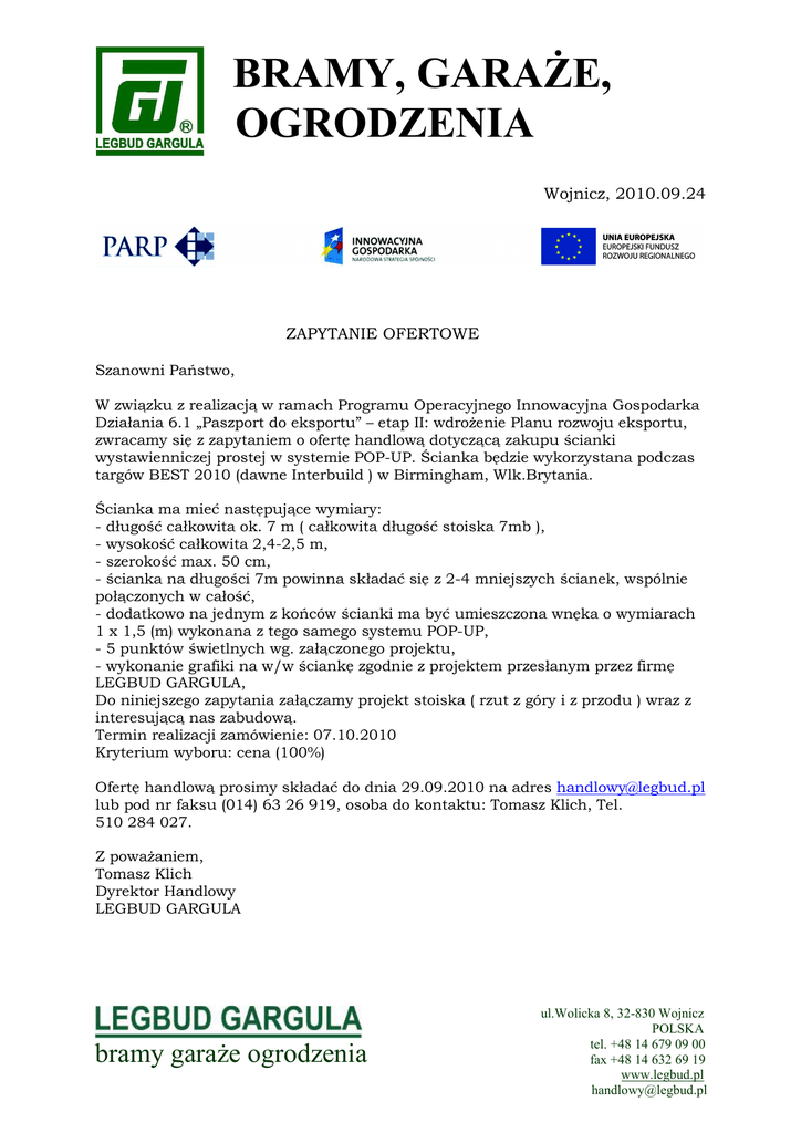 BRAMY, GARAŻE, OGRODZENIA Wojnicz, 2010.09.24 ZAPYTANIE OFERTOWE Szanowni Państwo, W związku z realizacją w ramach Programu Operacyjnego Innowacyjna Gospodarka Działania 6.1 „Paszport do eksportu” – etap II: wdrożenie Planu rozwoju eksportu, zwracamy się z zapytaniem o ofertę handlową dotyczącą zakupu ścianki wystawienniczej prostej w systemie POP-UP. Ścianka będzie wykorzystana podczas targów BEST 2010 (dawne Interbuild ) w Birmingham, Wlk.Brytania. Ścianka ma mieć następujące wymiary: - długość całkowita ok. 7 m ( całkowita długość stoiska 7mb ), - wysokość całkowita 2,4-2,5 m, - szerokość max. 50 cm, - ścianka na długości 7m powinna składać się z 2-4 mniejszych ścianek, wspólnie połączonych w całość, - dodatkowo na jednym z końców ścianki ma być umieszczona wnęka o wymiarach 1 x 1,5 (m) wykonana z tego samego systemu POP-UP, - 5 punktów świetlnych wg. załączonego projektu, - wykonanie grafiki na w/w ściankę zgodnie z projektem przesłanym przez firmę LEGBUD GARGULA, Do niniejszego zapytania załączamy projekt stoiska ( rzut z góry i z przodu ) wraz z interesującą nas zabudową. Termin realizacji zamówienie: 07.10.2010 Kryterium wyboru: cena (100%) Ofertę handlową prosimy składać do dnia 29.09.2010 na adres [email protected] lub pod nr faksu (014) 63 26 919, osoba do kontaktu: Tomasz Klich, Tel. 510 284 027. Z poważaniem, Tomasz Klich Dyrektor Handlowy LEGBUD GARGULA bramy garaże ogrodzenia ul.Wolicka 8, 32-830 Wojnicz POLSKA tel. +48 14 679 09 00 fax +48 14 632 69 19 www.legbud.pl [email protected]