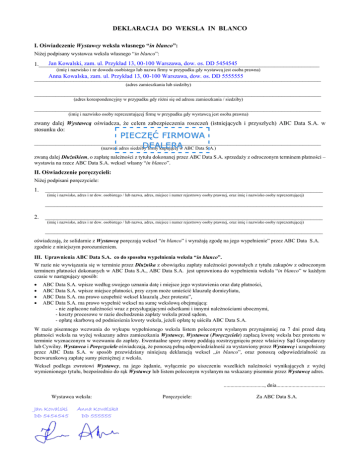 DEKLARACJA DO WEKSLA IN BLANCO I. Oświadczenie Wystawcy weksla własnego “in blanco”: Niżej podpisany wystawca weksla własnego “in blanco”: Jan Kowalski, zam. ul. Przykład 13, 00-100 Warszawa, dow. os. DD 5454545 1._____________________________________________________________________________________________ (imię i nazwisko i nr dowodu osobistego lub nazwa firmy w przypadku gdy wystawcą jest osoba prawna) Anna Kowalska, zam. ul. Przykład 13, 00-100 Warszawa, dow. os. DD 5555555 _______________________________________________________________________________________________ (adres zamieszkania lub siedziby) _______________________________________________________________________________________________ (adres korespondencyjny w przypadku gdy różni się od adresu zamieszkania / siedziby) _______________________________________________________________________________________________ (imię i nazwisko osoby reprezentującej firmę w przypadku gdy wystawcą jest osoba prawna) zwany dalej Wystawcą oświadcza, że celem zabezpieczenia roszczeń (istniejących i przyszłych) ABC Data S.A. w stosunku do: _______________________________________________________________________________________________ (nazwa i adres siedziby firmy kupującej w ABC Data S.A.) zwaną dalej Dłużnikiem, o zapłatę należności z tytułu dokonanej przez ABC Data S.A. sprzedaży z odroczonym terminem płatności – wystawia na rzecz ABC Data S.A. weksel własny “in blanco”. II. Oświadczenie poręczycieli: Niżej podpisani poręczyciele: 1. ____________________________________________________________________________________________ (imię i nazwisko, adres i nr dow. osobistego / lub nazwa, adres, miejsce i numer rejestrowy osoby prawnej, oraz imię i nazwisko osoby reprezentującej) ____________________________________________________________________________________________ 2. ____________________________________________________________________________________________ (imię i nazwisko, adres i nr dow. osobistego / lub nazwa, adres, miejsce i numer rejestrowy osoby prawnej, oraz imię i nazwisko osoby reprezentującej) ____________________________________________________________________________________________ oświadczają, że solidarnie z Wystawcą poręczają weksel “in blanco” i wyrażają zgodę na jego wypełnienie” przez ABC Data S.A. zgodnie z niniejszym porozumieniem. III. Uprawnienia ABC Data S.A. co do sposobu wypełnienia weksla “in blanco”. W razie nie wywiązania się w terminie przez Dłużnika z obowiązku zapłaty należności powstałych z tytułu zakupów z odroczonym terminem płatności dokonanych w ABC Data S.A., ABC Data S.A. jest uprawniona do wypełnienia weksla “in blanco” w każdym czasie w następujący sposób: ABC Data S.A. wpisze według swojego uznania datę i miejsce jego wystawienia oraz datę płatności, ABC Data S.A. wpisze miejsce płatności, przy czym może umieścić klauzulę domicyliatu, ABC Data S.A. ma prawo uzupełnić weksel klauzulą „bez protestu”, ABC Data S.A. ma prawo wypełnić weksel na sumę wekslową obejmującą: - nie zapłacone należności wraz z przysługującymi odsetkami i innymi należnościami ubocznymi, - koszty procesowe w razie dochodzenia zapłaty weksla przed sądem, - opłatę skarbową od podniesienia kwoty weksla, jeżeli opłatę tę uiściła ABC Data S.A. W razie pisemnego wezwania do wykupu wypełnionego weksla listem poleconym wysłanym przynajmniej na 7 dni przed datą płatności weksla na wyżej wskazany adres zamieszkania Wystawcy, Wystawca (Poręczyciele) zapłacą kwotę weksla bez protestu w terminie wyznaczonym w wezwaniu do zapłaty. Ewentualne spory strony poddają rozstrzygnięciu przez właściwy Sąd Gospodarczy lub Cywilny. Wystawca i Poręczyciele oświadczają, że ponoszą pełną odpowiedzialność za wystawiony przez Wystawcę i uzupełniony przez ABC Data S.A. w sposób przewidziany niniejszą deklaracją weksel „in blanco”, oraz ponoszą odpowiedzialność za bezwarunkową zapłatę sumy pieniężnej z weksla. Weksel podlega zwrotowi Wystawcy, na jego żądanie, wyłącznie po uiszczeniu wszelkich należności wynikających z wyżej wymienionego tytułu, bezpośrednio do rąk Wystawcy lub listem poleconym wysłanym na wskazany pisemnie przez Wystawcę adres. .............................., dnia.................................... Wystawca weksla: Jan Kowalski DD 5454545 Anna Kowalska DD 555555 Poręczyciele: Za ABC Data S.A.