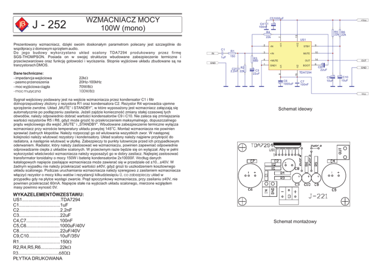 ® J - 252 C51000uF +Vcc C4 100nF R5 R6 22k 22k R4 7 22k 13 JABEL WZMACNIACZ MOCY 100W (mono) 22kW 20Hz-100kHz 70W/8W 100W/8W Sygna³ wejœciowy podawany jest na wejœcie wzmacniacza przez kondensator C1 i filtr dolnoprzepustowy z³o¿ony z rezystora R1 oraz kondensatora C2. Rezystor R4 wprowadza ujemne sprzê¿enie zwrotne. Uk³ad „MUTE” i STANDBY”, w które wyposa¿ony jest wzmacniacz za³¹czaj¹ siê automatycznie po pod³¹czeniu zasilania. Je¿eli zajdzie koniecznoœæ zmiany sta³ej czasowej tych obwodów, nale¿y odpowiednio dobraæ wartoœci kondensatorów C9 i C10. Nie zaleca siê zmniejszania wartoœci rezystorów R5 i R6, gdy¿ mo¿e groziæ to przekroczeniem maksymalnego, dopuszczalnego pr¹du wejœciowego dla wejœæ „MUTE” i „STANDBY”. Wbudowane zabezpieczenie termiczne wy³¹cza wzmacniacz przy wzroœcie temperatury uk³adu powy¿ej 145OC. Monta¿ wzmacniacza nie powinien sprawiaæ ¿adnych k³opotów. Nale¿y rozpocz¹æ go od wlutowania wszystkich zwor. W nastêpnej kolejnoœci nale¿y wlutowaæ rezystory i kondensatory. Uk³ad scalony nale¿y najpierw przykrêciæ do radiatora, a nastêpnie wlutowaæ w p³ytkê. Zabezpieczy to punkty lutownicze przed ich przypadkowym oderwaniem. Radiator, który nale¿y zastosowaæ we wzmacniaczu, powinien zapewniaæ odpowiednie odprowadzanie ciep³a z uk³adów scalonych. W przeciwnym razie bêdzie siê on wy³¹cza³. Aby w pe³ni wykorzystaæ w³aœciwoœci wzmacniacza nale¿y wyposa¿yæ go w dobry zasilacz. Najlepiej zastosowaæ transformator toroidalny o mocy 150W i bateriê kondensatorów 2x10000ìF. Wed³ug danych katalogowych napiêcie zasilaj¹ce wzmacniacza mo¿e zawieraæ siê w przedziale od ±10...±40V. W ¿adnym wypadku nie nale¿y przekraczaæ wartoœci ±40V, gdy¿ grozi to uszkodzeniem kosztownego uk³adu scalonego. Podczas uruchamiania wzmacniacza nale¿y szeregowo z zasilaniem wzmacniacza w³¹czyæ rezystor o mocy kilku watów i rezystancji kilkudziesiêciu Ù, co zabezpieczy uk³ad w przypadku gdy na p³ytce wyst¹pi zwarcie. Pr¹d spoczynkowy wzmacniacza, przy zasilaniu ±40V, nie powinien przekraczaæ 60mA. Napiêcie sta³e na wyjœciach uk³adu scalonego, mierzone wzglêdem masy powinno wynosiæ 0V. WYKAZELEMENTÓWZESTAWU: US1..............................TDA7294 C1................................1uF C2................................2,2nF C3................................22uF C4,C7..........................100nF C5,C6..........................1000uF/40V C8................................22uF/40V C9,C10........................10uF/35V R1................................150W R2,R4,R5,R6...............22kW R3...............................680W P£YTKA DRUKOWANA 150 3 GND R3 680 4 1 R2 C2 2,2nF 22k C3 22uF +V2 +IN +MUTE GND1 STBY MUTE OUT -V2 1uF 15 R1 IN -V1 C1 -IN 8 Dane techniczne: - impedancja wejœciowa - pasmo przenoszenia - moc wyjœciowa ci¹g³a - moc muzyczna 2 +V1 US1 Prezentowany wzmacniacz, dziêki swoim doskona³ym parametrom polecany jest szczególnie do wspó³pracy z domowym sprzêtem audio. Do jego budowy wykorzystano uk³ad scalony TDA7294 produkowany przez firmê SGS-THOMPSON. Posiada on w swojej strukturze wbudowane zabezpieczenie termiczne i przeciwzwarciowe oraz funkcjê gotowoœci i wyciszenia. Stopnie wyjœciowe uk³adu zbudowane s¹ na tranzystorach DMOS. C6 1000uF BOOT 9 10 14 OUT 6 TDA7294 C7 100nF C8 22uF C9 10uF GND C10 10uF -Vcc Schemat ideowy Schemat monta¿owy