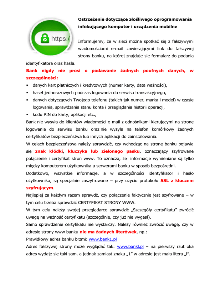 Ostrzeżenie dotyczące złośliwego oprogramowania infekującego komputer i urządzenia mobilne Informujemy, że w sieci można spotkać się z fałszywymi wiadomościami e-mail zawierającymi link do fałszywej strony banku, na której znajduje się formularz do podania identyfikatora oraz hasła. Bank nigdy nie prosi o podawanie żadnych poufnych danych, w szczególności: danych kart płatniczych i kredytowych (numer karty, data ważności), haseł jednorazowych podczas logowania do serwisu transakcyjnego, danych dotyczących Twojego telefonu (takich jak numer, marka i model) w czasie logowania, sprawdzania stanu konta i przeglądania historii operacji, kodu PIN do karty, aplikacji etc., Bank nie wysyła do klientów wiadomości e-mail z odnośnikami kierującymi na stronę logowania do serwisu banku oraz nie wysyła na telefon komórkowy żadnych certyfikatów bezpieczeństwa lub innych aplikacji do zainstalowania. W celach bezpieczeństwa należy sprawdzić, czy wchodząc na stronę banku pojawia się znak kłódki, kluczyka lub zielonego pasku, oznaczający szyfrowane połączenie i certyfikat stron www. To oznacza, że informacje wymieniane są tylko między komputerem użytkownika a serwerami banku w sposób bezpośredni. Dodatkowo, wszystkie informacje, a w szczególności identyfikator i hasło użytkownika, są specjalnie zaszyfrowane – przy użyciu protokołu SSL z kluczem szyfrującym. Najlepiej za każdym razem sprawdź, czy połączenie faktycznie jest szyfrowane – w tym celu trzeba sprawdzić CERTYFIKAT STRONY WWW. W tym celu należy swojej przeglądarce sprawdzić „Szczegóły certyfikatu” zwrócić uwagę na ważność certyfikatu (szczególnie, czy już nie wygasł). Samo sprawdzenie certyfikatu nie wystarczy. Należy również zwrócić uwagę, czy w adresie strony www banku nie ma żadnych literówek, np.: Prawidłowy adres banku brzmi: www.bank1.pl Adres fałszywej strony może wyglądać tak: www.bankl.pl – na pierwszy rzut oka adres wydaje się taki sam, a jednak zamiast znaku „1” w adresie jest mała litera „l”.