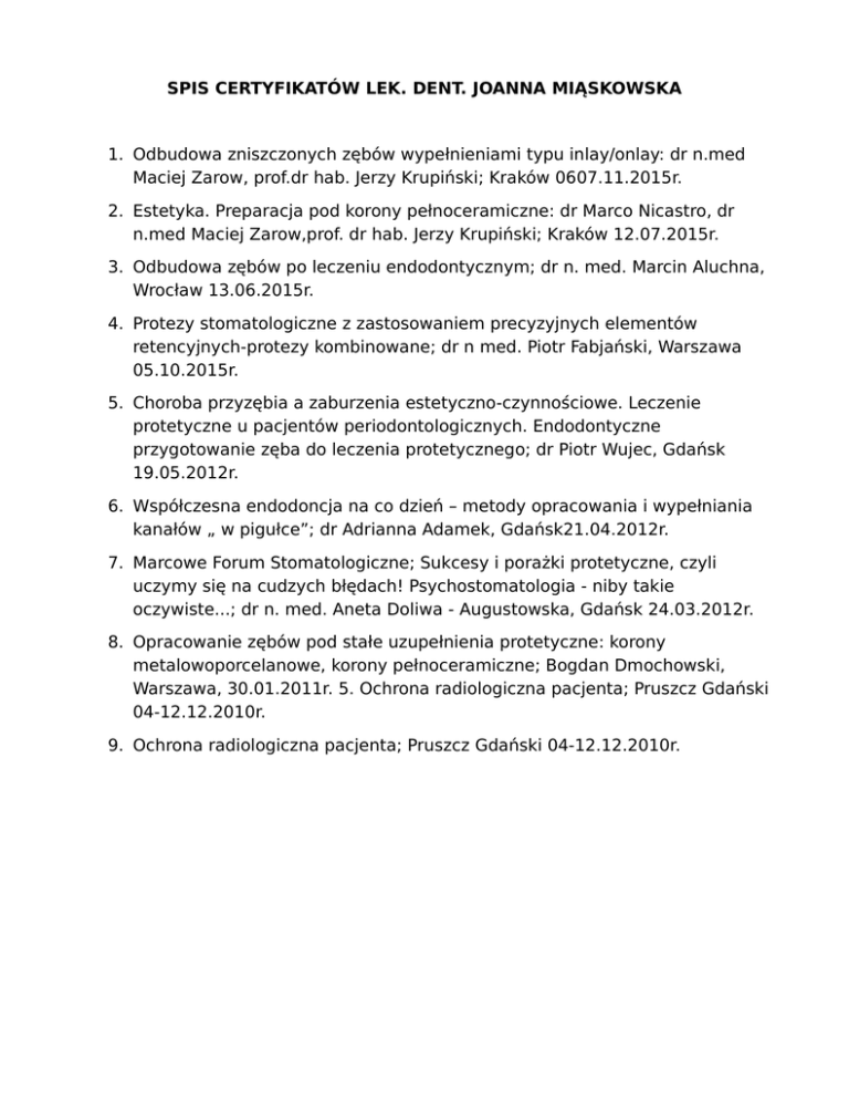 SPIS CERTYFIKATÓW LEK. DENT. JOANNA MIĄSKOWSKA 1. Odbudowa zniszczonych zębów wypełnieniami typu inlay/onlay: dr n.med Maciej Zarow, prof.dr hab. Jerzy Krupiński; Kraków 0607.11.2015r. 2. Estetyka. Preparacja pod korony pełnoceramiczne: dr Marco Nicastro, dr n.med Maciej Zarow,prof. dr hab. Jerzy Krupiński; Kraków 12.07.2015r. 3. Odbudowa zębów po leczeniu endodontycznym; dr n. med. Marcin Aluchna, Wrocław 13.06.2015r. 4. Protezy stomatologiczne z zastosowaniem precyzyjnych elementów retencyjnych-protezy kombinowane; dr n med. Piotr Fabjański, Warszawa 05.10.2015r. 5. Choroba przyzębia a zaburzenia estetyczno-czynnościowe. Leczenie protetyczne u pacjentów periodontologicznych. Endodontyczne przygotowanie zęba do leczenia protetycznego; dr Piotr Wujec, Gdańsk 19.05.2012r. 6. Współczesna endodoncja na co dzień – metody opracowania i wypełniania kanałów „ w pigułce”; dr Adrianna Adamek, Gdańsk21.04.2012r. 7. Marcowe Forum Stomatologiczne; Sukcesy i porażki protetyczne, czyli uczymy się na cudzych błędach! Psychostomatologia - niby takie oczywiste...; dr n. med. Aneta Doliwa - Augustowska, Gdańsk 24.03.2012r. 8. Opracowanie zębów pod stałe uzupełnienia protetyczne: korony metalowoporcelanowe, korony pełnoceramiczne; Bogdan Dmochowski, Warszawa, 30.01.2011r. 5. Ochrona radiologiczna pacjenta; Pruszcz Gdański 04-12.12.2010r. 9. Ochrona radiologiczna pacjenta; Pruszcz Gdański 04-12.12.2010r.