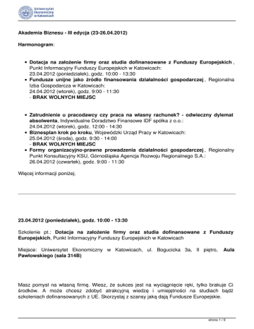 Akademia Biznesu - III edycja (23-26.04.2012) Harmonogram: Dotacja na założenie firmy oraz studia dofinansowane z Funduszy Europejskich , Punkt Informacyjny Funduszy Europejskich w Katowicach: 23.04.2012 (poniedziałek), godz. 10:00 - 13:30 Fundusze unijne jako źródło finansowania działalności gospodarczej , Regionalna Izba Gospodarcza w Katowicach: 24.04.2012 (wtorek), godz. 9:00 - 11:30 - BRAK WOLNYCH MIEJSC Zatrudnienie u pracodawcy czy praca na własny rachunek? - odwieczny dylemat absolwenta, Indywidualne Doradztwo Finansowe IDF spółka z o.o.: 24.04.2012 (wtorek), godz. 12:00 - 14:30 Biznesplan krok po kroku, Wojewódzki Urząd Pracy w Katowicach: 25.04.2012 (środa), godz. 9:30 - 14:00 - BRAK WOLNYCH MIEJSC Formy organizacyjno-prawne prowadzenia działalności gospodarczej , Regionalny Punkt Konsultacyjny KSU, Górnośląska Agencja Rozwoju Regionalnego S.A.: 26.04.2012 (czwartek), godz. 9:00 - 11:30 Więcej informacji poniżej. 23.04.2012 (poniedziałek), godz. 10:00 - 13:30 Szkolenie pt.: Dotacja na założenie firmy oraz studia dofinansowane z Funduszy Europejskich, Punkt Informacyjny Funduszy Europejskich w Katowicach Miejsce: Uniwersytet Ekonomiczny w Katowicach, ul. Bogucicka 3a, II piętro, Pawłowskiego (sala 314B) Aula Masz pomysł na własną firmę. Wiesz, że sukces jest na wyciągnięcie ręki, tylko brakuje Ci środków. A może chcesz zdobyć atrakcyjną wiedzę i umiejętności na studiach bądź szkoleniach dofinansowanych z UE. Skorzystaj z szansy jaką dają Fundusze Europejskie. strona 1 / 9 Dotacja na uruchomienie własnej działalności gospodarczej przyznawana jest w ramach działania 6.2 „Wsparcie oraz promocja przedsiębiorczości i samozatrudnienia” POKL (Programu Operacyjnego Kapitał Ludzki) współfinansowanego z Europejskiego Funduszu Społecznego (EFS). O środki (maksymalnie 40 tys. zł) z tego działania mogą ubiegać się mieszkańcy województwa śląskiego aplikując do właściwego operatora. Podział na operatorów działania 6.2 POKL został dokonany w oparciu o granice podregionów województwa, zgodnie z zasadą 1 operator - 1 podregion. Część operatorów wprowadziła restrykcyjne kryteria dostępu do projektu. Zgodnie z nimi o 40 tysięczną dotację mogą ubiegać się m.in. osoby młode, zamieszkałe w podregionach katowickim, tyskim, częstochowskim, gliwickim (tylko kobiety zarejestrowane w PUP), bytomskiego (tylko osoby zarejestrowane w PUP). Na warsztatach będziesz mógł poznać zasady aplikowania o dotację oraz dodatkowo, pracując w grupie przygotujesz dokumenty rekrutacyjne. Warsztaty zostaną poszerzone również o zagadnienia dotyczące bezpłatnych szkoleń, kursów, studiów dofinansowanych z EFS. Zainteresowany? Chcesz wiedzieć więcej? Zapisz się na bezpłatne warsztaty prowadzone przez Punkt Informacyjny Funduszy Europejskich z Katowic Program: 9:45 – 10:00 – Rejestracja uczestników 10:00 – 10:10 – Zakres i formy świadczenia usług przez Punkt Informacyjny Funduszy Europejskich w Katowicach 10:10 – 10:30 – Szkolenia, kursy, studia dofinansowane z Europejskiego Funduszu Społecznego 10:30 – 11:00 – Dotacja na założenie firmy – Działanie 6.2 Program Operacyjny Kapitał Ludzki 11:00 – 11:30 – Warsztaty cz.1 – praca w grupach - przygotowanie formularza aplikacyjnego 11:30 – 11:45 – Przerwa 11:45 - 12:15 – Warsztaty cz. 2 12:15 – 13:00 – Omówienie wyników pracy, dyskusja, pytania Uczestnicy szkolenia otrzymają Zaświadczenia. NA SZKOLENIE OBOWIĄZUJĄ ZAPISY. ILOŚĆ MIEJSC OGRANICZONA. strona 2 / 9 ZGŁOSZENIA: Osoby zainteresowane uczestnictwem w szkoleniu proszone są o przysłanie zgłoszenia na adres e-mail: [email protected] w temacie wiadomości proszę wpisać temat szkolenia, natomiast w treści e-maila: Imię i nazwisko, Uczelnie, Wydział, Kierunek, Rok studiów, Nr albumu, E-mail, Tel. kontaktowy. Uczestnictwo w szkoleniu zostanie potwierdzone e-mailowo, w terminie do 7 dni od przysłania zgłoszenia. 24.04.2012 (wtorek), godz. 9:00 - 11:30 Szkolenie pt.: Fundusze unijne jako źródło finansowania działalności gospodarczej , Regionalna Izba Gospodarcza w Katowicach - BRAK WOLNYCH MIEJSC Miejsce: Uniwersytet Ekonomiczny w Katowicach, ul. Bogucicka 3a, II piętro, sala 314B (Aula Pawłowskiego) Celem szkolenia będzie charakterystyka możliwości uzyskania wsparcia finansowanego ze środków Unii Europejskiej na rozpoczęcie działalności gospodarczej w ramach Programu Operacyjnego Kapitał Ludzki, Programu Operacyjnego Innowacyjna Gospodarka oraz z funduszy pożyczkowych dotowanych ze środków Europejskiego Funduszu Rozwoju Regionalnego i budżetu państwa. Program: Część 1. Gdzie szukać informacji na temat rozpoczynania działalności gospodarczej w Polsce i za granicą. Przegląd instrumentów wsparcia finansowanych z różnych źródeł publicznych? (ok. 30 min.), w tym: strona 3 / 9 omówienie zasad korzystania z usług Punktów Konsultacyjnych KSU zakres informacji udostępniany przez Pojedynczy Punkt Kontaktowy Centralna Ewidencja i Informacja o Działalności Gospodarczej – charakterystyka zbioru informacji przydatnej w procesie zakładania działalności gospodarczej Część 2. Charakterystyka Działania 6.2 „Wsparcie oraz promocja przedsiębiorczości i samo zatrudnienia” w ramach Programu Operacyjnego Kapitał Ludzki (ok. 45 min.), w tym: omówienie sposobu wdrażania Działania wsparcie dostępne w ramach Działania zasady uczestnictwa w Działaniu charakterystyka wydatków możliwych do sfinansowania w Działaniu charakterystyka dokumentów aplikacyjnych Część 3. Charakterystyka Działania 8.1 „Wspieranie działalności gospodarczej w dziedzinie gospodarki elektronicznej"” w ramach Programu Operacyjnego Innowacyjna Gospodarka (ok. 45 min.), w tym: omówienie sposobu wdrażania Działania wsparcie dostępne w ramach Działania zasady uczestnictwa w Działaniu charakterystyka wydatków możliwych do sfinansowania w Działan