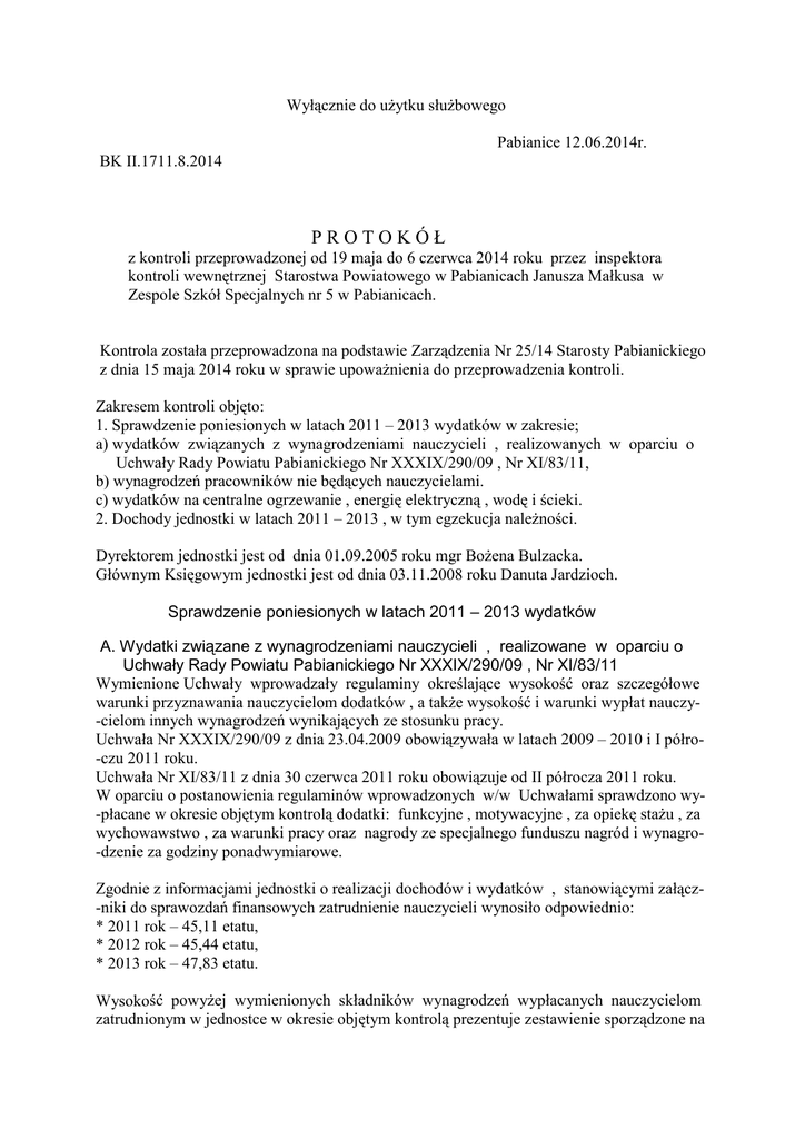 Wyłącznie do użytku służbowego Pabianice 12.06.2014r. BK II.1711.8.2014 PROTOKÓŁ z kontroli przeprowadzonej od 19 maja do 6 czerwca 2014 roku przez inspektora kontroli wewnętrznej Starostwa Powiatowego w Pabianicach Janusza Małkusa w Zespole Szkół Specjalnych nr 5 w Pabianicach. Kontrola została przeprowadzona na podstawie Zarządzenia Nr 25/14 Starosty Pabianickiego z dnia 15 maja 2014 roku w sprawie upoważnienia do przeprowadzenia kontroli. Zakresem kontroli objęto: 1. Sprawdzenie poniesionych w latach 2011 – 2013 wydatków w zakresie; a) wydatków związanych z wynagrodzeniami nauczycieli , realizowanych w oparciu o Uchwały Rady Powiatu Pabianickiego Nr XXXIX/290/09 , Nr XI/83/11, b) wynagrodzeń pracowników nie będących nauczycielami. c) wydatków na centralne ogrzewanie , energię elektryczną , wodę i ścieki. 2. Dochody jednostki w latach 2011 – 2013 , w tym egzekucja należności. Dyrektorem jednostki jest od dnia 01.09.2005 roku mgr Bożena Bulzacka. Głównym Księgowym jednostki jest od dnia 03.11.2008 roku Danuta Jardzioch. Sprawdzenie poniesionych w latach 2011 – 2013 wydatków A. Wydatki związane z wynagrodzeniami nauczycieli , realizowane w oparciu o Uchwały Rady Powiatu Pabianickiego Nr XXXIX/290/09 , Nr XI/83/11 Wymienione Uchwały wprowadzały regulaminy określające wysokość oraz szczegółowe warunki przyznawania nauczycielom dodatków , a także wysokość i warunki wypłat nauczy-cielom innych wynagrodzeń wynikających ze stosunku pracy. Uchwała Nr XXXIX/290/09 z dnia 23.04.2009 obowiązywała w latach 2009 – 2010 i I półro-czu 2011 roku. Uchwała Nr XI/83/11 z dnia 30 czerwca 2011 roku obowiązuje od II półrocza 2011 roku. W oparciu o postanowienia regulaminów wprowadzonych w/w Uchwałami sprawdzono wy-płacane w okresie objętym kontrolą dodatki: funkcyjne , motywacyjne , za opiekę stażu , za wychowawstwo , za warunki pracy oraz nagrody ze specjalnego funduszu nagród i wynagro-dzenie za godziny ponadwymiarowe. Zgodnie z informacjami jednostki o realizacji dochodów i wydatków , stanowiącymi załącz-niki do sprawozdań finansowych zatrudnienie nauczycieli wynosiło odpowiednio: * 2011 rok – 45,11 etatu, * 2012 rok – 45,44 etatu, * 2013 rok – 47,83 etatu. Wysokość powyżej wymienionych składników wynagrodzeń wypłacanych nauczycielom zatrudnionym w jednostce w okresie objętym kontrolą prezentuje zestawienie sporządzone na - 2 podstawie kart wynagrodzeń nauczycieli: 2011 rok ----------------------- 2012 rok ------------------------- 2013 rok -------------------------- Dodatki: * funkcyjny 23.194,16 zł 22.950,25 zł 23.574,57 zł * motywacyjny 51.053,29 zł 55.866,80 zł 56.796,94 zł * za wychowawstwo 17.213,17 zł 27.218,39 zł 27.471,49 zł * za opiekę stażu 3.129,27 zł 3.377,53 zł 2.611,72 zł * za warunki pracy 185.193,96 zł 206.349,79 zł 203.241,87 zł Fundusz nagród 19.750,00 zł 20.400,00 zł 22.100,00 zł Godziny ponadwym. 140.812,90 zł 158.824,26 zł 157.111,53 zł --------------------------------------------------------------------------------------------------------------------------------Razem 440.346,75 zł 494.987,02 zł 492.908,12 zł W okresie objętym kontrolą dodatek funkcyjny otrzymywali: Dyrektor jednostki , Wicedyre-ktor , Kierownik szkolenia praktycznego. Zgodnie z postanowieniami cytowanych powyżej regulaminów: 1. Dyrektorowi jednostki przysługiwał dodatek funkcyjny w wysokości od 15% do 60% pobieranego wynagrodzenia zasadniczego. Wysokość przyznanego przez Starostę Pabianickiego dodatku funkcyjnego Dyrektorowi jed-nostki wynosiła w całym okresie objętym kontrolą 40% pobieranego przez Dyrektora wyna-grodzenia zasadniczego. 2. Wicedyrektorowi przysługiwał dodatek funkcyjny w wysokości od 10% do 30% pobierane-go wynagrodzenia zasadniczego , z tym że zgodnie z Zarządzeniem Starosty Pabianickie-go Nr 41/07 z dnia 3 września 2007 roku w sprawie ustalania szczegółowych zasad przyznawania dodatków oraz nagród dla nauczycieli pełniących funkcje kierownicze dodatek funkcyjny dla Wicedyrektora powinien wynosić 40% dodatku jaki wypłacany był Dyrektorowi jednostki. W roku 2011 wysokość przyznanego przez Dyrektora jednostki dodatku funkcyjnego Wice-dyrektorowi wynosiła 23,5% pobieranego przez Wicedyrektora wynagrodzenia zasadniczego co stanowiło 50% dodatku pobieranego przez Dyrektora. Od 2012 roku wysokość dodatku dla Wicedyrektora zgodnie z poleceniem pokontrolnym zawartym w wystąpieniu pokontrolnym nr BK II – 1712.12.2011 z dnia 15.12.2011 roku po kontroli przeprowadzonej w jednostce w listopadzie 2011 roku została ograniczona do wysokości 40% dodatku otrzymywanego przez Dyrektora , tj. do wysokości 16% otrzymywanego przez Wicedyrektora wynagrodzenia zasa-dniczego. 3. Kierownikowi szkolenia praktycznego przysługiwał dodatek funkcyjny w wysokości od 5% do 15% pobieranego wynagrodzenia zasadniczego. W okresie objętym kontrolą Kierownik szkolenia praktycznego otrzymywał dodatek funkcyj-ny w wysokości 15% pobieranego wynagrodzenia zasadniczego. Zgodnie z cytowanymi regulaminami wysokość dodatku motywacyjnego dla Dyrektora i jego zastępcy nie powinna być niższa niż 10% pobieranego wynagrodzenia zasadniczego i nie przekraczać 40% tego wynagrodzenia. Wysokość przyznanego przez Starostę Pabianickiego dodatku motywacyjnego dla Dyrektora jednostki wynosiła w całym okresie objętym kontrolą 25% pobieranego wynagrodzenia zasa-dniczego. Wysokość przyznanego przez Dyrektora jednostki dodatku motywacyjnego dla Wicedyrekto-ra wynosiła: 17% pobieranego wynagrodzenia zasadniczego do września 2011 roku , 20% - 3 wymienionego wynagrodzenia od września 2011 roku do marca 2012 roku , od marca 2012 wysokość dodatku motywacyjnego dla Wicedyrektora wynosi 21,5% pobieranego wynagro-dzenia zasadniczego. W okresie objętym kontrolą Dyrektor jednostki mógł przeznaczyć środki finansowe na wyp-łaty dodatków motywacyjnych dla pozostałych naucz