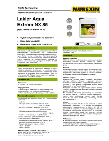 Karta Techniczna Technika klejenia wykładzin i parkietów KLT_NX85 Lakier Aqua Extrem NX 85 (Aqua Parkettlack Extrem NX 85) • wysoka wytrzymałość na ścieranie • klasa ścieralności C • doskonała odporność chemiczna Właściwości produktu Zgodność badania Poliuretanowy, jednoskładnikowy, wodorozcieńczalny lakier nawierzchniowy przeznaczony do zabezpieczania powierzchni parkietów i innych rodzajów posadzek drewnianych. Lakier tworzy wytrzymałą chemicznie powłokę o ekstremalnie dużej odporności na ścieranie i właściwościach podobnych do dwuskładnikowych lakierów do parkietu. Lakier odpowiada wymaganiom ÖNORM C 2354 z najwyższą klasą ścieralności C. Karta Charakterystyki (Karta Bezpieczeństwa) ÖNORM C 2354 Stosowanie Zalecane narzędzia: Wałek do lakierów wodnych (włókna z mikrofazy), pędzel, nierdzewna szpachla stalowa, wiadro do lakieru. Narzędzia zmyć czystą wodą natychmiast po zakończeniu pracy. Zastosowanie Podłoże: Posadzka drewniana musi być wolna od zanieczyszczeń, wosku, oleju i silikonu. Powierzchnia musi być starannie oczyszczona i odkurzona, gdyż pył na parkiecie uniemożliwi poprawne nałożenie lakieru nawierzchniowego. Lakier przeznaczony do lakierowania parkietów i innych rodzajów posadzek drewnianych w pomieszczeniach o normalnym i mocnym użytkowaniu. Ograniczony zakres stosowania w przypadku bruku drewnianego (tylko po wykonaniu prób). Nadaje się na ogrzewanie podłogowe. Do stosowania wewnątrz budynków. Obróbka wstępna: Powierzchnię parkietu należy dokładnie wyszlifować używając szlifierki bębnowej z papierem ściernym o uziarnieniu od 36 do 100, w kolejnych fazach szlifowania. Szczeliny i rysy wypełnić szpachlówką Murexin Aqua Fugenkit AV 10 lub Fugenkit LV 15. Następnie wykonać szlif wykańczający (papier ścierny 100-120) używając szlifierki bębnowej i szlifierki talerzowej z siatką 100-120. Na dokładnie odkurzoną powierzchnię, w zależności od gatunku drewna i przyjętego systemu lakierowania, nałożyć lakier podkładowy Murexin Aqua Specjal Grunt AV 20, lakier podkładowy Uniwersalny LV 45 lub Aqua Gel AV 30. Dane produktu Opakowanie: 5 l kanister (84 szt./420 l na palecie) Magazynowanie: W suchych, nie narażonych na ujemne temperatury pomieszczeniach, w oryginalnych opakowaniach. Okres przechowywania: 12 miesięcy od daty produkcji Parametry techniczne Dane dotyczą warunków: temperatura powietrza 20oC, wilgotność względna powietrza 55%. Zużycie: - przy użyciu wałka (1 warstwa): 100-120 ml/m2 (1litr na 8-10 m2) - przy użyciu szpachli (1 warstwa): 30-35 ml/m2 (1litr na 30-35 m2) Nakładanie następnej powłoki lakierniczej: - po ok. 4-5 godz. Końcowe utwardzenie: po ok. 8-10 dniach Klasa ścieralności zgodnie z ÖNORM C 2354: C Warunki aplikacji i utwardzania: - temperatura pomieszczenia, podłogi i lakieru: 16-22°C - wilgotność względna powietrza: 45-65%. Połyskliwość (stopień odbicia światła): - połysk: ~ 90 (60°) - półmat: ~ 15 (60°) NX85, ważna od: 08.05.2013, MKU, stron 3 Murexin Polska Sp. z o.o. 03-236 Warszawa, ul. Annopol 4A Tel.: +48 22 / 884 77 55, Fax: +48 22 / 814 53 31 e-mail: [email protected], Internet: www.murexin.pl Uwaga: Lakier Aqua Extrem NX 85 można nakładać na lakier podkładowy Uniwersalny LV 45 dopiero po całkowitym odparowaniu rozpuszczalników z lakieru LV 45, tj. po około 6-12 godzinach, w zależności od gatunku drewna i warunków klimatycznych pomieszczenia. W przypadku drewna egzotycznego okres ten powinien wynosić 12-24 godziny, w zależności od warunków klimatycznych pomieszczenia i gatunku drewna. Wykonanie: Kanister z lakierem pozostawić w pomieszczeniu aż do osiągnięcia temperatury pokojowej. Zawartość pojemnika dobrze wstrząsnąć a następnie przecedzić przez sitko i przelać do czystego wiadra. 1 Karta Techniczna Technika klejenia wykładzin i parkietów KLT_NX85 Za pomocą wałka do lakierów wodnych nałożyć równomiernie warstwę lakieru Extrem NX 85 - krzyżowo poprzecznie do słojów, a następnie wzdłuż słojów, unikając miejscowego nagromadzenia lakieru i tworzenia się kałuż. Kolejno nakładane pasma lakieru powinny lekko na siebie zachodzić. Przy normalnych obciążeniach nakładać 2 warstwy lakieru, a przy mocnych obciążeniach podłogi - 3 warstwy lakieru, każdorazowo zaczynając od brzegu pomieszczenia. Aby uzyskać warstwę lakieru o wymaganej grubości, należy nałożyć około 250-350 ml lakieru/1 m2 we wszystkich warstwach nawierzchniowych (w zależności od ilości warstw). Po nałożeniu pierwszej warstwy Extrem NX 85 należy odczekać ok. 4-5 godzin przed nałożeniem kolejnej. Przed położeniem ostatniej warstwy lakieru, polakierowaną powierzchnię należy zmatowić za pomocą szlifierki talerzowej z siatką o ziarnistości 120 lub 150 lub z drobniejszą ziarnistością, a następnie powierzchnię bardzo dokładnie oczyścić (odkurzyć) z pyłu. Lakierowaną powierzchnię można w pełni użytkować dopiero po całkowitym utwardzeniu lakieru, tj. po 10 dniach od ostatniego lakierowania. Perfekcyjny system Mocno obciążone powierzchnie - powierzchnie biurowe I. System: 1 x Aqua Specjal Grunt AV20 - nakładanie wałkiem lub 2 x Aqua Specjal Grunt AV20 - nakładanie szpachlą 3 x Aqua Extrem NX 85 - nakładanie wałkiem II. System: 1-2 x Lakier podkładowy LV45 - nakładanie wałkiem lub 2 x Lakier podkładowy LV45 - nakładanie szpachlą 3 x Aqua Extrem NX 85 - nakładanie wałkiem Normalnie obciążone powierzchnie - powierzchnie mieszkalne I. System: 1 x Aqua Specjal Grunt AV20 - nakładanie wałkiem lub 2 x Aqua Specjal Grunt AV20 - nakładanie szpachlą 2 x Aqua Extrem NX 85 - nakładanie wałkiem II. System: 1-2 x Lakier podkładowy LV45 - nakładanie wałkiem lub 2 x Lakier podkładowy LV45 - nakładanie szpachlą 2 x Aqua Extrem NX 85 - nakładanie wałkiem Dodatkowe informacje: Nie zaleca się wylewania lakieru bezpośrednio na posadzkę drewnianą (nale