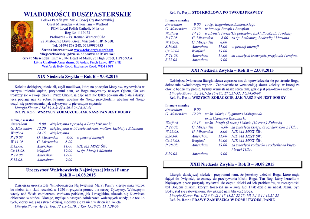 WIADOMOŚCI DUSZPASTERSKIE Polska Parafia pw. Matki Bożej Częstochowskiej Great Missenden – Amersham – Watford PCM Local Polish Catholic Mission Reg No 1119423 Proboszcz – ks. Roman Werner SChr 22 Misbourne Drive, Great Missenden HP16 0BL Tel. 01494 868 248; 07759980733 Strona internetowa: www.tchr.org/amersham Miejsca/kościoły, gdzie są odprawiane Msze św.: Great Missenden; Immaculate Heart of Mary, 23 High Street, HP16 9AA Little Chalfont-Amersham: St Aidan, Finch Lane, HP7 9NE Watford: Holy Rood, Exchange Road, WD18 0PJ Ref. Ps. Resp.: STOI KRÓLOWA PO TWOJEJ PRAWICY Intencje mszalne Amersham G. Missenden Watford P.17.08. W.18.08. S.19.08. Cz.20.08. P.21.08. S.22.08. 9.00 za śp. Eugeniusza Jankowskiego 12.20 w intencji Parafii i Parafian 14.15 o zdrowie i wszelkie potrzebne łaski dla Józefa i rodziny G. Missenden 8.00 za śp. Ludomirę, Leokadię i Mariana G. Missenden 8.00 Amersham 11.00 w pewnej intencji Watford 19.00 Amersham 19.00 za zmarłych krewnych, przyjaciół i znajom. Amersham 9.00 XXI Niedziela Zwykła – Rok B – 23.08.2015 XIX Niedziela Zwykła – Rok B – 9.08.2015 Kolekta dzisiejszej niedzieli, czyli modlitwa, którą na początku Mszy św. wypowiada w naszym imieniu kapłan, przypomni nam, że Boga nazywamy naszym Ojcem, On zaś troszczy się o swoje dzieci. Przez Chrystusa daje nam nie tylko pokarm dla ciała i duszy, lecz pociąga nas ku sobie. Pragnie, abyśmy do Niego przychodzili, abyśmy od Niego uczyli się przebaczenia, jak usłyszymy w pierwszym czytaniu. Liturgia Słowa: 1 Krl 19,4-8; Ef 4,30-5.2; J 6,41-51 Ref. Ps. Resp.: WSZYSCY ZOBACZCIE, JAK NASZ PAN JEST DOBRY Intencje mszalne Amersham G. Missenden Watford P.10.08. W.11.08. S.12.08. Cz.13.08. P.14.08. S.15.08. 9.00 dziękczynna z prośbą o Bożą łaskawość 12.20 dziękczynna w 50 lecie sakram. małżeń. Elżbiety i Edmunda 14.15 dziękczynna G. Missenden 8.00 w pewnej intencji G. Missenden 8.00 Amersham 11.00 NIE MA MSZY ŚW. Watford 19.00 za śp. Marię i Michała Amersham 19.00 Amersham 9.00 Dzisiejsza świąteczna liturgia słowa zaprasza nas do opowiedzenia się po stronie Boga, dokonania świadomego wyboru. Zaproszenie to wzmacniają słowa kolekty, w której za chwilę będziemy prosić, byśmy wznieśli nasze serca tam, gdzie jest prawdziwa radość. Liturgia Słowa: Joz 24,1-2a.15-18b; Ef 5,21-32; J 6,54.60-69 Ref. Ps. Resp.: WSZYSCY ZOBACZCIE, JAK NASZ PAN JEST DOBRY Intencje mszalne Amersham G. Missenden Watford P.24.08. W.25.08. S.26.08. Cz.27.08. P.28.08. S.29.08. 9.00 12.20 za śp. Marię i Zygmunta Maligranda oraz Czesława Kaczmarka 14.15 za śp. Józefa (2 rocz.) i Marię (10 rocz.) Kubacką G. Missenden 8.00 za zmarłych księży, braci kleryków z TChr. G. Missenden 8.00 NIE MA MSZY ŚW. Amersham 11.00 NIE MA MSZY ŚW. Watford 19.00 NIE MA MSZY ŚW. Amersham 19.00 za zmarłych rodziców i rodzeństwo księży i braci TChr. Amersham 9.00 XXII Niedziela Zwykła – Rok B – 30.08.2015 Uroczystość Wniebowzięcia Najświętszej Maryi Panny Rok B – 16.08.2015 Dzisiejsza uroczystość Wniebowzięcia Najświętszej Maryi Panny kieruje nasz wzrok ku niebu, tam skąd również w 1920 r. przyszła pomoc dla naszej Ojczyzny. Walczącym wtedy nad Wisłą żołnierzom, zarówno polskim, jak i rosyjskim, ukazała się Niewiasta obleczona w słońce. Dlatego, myśląc o naszych żołnierzach walczących wtedy, ale też i o tych, którzy mają nas strzec dzisiaj, módlmy się za nich w dzień ich święta. Liturgia Słowa: Ap 11, 19a; 12,1.3-6a.10; 1 Kor 15,10-26; Łk 1,39-56 Liturgia dzisiejszej niedzieli przypomni nam, że jesteśmy dziećmi Boga, które mają dążyć do świętości, to znaczy do przebywania blisko Boga. Ten Bóg, który Izraelitom błądzącym przez pustynię wydawał się często daleki od ich problemów, w rzeczystości był Bogiem bliskim, którym troszczył się o swój lud. I tak dzieje się nadal. Jezus, Syn Boży, stał się człowiekiem, aby ukazać nam bliskość Boga. Liturgia Słowa: Pwt 4,12.6-8; Jk 1,17-18.21-22.27; Mk 7,1-8.14-15.21-23 Ref. Ps. Resp.: PRAWY ZAMIESZKA W DOMU TWOIM, PANIE Intencje mszalne Amersham G. Missenden Watford P.31.08. W.1.09. S.2.09. Cz.3.09. P.4.09. S.5.09. 9.00 12.20 14.15 OGŁOSZENIA PARAFIALNE w intencji Parafii i Parafian o Boże błogosławieństwo i opiekę Matki Najświętszej dla Adali i jej rodziny G. Missenden 8.00 G. Missenden 8.00 w intencji Ojczyzny Amersham 11.00 Watford 19.00 w pewnej intencji Amersham 19.00 za śp. Marię i Michała Amersham 9.30 o Boże błogosławieństwo w Roku Szkolnym 2015/16 XXIII Niedziela Zwykła – Rok B – 6.09.2015 Różne są motywy zwracania się człowieka do Boga: dziękczynienie, prośba, wołanie o pomoc, o wsparcie w trudach, o pocieszenie w cierpieniu... Przychodzimy na niedzielną Mszę św. nie tylko po to, aby wypełnić chrześcijański obowiązek uświęcenia dnia Pańskiego, ale przede wszystkim, aby oddać chwałę Bogu. Liturgia Słowa: Iz 35,4-7a; Jk 2,1-5; Mk 7,31-37 Ref. Ps. Resp.: CHWAL, DUSZO MOJA, PANA, STWÓRCĘ SWEGO • • • • • Intencje mszalne Amersham G. Missenden Watford P.7.09. W.8.09. S.9.09. Cz.10.09. P.11.09. S.12.09. 9.00 12.20 za zmarłych parafian i duszpasterzy 14.15 za śp. Cecylię i Wendlina Kubacka G. Missenden 8.00 za śp. Łucję i Alfreda Powieckich G. Missenden 8.00 w pewnej intencji Amersham 11.00 Watford 19.00 za zmarłych kapłanów PMK i ich rodziców Amersham 19.00 za dusze w czyśćcu cierpiące Amersham 8.30 KRONIKA PARAFIALNA CHRZTY: W naszej Wspólnocie Parafialnej zostali ochrzczeni: 14.06.2015: 1/ Julia GULACSI, c. Geza i Karoliny; 2/ Olivia SAMUEL, c. Anthony i Moniki; 19.07.2015: 1/ Leon PRZYBYSZEWSKI, s. Pawła i Magdaleny; 2/ Tomas KITT, s. Nathan i Marysi; Alice KANAFA, c. Andreja i Magdaleny. Niech wzrastają w łasce u Boga i ludzi! ZAPOWIEDZI: Do sakramentu małżeństwa przygotowują się: 1/ Marcin SEŃKÓW, zam Watford oraz Roksana STROJNA, zam. Watford; 2/ Gereth CAMPION, zam. Chesham oraz Joa
