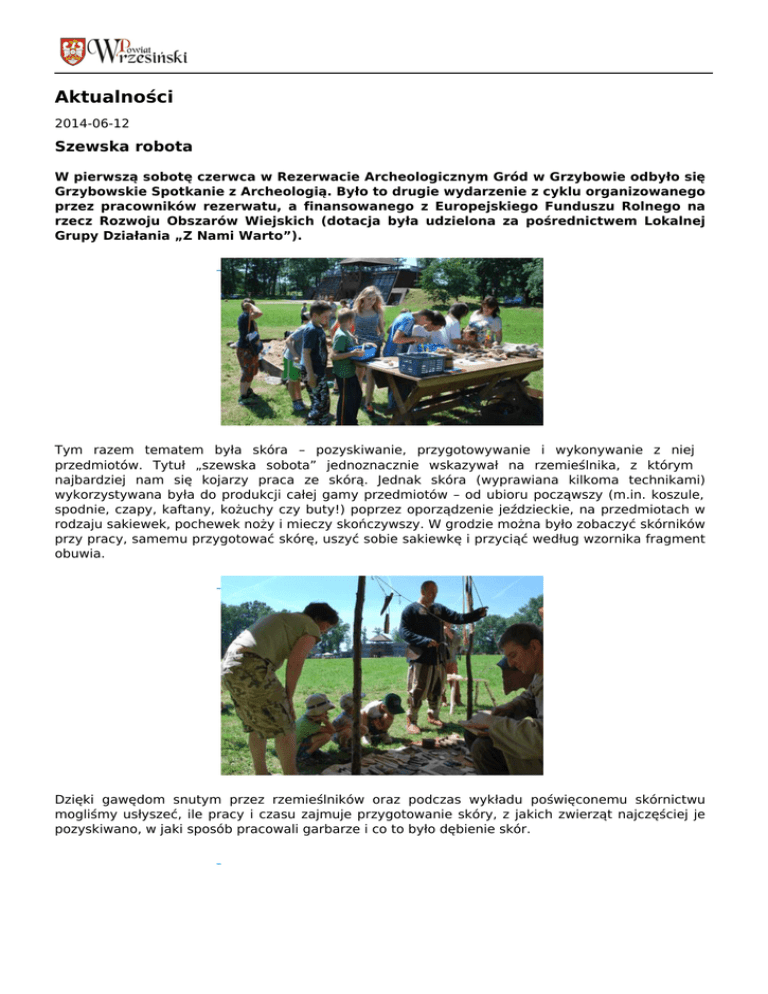 Aktualności 2014-06-12 Szewska robota W pierwszą sobotę czerwca w Rezerwacie Archeologicznym Gród w Grzybowie odbyło się Grzybowskie Spotkanie z Archeologią. Było to drugie wydarzenie z cyklu organizowanego przez pracowników rezerwatu, a finansowanego z Europejskiego Funduszu Rolnego na rzecz Rozwoju Obszarów Wiejskich (dotacja była udzielona za pośrednictwem Lokalnej Grupy Działania „Z Nami Warto”). Tym razem tematem była skóra – pozyskiwanie, przygotowywanie i wykonywanie z niej przedmiotów. Tytuł „szewska sobota” jednoznacznie wskazywał na rzemieślnika, z którym najbardziej nam się kojarzy praca ze skórą. Jednak skóra (wyprawiana kilkoma technikami) wykorzystywana była do produkcji całej gamy przedmiotów – od ubioru począwszy (m.in. koszule, spodnie, czapy, kaftany, kożuchy czy buty!) poprzez oporządzenie jeździeckie, na przedmiotach w rodzaju sakiewek, pochewek noży i mieczy skończywszy. W grodzie można było zobaczyć skórników przy pracy, samemu przygotować skórę, uszyć sobie sakiewkę i przyciąć według wzornika fragment obuwia. Dzięki gawędom snutym przez rzemieślników oraz podczas wykładu poświęconemu skórnictwu mogliśmy usłyszeć, ile pracy i czasu zajmuje przygotowanie skóry, z jakich zwierząt najczęściej je pozyskiwano, w jaki sposób pracowali garbarze i co to było dębienie skór. Prócz skórników tradycyjnie na grzybowskim grodzie pojawili się inni rzemieślnicy – garncarze, kowale, tkacze, snycerze i stolarze. Była możliwość wejścia do zagrody, gdzie codziennymi zajęciami zajmowali się ludzie z czasów piastowskich. Można było się od nich dowiedzieć, ile czasu poświęcano na te prace i spróbować je wykonać przy pomocy różnych narzędzi. Chętni pracowali na warsztacie tkackim i wykuwali przedmioty z żelaza na polowej kuźni. Obok rzemieślników historycznych pojawili się współcześni rzemieślnicy, którzy starają się zachowywać tradycyjne techniki lub wzornictwo. Specjalnie dla najmłodszych do grodu dotarł teatr z przedstawieniem mówiącym o tym, że nie warto zazdrościć innym, ale należy być sobą i starać się jak najlepiej wykonywać swoje obowiązki. Tradycyjnie też na dzieci czekała Akademia Małego Archeologa, gdzie można było odkryć zabytki i dowiedzieć się, co z nich można „wyczytać” i dlaczego je chronimy. Już teraz zapraszamy na kolejne Grzybowskie Spotkanie z Archeologią, które odbędzie się 5 lipca. Jacek Wrzesiński