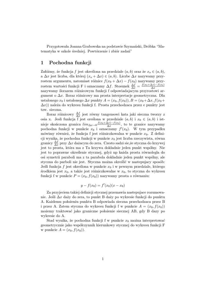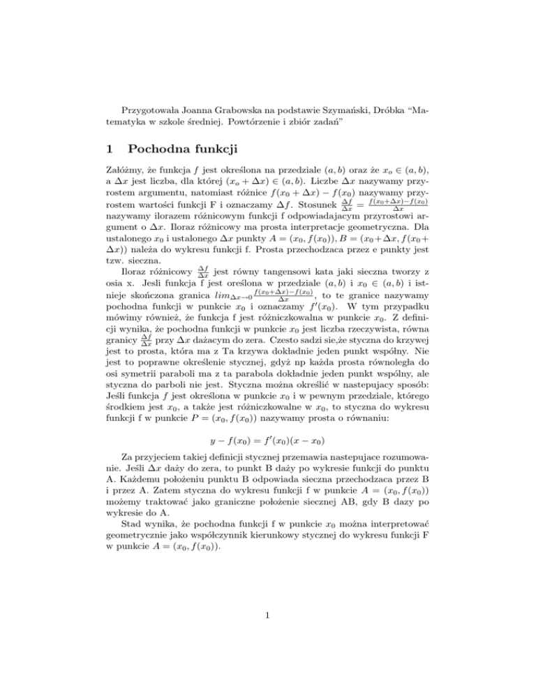 Przygotowala Joanna Grabowska na podstawie Szymański, Dróbka “Matematyka w szkole średniej. Powtórzenie i zbiór zadań” 1 Pochodna funkcji Zalóżmy, że funkcja f jest określona na przedziale (a, b) oraz że xo ∈ (a, b), a ∆x jest liczba, dla której (xo + ∆x) ∈ (a, b). Liczbe ∆x nazywamy przyrostem argumentu, natomiast różnice f (x0 + ∆x) − f (x0 ) nazywamy przyf (x0 +∆x)−f (x0 ) rostem wartości funkcji F i oznaczamy ∆f . Stosunek ∆f ∆x = ∆x nazywamy ilorazem różnicowym funkcji f odpowiadajacym przyrostowi argument o ∆x. Iloraz różnicowy ma prosta interpretacje geometryczna. Dla ustalonego x0 i ustalonego ∆x punkty A = (x0 , f (x0 )), B = (x0 +∆x, f (x0 + ∆x)) należa do wykresu funkcji f. Prosta przechodzaca przez e punkty jest tzw. sieczna. Iloraz różnicowy ∆f ∆x jest równy tangensowi kata jaki sieczna tworzy z osia x. Jesli funkcja f jest oreślona w przedziale (a, b) i x0 ∈ (a, b) i ist(x0 ) nieje skończona granica lim∆x→0 f (x0 +∆x)−f , to te granice nazywamy ∆x pochodna funkcji w punkcie x0 i oznaczamy f ′ (x0 ). W tym przypadku mówimy również, że funkcja f jest różniczkowalna w punkcie x0 . Z definicji wynika, że pochodna funkcji w punkcie x0 jest liczba rzeczywista, równa granicy ∆f ∆x przy ∆x dażacym do zera. Czesto sadzi sie,że styczna do krzywej jest to prosta, która ma z Ta krzywa dokladnie jeden punkt wspólny. Nie jest to poprawne określenie stycznej, gdyż np każda prosta równolegla do osi symetrii paraboli ma z ta parabola dokladnie jeden punkt wspólny, ale styczna do parboli nie jest. Styczna można określić w nastepujacy sposób: Jeśli funkcja f jest określona w punkcie x0 i w pewnym przedziale, którego środkiem jest x0 , a także jest różniczkowalne w x0 , to styczna do wykresu funkcji f w punkcie P = (x0 , f (x0 )) nazywamy prosta o równaniu: y − f (x0 ) = f ′ (x0 )(x − x0 ) Za przyjeciem takiej definicji stycznej przemawia nastepujace rozumowanie. Jeśli ∆x daży do zera, to punkt B daży po wykresie funkcji do punktu A. Każdemu polożeniu punktu B odpowiada sieczna przechodzaca przez B i przez A. Zatem styczna do wykresu funkcji f w punkcie A = (x0 , f (x0 )) możemy traktować jako graniczne polożenie siecznej AB, gdy B dazy po wykresie do A. Stad wynika, że pochodna funkcji f w punkcie x0 można interpretować geometrycznie jako wspólczynnik kierunkowy stycznej do wykresu funkcji F w punkcie A = (x0 , f (x0 )). 1 2 Pochodna jako funkcja Niech Df′ oznacza zbiór wszystkich argumentów x funkcji f, dla których istnieje pochodna f ′ (x). Rozpatrzmy funkcje, która każdej liczbie x ∈ Df′ przyporzadkowuje f ′ (x). Funkcje te nazywamy pochodna funkcji f i oznaczamy f’. W takim razie pochodna funkcji f jest funkcja, natomiast pochodna funkcji f w punkcie x0 jest liczba. Te dwa pojecia nalzeży odróżniać. [cf (x)]′ = cf ′ (x) [f(x) + g(x)]’ = f’(x) + g’(x) [f(x) - g(x)]’ = f’(x) - g’(x) [f(x) g(x)]’ = f’(x)g(x) + f(x)g’(x) f ′ (x) g ′ (x) = f ′ (x)g(x)−f (x)g ′ (x) g 2 (x) g(x) 6= 0 2.1 Pochodne niektórych funckji 1) (c)’ = 0, c - ustalona liczba rzeczywista 2) (xa )′ = axa−1 ; a ∈ R 3) (sin x)′ = cos x 4) (cos x)’ = -sin x 5) (tgx)′ = cos12 x 6) (ctgx)′ = − sin12 x 7) (ex )′ = ex 8) (ax )′ = ax lna, a ∈ R+ − 1 9) (lnx)′ = x1 1 10) (loga x)′ = xlna 2 3 Przykladowe zadania 3.1 Zadanie 1 Wyznaczyć pochodna funkcji f (x) = x2 + 2x − 1 Rozwiazanie: Aby roziwazać to zadanie wyznaczamy iloraz różnicowy funkcji. (x) f ′ (x) = lim ∆x → 0 f (x+∆x)−f = ∆x = lim ∆x → 0 [(x+∆x) 2 +2(x+∆x)−1]−(x2 +2x−1) ∆x 2 = 0 [(∆x) +2x∆x+2∆x) ∆x = lim ∆x → lim ∆x → 0(∆x + 2x + 2) = 2x + 2 Znaczy to, że pochodna rozpatrywnej funkcji f jest funkcja f’określona wzorem f ′ (x) = 2x + 2. Inaczej (x2 + 2x − 1)′ = 2x + 2 W praktyce wyznaczajac pochodnafunkcji korzystamy z odpowiednich wzorów i twierdzeń ulatwiajacych obliczenia, podanych powyżej. 3.2 Zadanie 2 Wyznaczyć pochodna funkcji f (x) = x2 −2x+3 x2 +x+1 Rozwiazanie: 2 ′ 2 2 +x+1)′ (x2 −2x+3) f ′ (x) = (x −2x+3) (x +x+1)−(x = (x2 +x+1)2 = = (2x−2)(x2 +x+1)−(2x+1)(x2 −2x+3) (x2 +x+1) 3x2 −4x−5 (x2 +x+1)2 3.3 = Zadanie 3 Wykazać, że (ex )′ = ex Rozwiazanie: (ex )′ = lim∆x→0 e ∆x = lim∆x→0 ex e ∆x−1 = ∆x lim∆x→0 ex lim∆x→0 e ∆x−1 ∆x = ex lim∆x→0 e ∆x−1 ∆x Wyrażenie lim∆x→0 e ∆x−1 = 1. x+∆x −ex ∆x 3 =