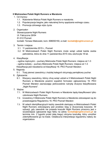 II Mistrzostwa Polski Night Runners w Maratonie 1. Cel imprezy: 1.1. Wyłonienie Mistrza Polski Night Runners w maratonie. 1.2. Popularyzacja biegów, jako naturalnej formy spędzania wolnego czasu. 1.3. Promocja zdrowego stylu życia. 2. Organizator: Stowarzyszenie Night Runners Ul. Fabryczna 29/54 61-512 Poznań kontakt: Tomasz Makowski, kom. 698050150, e-mail: [email protected] 3. Termin i miejsce: 3.1. 11 października 2015 r., Poznań 3.2. W Mistrzostwach Polski Night Runners może wziąć udział każda osoba pełnoletnia, która do dnia 11 października 2015 roku ukończyła 18 lat. 4. Klasyfikacja: - ogólna mężczyźni – puchary Mistrzostw Polski Night Runners: miejsca od 1-3 - ogólna kobiety – puchary Mistrzostw Polski Night Runners: miejsca od 1-3 Klasyfikacja jest niezależna od klasyfikacji 16. PKO Poznań Maraton 5. Nagrody: 5.1. Trzej pierwsi zawodnicy z każdej kategorii otrzymają pamiątkowy puchar. 6. Zgłoszenia: 6.1. Wszyscy zawodnicy, którzy chcą wziąć udział w II Mistrzostwach Polski Night Runners w Maratonie powinni wypełnić formularz zgłoszeniowy 16. PKO Poznań Maraton zaznaczając jednocześnie rubrykę drużyna klasyfikowana „Night Runners". 7. Ważne: 7.1. W Mistrzostwach Polski Night Runners w Maratonie będą klasyfikowani tylko członkowie Night Runners. 7.2. Uczestnicy II Mistrzostw Polski Night Runners w Maratonie zobowiązani są do przestrzegania Regulaminu 16. PKO Poznań Maraton 7.3. W celach identyfikacyjnych każdy zawodnik startujący w Mistrzostwach Polski Night Runners zobowiązany jest przebiec bieg w drużynowej koszulce. W sytuacji, gdy zawodnik nie posiada koszulki Night Runners proszony jest o wcześniejsze zgłoszenie tego faktu na adres [email protected] (w terminie min. 2 tygodni przed datą biegu) otrzyma koszulkę, który umożliwi zidentyfikowanie go na trasie. Ostateczna interpretacja regulaminu należy do organizatora