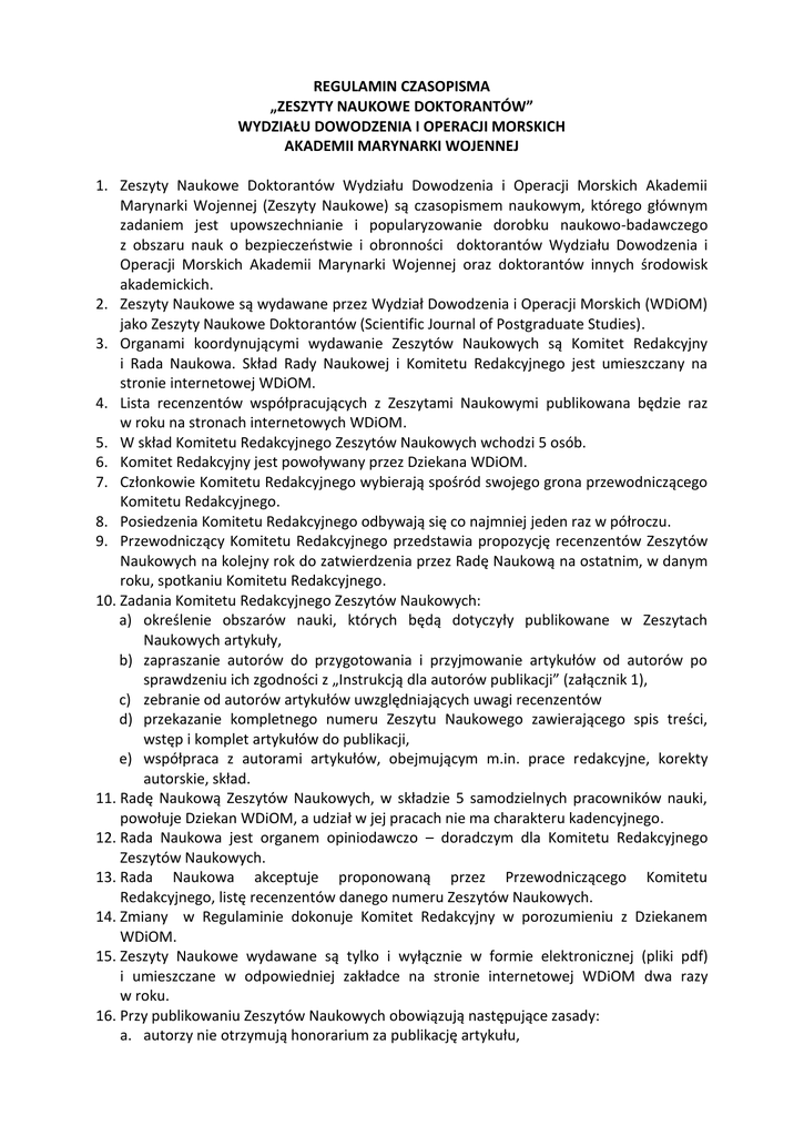 REGULAMIN CZASOPISMA „ZESZYTY NAUKOWE DOKTORANTÓW” WYDZIAŁU DOWODZENIA I OPERACJI MORSKICH AKADEMII MARYNARKI WOJENNEJ 1. Zeszyty Naukowe Doktorantów Wydziału Dowodzenia i Operacji Morskich Akademii Marynarki Wojennej (Zeszyty Naukowe) są czasopismem naukowym, którego głównym zadaniem jest upowszechnianie i popularyzowanie dorobku naukowo-badawczego z obszaru nauk o bezpieczeostwie i obronności doktorantów Wydziału Dowodzenia i Operacji Morskich Akademii Marynarki Wojennej oraz doktorantów innych środowisk akademickich. 2. Zeszyty Naukowe są wydawane przez Wydział Dowodzenia i Operacji Morskich (WDiOM) jako Zeszyty Naukowe Doktorantów (Scientific Journal of Postgraduate Studies). 3. Organami koordynującymi wydawanie Zeszytów Naukowych są Komitet Redakcyjny i Rada Naukowa. Skład Rady Naukowej i Komitetu Redakcyjnego jest umieszczany na stronie internetowej WDiOM. 4. Lista recenzentów współpracujących z Zeszytami Naukowymi publikowana będzie raz w roku na stronach internetowych WDiOM. 5. W skład Komitetu Redakcyjnego Zeszytów Naukowych wchodzi 5 osób. 6. Komitet Redakcyjny jest powoływany przez Dziekana WDiOM. 7. Członkowie Komitetu Redakcyjnego wybierają spośród swojego grona przewodniczącego Komitetu Redakcyjnego. 8. Posiedzenia Komitetu Redakcyjnego odbywają się co najmniej jeden raz w półroczu. 9. Przewodniczący Komitetu Redakcyjnego przedstawia propozycję recenzentów Zeszytów Naukowych na kolejny rok do zatwierdzenia przez Radę Naukową na ostatnim, w danym roku, spotkaniu Komitetu Redakcyjnego. 10. Zadania Komitetu Redakcyjnego Zeszytów Naukowych: a) określenie obszarów nauki, których będą dotyczyły publikowane w Zeszytach Naukowych artykuły, b) zapraszanie autorów do przygotowania i przyjmowanie artykułów od autorów po sprawdzeniu ich zgodności z „Instrukcją dla autorów publikacji” (załącznik 1), c) zebranie od autorów artykułów uwzględniających uwagi recenzentów d) przekazanie kompletnego numeru Zeszytu Naukowego zawierającego spis treści, wstęp i komplet artykułów do publikacji, e) współpraca z autorami artykułów, obejmującym m.in. prace redakcyjne, korekty autorskie, skład. 11. Radę Naukową Zeszytów Naukowych, w składzie 5 samodzielnych pracowników nauki, powołuje Dziekan WDiOM, a udział w jej pracach nie ma charakteru kadencyjnego. 12. Rada Naukowa jest organem opiniodawczo – doradczym dla Komitetu Redakcyjnego Zeszytów Naukowych. 13. Rada Naukowa akceptuje proponowaną przez Przewodniczącego Komitetu Redakcyjnego, listę recenzentów danego numeru Zeszytów Naukowych. 14. Zmiany w Regulaminie dokonuje Komitet Redakcyjny w porozumieniu z Dziekanem WDiOM. 15. Zeszyty Naukowe wydawane są tylko i wyłącznie w formie elektronicznej (pliki pdf) i umieszczane w odpowiedniej zakładce na stronie internetowej WDiOM dwa razy w roku. 16. Przy publikowaniu Zeszytów Naukowych obowiązują następujące zasady: a. autorzy nie otrzymują honorarium za publikację artykułu, b. Zeszyty Naukowe publikowane są w czerwcu i grudniu każdego roku, c. objętośd Zeszytu Naukowego wynosi nie mniej niż 4 arkuszy wydawniczych, a liczba artykułów opublikowanych w ciągu roku powinna wynosid nie mniej niż 16, d. artykuły mogą byd publikowane w języku innym niż polski, e. objętośd artykułu naukowego zamieszczonego w Zeszycie Naukowym nie może byd mniejsza niż 0,5 arkusza wydawniczego i nie większa niż 1,0 arkusz wydawniczy, f. wraz z tekstem artykułu autor jest zobowiązany: złożyd oświadczenie, że utwór nie był dotąd publikowany; jego treśd i materiał ilustracyjny nie naruszają osobistych i majątkowych praw osób trzecich; podad swoją afiliację oraz określid opisowo i procentowo indywidualny twórczy wkład poszczególnych współautorów w powstanie utworu (załącznik 2), g. do oceny każdego artykułu naukowego powołuje się recenzenta, posiadającego co najmniej stopieo naukowy doktora, będącego pracownikiem nauki z obszaru naukowo-badawczego, który jest przedmiotem publikacji, h. artykuł przesyłany do recenzenta nie może zawierad danych identyfikujących autora, ani ich afiliacji; obowiązuje zasada nie ujawniania swoich tożsamości między autorami i recenzentami, i. recenzja artykułu jest sporządzana w formie pisemnej na formularzu recenzji zatwierdzonym przez Komitet Redakcyjny (załącznik 3), j. publikacja zrecenzowanego artykułu następuje po uwzględnieniu przez autora uwag recenzenta jeśli nie mają one charakteru uwag polemicznych, k. Zeszyty Naukowe będą indeksowane w co najmniej jednej bazie danych i wprowadzane do zasobów sieci informatycznych. 17. Artykuł powinien zostad złożony w terminie i trybie określonym w Instrukcji dla autorów publikacji (załącznik 1). 18. Zgłoszenie pracy musi zawierad: a) artykuł w formacie pdf i doc. przesłany drogą elektroniczną na adres: [email protected], b) artykuł w formie drukowanej, c) oryginał oświadczenia, stanowiącego załącznik 2 do niniejszego Regulaminu, d) opinia recenzenta. 19. Sprawy sporne z autorami artykułów rozstrzyga Komitet Redakcyjny w porozumieniu z Rada Naukową. Załącznik 1 INSTRUKCJA DLA AUTORÓW PUBLIKACJI Uwagi dla autorów Artykuły należy dostarczać w wersjach: - elektronicznej, w formacie edytora Word (*.doc, *.docx - Office 2003 lub nowszy) oraz - papierowej (dwa egzemplarze). Artykuł powinien mieć parzystą liczbę stron i nie przekraczać objętości jednego arkusza autorskiego. W przypadku artykułów pisanych we współautorstwie Redakcja wymaga ujawnienia wkładu poszczególnych autorów w powstanie publikacji (z podaniem ich afiliacji oraz informacji o autorstwie koncepcji, założeń, metod itp. wykorzystywanych przy przygotowaniu artykułu). Artykuł należy dostarczyć: edycja czerwiec do 15 maja, edycja grudzień do 15 listopada. Wymogi formalne dla artykułu 1. Format artykułu o o o rozmiar papieru - B5, marginesy: Lewy, Prawy 25 mm, Góra, Dół 20