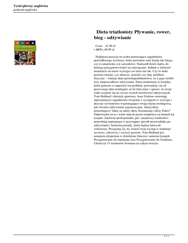 Tytuł główny nagłówka podtytuł nagłówka Dieta triatlonisty Pływanie, rower, bieg - odżywianie Cena: 41.90 zł (-16%) 49.99 zł Najlepsza pozycja na rynku poruszająca zagadnienia prawidłowego żywienia, które powinien znać każdy kto biega, czy to amatorsko czy zawodowo. Nadszedł dzień startu, do którego przygotowywałeś się miesiącami. Jednak w którymś momencie na trasie wyścigu coś idzie nie tak. Czy to niski poziom energii, czy skurcze, senność czy inny problem fizyczny – istnieje duże prawdopodobieństwo, że u jego źródeł leży nieprawidłowe odżywianie. Dieta triatlonisty to książka która pomoże ci naprawić ten problem, prowadząc cię od pierwszego dnia treningów aż do linii mety i sprawi, że twoje ciało wespnie się na szczyt swoich możliwości atletycznych. Tom Holland i dietetyk sportowy Amy Godson omawiają najważniejsze zagadnienia związane z występem w wyścigu i decyzje żywieniowe wspomagające twoją rutynę treningową, jak również odżywianie regeneracyjne. Jakiej diety potrzebujesz? Jakie są zalety diety bezmięsnej i diety Paleo? Odpowiedzi na te i wiele innych pytań znajdziesz na łamach tej książki. Zarówno profesjonalni, jak i amatorscy triatloniści potrzebują napisanego w przystępny sposób przewodnika po odżywianiu i fachowej porady, która będzie łatwa do wdrożenia. Przygotuj się, by wnieść twój występ w triatlonie na nowy, zdrowszy i wyższy poziom. Tom Holland jest uznanym ekspertem w dziedzinie fitnessu i autorem książek Przygotowanie do maratonu oraz Przygotowanie do Triatlonu. Ukończył 15 triatlonów Ironman na całym świecie. 1/1 Powered by TCPDF (www.tcpdf.org)