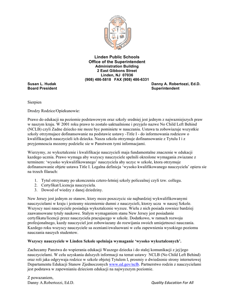 Linden Public Schools Office of the Superintendent Administration Building 2 East Gibbons Street Linden, NJ 07036 (908) 486-5818 FAX (908) 486-6331 Susan L. Hudak Board President Danny A. Robertozzi, Ed.D. Superintendent Sierpien Drodzy Rodzice/Opiekunowie: Prawo do edukacji na poziomie podstawowym oraz szkoly sredniej jest jednym z najwazniejszych praw w naszym kraju. W 2001 roku prawo to zostalo uaktualnione i przyjelo nazwe No Child Left Behind (NCLB) czyli Zadne dziecko nie moze byc pominiete w nauczaniu. Ustawa ta zobowiazuje wszystkie szkoly otrzymujace dofinansowanie na podstawie ustawy -Title I - do informowania rodzicow o kwalifikacjach nauczycieli ich dziecka. Nasza szkola otrzymuje dofinansowanie z Tytulu I i z przyjemnoscia mozemy podzielic sie w Panstwem tymi informacjami. Wierzymy, ze wyksztalcenie i kwalifikacje nauczycieli maja fundamentalne znaczenie w edukacji kazdego ucznia. Prawo wymaga aby wszyscy nauczyciele spelnili okreslone wymagania zwiazane z terminem: ‘wysoko wykwalifikowanego’ nauczyciela aby uczyc w szkole, ktora otrzymuje dofinansowanie objete ustawa Title I. Legalna definicja ‘wysoko kwalifikowanego nauczyciela’ opiera sie na trzech filarach: 1. Tytul otrzymany po ukonczeniu cztero-letniej szkoly policealnej czyli tzw. collegu. 2. Certyfikat/Licencja nauczyciela. 3. Dowod of wiedzy z danej dziedziny. New Jersey jest jednym ze stanow, ktory moze poszczycic sie najbardziej wykwalifikowanymi nauczycielami w kraju i jestesmy niezmiernie dumni z nauczycieli, ktorzy ucza w naszej Szkole. Wszyscy nasi nauczyciele posiadaja wyksztalcenie wyzsze. Wielu z nich posiada rowniez bardziej zaawansowane tytuly naukowe. Stalym wymaganiem stanu New Jersey jest posiadanie certyfikatu/licencji przez nauczyciela pracujacego w szkole. Dodatkowo, w ramach rozwoju profesjonalnego, kazdy nauczyciel jest zobowiazany do rozwijania swoich umiejetnosci nauczania. Kazdego roku wszyscy nauczyciele sa oceniani/ewaluowani w celu zapewnienia wysokiego poziomu nauczania naszych studentow. Wszyscy nauczyciele w Linden Szkole spelniaja wymaganie ‘wysoko wyksztalconych’. Zachecamy Panstwa do wspierania edukacji Waszego dziecka i do stalej komunikacji z jej/jego nauczycielami. W celu uzyskania dalszych informacji na temat ustawy NCLB (No Child Left Behind) oraz roli jaka odgrywaja rodzice w szkole objetej Tytulem I, prosmiy o dwiedzenie strony internetowej Departamentu Edukacji Stanow Zjednoczonych www.ed.gov/nclb. Partnerstwo rodzin z nauczycielami jest podstawa w zapewnianiu dzieciom edukacji na najwyzszym poziomie. Z powazaniem, Danny A.Robertozzi, Ed.D. QualityEducationForAll