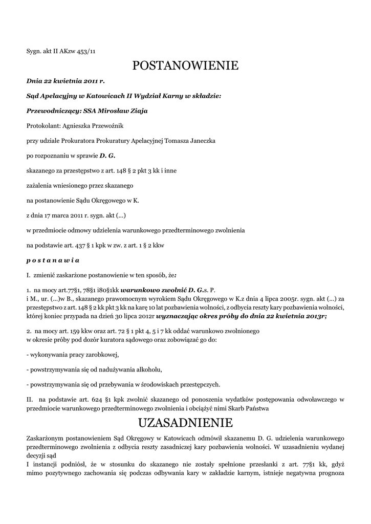 Sygn. akt II AKzw 453/11 POSTANOWIENIE Dnia 22 kwietnia 2011 r. Sąd Apelacyjny w Katowicach II Wydział Karny w składzie: Przewodniczący: SSA Mirosław Ziaja Protokolant: Agnieszka Przewoźnik przy udziale Prokuratora Prokuratury Apelacyjnej Tomasza Janeczka po rozpoznaniu w sprawie D. G. skazanego za przestępstwo z art. 148 § 2 pkt 3 kk i inne zażalenia wniesionego przez skazanego na postanowienie Sądu Okręgowego w K. z dnia 17 marca 2011 r. sygn. akt (...) w przedmiocie odmowy udzielenia warunkowego przedterminowego zwolnienia na podstawie art. 437 § 1 kpk w zw. z art. 1 § 2 kkw postanawia I. zmienić zaskarżone postanowienie w ten sposób, że: 1. na mocy art.77§1, 78§1 i80§1kk warunkowo zwolnić D. G.s. P. i M., ur. (...)w B., skazanego prawomocnym wyrokiem Sądu Okręgowego w K.z dnia 4 lipca 2005r. sygn. akt (...) za przestępstwo z art. 148 § 2 kk pkt 3 kk na karę 10 lat pozbawienia wolności, z odbycia reszty kary pozbawienia wolności, której koniec przypada na dzień 30 lipca 2012r wyznaczając okres próby do dnia 22 kwietnia 2013r; 2. na mocy art. 159 kkw oraz art. 72 § 1 pkt 4, 5 i 7 kk oddać warunkowo zwolnionego w okresie próby pod dozór kuratora sądowego oraz zobowiązać go do: - wykonywania pracy zarobkowej, - powstrzymywania się od nadużywania alkoholu, - powstrzymywania się od przebywania w środowiskach przestępczych. II. na podstawie art. 624 §1 kpk zwolnić skazanego od ponoszenia wydatków postępowania odwoławczego w przedmiocie warunkowego przedterminowego zwolnienia i obciążyć nimi Skarb Państwa UZASADNIENIE Zaskarżonym postanowieniem Sąd Okręgowy w Katowicach odmówił skazanemu D. G. udzielenia warunkowego przedterminowego zwolnienia z odbycia reszty zasadniczej kary pozbawienia wolności. W uzasadnieniu wydanej decyzji sąd I instancji podniósł, że w stosunku do skazanego nie zostały spełnione przesłanki z art. 77§1 kk, gdyż mimo pozytywnego zachowania się podczas odbywania kary w zakładzie karnym, istnieje negatywna prognoza kryminologiczno-społeczna. Sąd Okręgowy wskazał na nader niekorzystne okoliczności popełnionego przez skazanego czynu z art. 148 § 2 pkt 3 kk, które mimo poprawnej postawy skazanego w zakresie realizacji programu resocjalizacji nie pozwalają na sformułowanie jednoznacznej i pewnej prognozy kryminologiczno – społecznej, która to również przez administrację ZK w W. określona została jako negatywna. W zażaleniu na powyższe postanowienie skazany podniósł, że nie zgadza się z przyjętą wobec niego negatywną prognoza kryminologiczno społeczną, wskazywał na swoje wzorowe zachowanie w zakładzie karnym, fakt odbycia znaczącej już części kary z orzeczonych 10 lat pozbawienia wolności, prawidłowe korzystanie z systemu przepustowego. Ponadto argumentował, że przed aresztowaniem nie był nigdy karany oraz że jest to jego pierwszy i ostatni konflikt z prawem. Skazany deklarował, że popełnił błąd, którego będzie żałował do końca życia. Sąd Apelacyjny zważył, co następuje: Zażalenie zasługuje na uwzględnienie. Sąd odwoławczy nie podziela przekonania Sądu Okręgowego, co do braku istnienia po stronie skazanego D. G. pozytywnej prognozy kryminologiczno – społecznej na przyszłość. Na wstępie należy wskazać, że sąd I instancji prawidłowo ustalił okoliczności faktyczne, mające wpływ na rozstrzygnięcie, jednak nader formalistycznie potraktował kolejną prośbę skazanego o warunkowe zwolnienie, nie przykładając należytej wagi do wszystkich istotnych z punktu widzenia art. 77 § 1 kk okoliczności, mających wpływ na przyjęcie właściwej prognozy na przyszłość w stosunku do skazanego. Wśród swych przesłanek przepis ten wymienia m.in. okoliczności popełnionego przestępstwa i warunki osobiste sprawcy, a także zachowanie się sprawcy zarówno po popełnieniu przestępstwa, jak i w czasie odbywania kary, które to okoliczności oceniane łącznie, prowadzić muszą do pełnego przekonania, że po zwolnieniu będzie on przestrzegał porządku prawnego, a w szczególności nie popełni ponownie przestępstwa. Przekładając powyższe na warunki przedmiotowej sprawy, zauważyć należy, że wprawdzie okoliczności popełnionej przez skazanego przed laty zbrodni z art. 148 § 2 pkt 3 i 4 kk wskazywały na demoralizację sprawcy w dacie jej popełnienia – co wyeksponował Sąd Okręgowy w zaskarżonym postanowieniu, tym niemniej analiza akt niniejszej sprawy wskazuje, że są to w zasadzie jedyne uwarunkowania, negatywnie świadczące o skazanym. W świetle całokształtu przesłanek z art. 77 § 1 kk nie można też tracić z pola widzenia, sposobu zachowania się skazanego po popełnieniu przestępstwa oraz faktu, że w już czasie prowadzonego postępowania wykazywał przejawy skruchy, a kara wymierzona została w oparciu o dyspozycję przepisu 60 § 2 i § 6 pkt 1 kk. Ponadto czasokres odbytej dotychczas kary i sposób postępowania skazanego w tym okresie, świadczy o tym, iż zaszły w nim trwałe, pozytywne przeobrażenia, dające podstawę do przyjęcia, że cele kary wobec tego sprawcy zostały już osiągnięte i można zasadnie twierdzić, że na wolności potrafił będzie prowadzić prawidłowy tryb życia nie popełniając już więcej przestępstw. Podkreślenia wymaga fakt, że skazany poczynił znaczące postępy w procesie własnej resocjalizacji i występuje po jego stronie cały szereg czynników pozwalających korzystnie rokować, co do postawy skazanego na przyszłość, wśród których na pierwszy plan wybija się jego wzorowe zachowanie w zakładzie karnym i to prezentowane w długim już wymiarze czasowym, a nadto brak uzależnień, zaburzeń osobowości lub zachowań, które mogłyby wskazywać na konieczność prowadzenia w stosunku do niego konsekwentnych oddziaływań resocjalizacyjno – wychowawczych. Analiza akt sprawy – a w szczególności akt osobo-poznawczych część B, wskazuje bowiem na