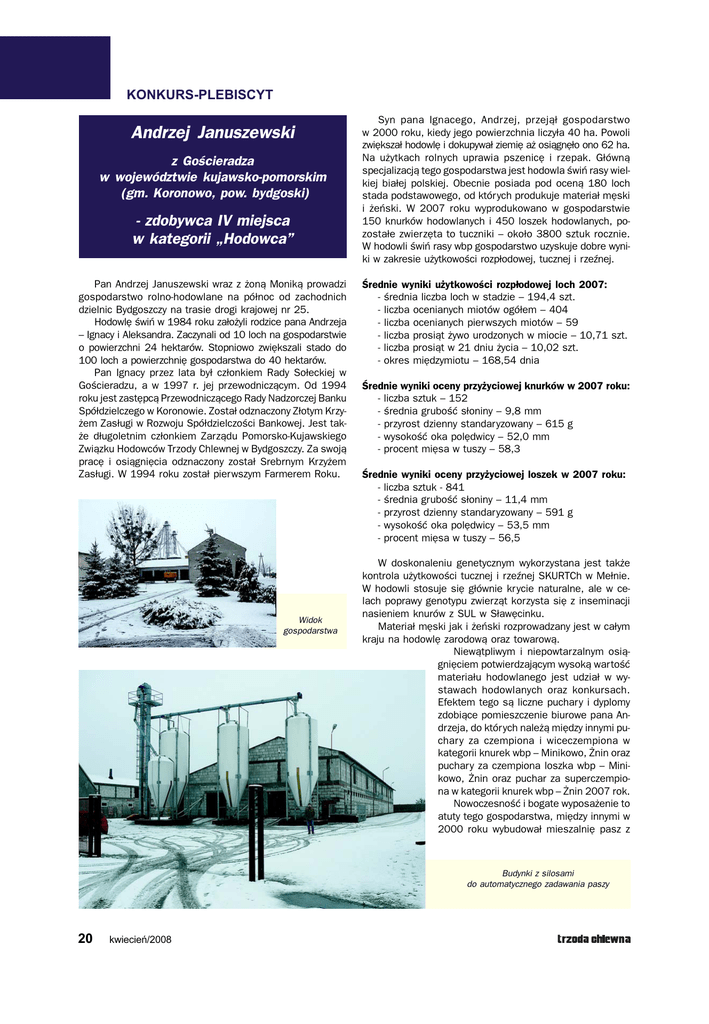 KONKURS-PLEBISCYT Andrzej Januszewski z Gocieradza w województwie kujawsko-pomorskim (gm. Koronowo, pow. bydgoski) - zdobywca IV miejsca w kategorii Hodowca Pan Andrzej Januszewski wraz z ¿on¹ Monik¹ prowadzi gospodarstwo rolno-hodowlane na pó³noc od zachodnich dzielnic Bydgoszczy na trasie drogi krajowej nr 25. Hodowlê wiñ w 1984 roku za³o¿yli rodzice pana Andrzeja Ignacy i Aleksandra. Zaczynali od 10 loch na gospodarstwie o powierzchni 24 hektarów. Stopniowo zwiêkszali stado do 100 loch a powierzchniê gospodarstwa do 40 hektarów. Pan Ignacy przez lata by³ cz³onkiem Rady So³eckiej w Gocieradzu, a w 1997 r. jej przewodnicz¹cym. Od 1994 roku jest zastêpc¹ Przewodnicz¹cego Rady Nadzorczej Banku Spó³dzielczego w Koronowie. Zosta³ odznaczony Z³otym Krzy¿em Zas³ugi w Rozwoju Spó³dzielczoci Bankowej. Jest tak¿e d³ugoletnim cz³onkiem Zarz¹du Pomorsko-Kujawskiego Zwi¹zku Hodowców Trzody Chlewnej w Bydgoszczy. Za swoj¹ pracê i osi¹gniêcia odznaczony zosta³ Srebrnym Krzy¿em Zas³ugi. W 1994 roku zosta³ pierwszym Farmerem Roku. Widok gospodarstwa Syn pana Ignacego, Andrzej, przej¹³ gospodarstwo w 2000 roku, kiedy jego powierzchnia liczy³a 40 ha. Powoli zwiêksza³ hodowlê i dokupywa³ ziemiê a¿ osi¹gnê³o ono 62 ha. Na u¿ytkach rolnych uprawia pszenicê i rzepak. G³ówn¹ specjalizacj¹ tego gospodarstwa jest hodowla wiñ rasy wielkiej bia³ej polskiej. Obecnie posiada pod ocen¹ 180 loch stada podstawowego, od których produkuje materia³ mêski i ¿eñski. W 2007 roku wyprodukowano w gospodarstwie 150 knurków hodowlanych i 450 loszek hodowlanych, pozosta³e zwierzêta to tuczniki oko³o 3800 sztuk rocznie. W hodowli wiñ rasy wbp gospodarstwo uzyskuje dobre wyniki w zakresie u¿ytkowoci rozp³odowej, tucznej i rzenej. rednie wyniki u¿ytkowoci rozp³odowej loch 2007: - rednia liczba loch w stadzie 194,4 szt. - liczba ocenianych miotów ogó³em 404 - liczba ocenianych pierwszych miotów 59 - liczba prosi¹t ¿ywo urodzonych w miocie 10,71 szt. - liczba prosi¹t w 21 dniu ¿ycia 10,02 szt. - okres miêdzymiotu 168,54 dnia rednie wyniki oceny przy¿yciowej knurków w 2007 roku: - liczba sztuk 152 - rednia gruboæ s³oniny 9,8 mm - przyrost dzienny standaryzowany 615 g - wysokoæ oka polêdwicy 52,0 mm - procent miêsa w tuszy 58,3 rednie wyniki oceny przy¿yciowej loszek w 2007 roku: - liczba sztuk - 841 - rednia gruboæ s³oniny 11,4 mm - przyrost dzienny standaryzowany 591 g - wysokoæ oka polêdwicy 53,5 mm - procent miêsa w tuszy 56,5 W doskonaleniu genetycznym wykorzystana jest tak¿e kontrola u¿ytkowoci tucznej i rzenej SKURTCh w Me³nie. W hodowli stosuje siê g³ównie kr ycie naturalne, ale w celach poprawy genotypu zwierz¹t korzysta siê z inseminacji nasieniem knurów z SUL w S³awêcinku. Materia³ mêski jak i ¿eñski rozprowadzany jest w ca³ym kraju na hodowlê zarodow¹ oraz towarow¹. Niew¹tpliwym i niepowtarzalnym osi¹gniêciem potwierdzaj¹cym wysok¹ wartoæ materia³u hodowlanego jest udzia³ w wystawach hodowlanych oraz konkursach. Efektem tego s¹ liczne puchary i dyplomy zdobi¹ce pomieszczenie biurowe pana Andrzeja, do któr ych nale¿¹ miêdzy innymi puchar y za czempiona i wiceczempiona w kategorii knurek wbp Minikowo, ¯nin oraz puchary za czempiona loszka wbp Minikowo, ¯nin oraz puchar za superczempiona w kategorii knurek wbp ¯nin 2007 rok. Nowoczesnoæ i bogate wyposa¿enie to atuty tego gospodarstwa, miêdzy innymi w 2000 roku wybudowa³ mieszalniê pasz z Budynki z silosami do automatycznego zadawania paszy 20 kwiecieñ/2008 KONKURS-PLEBISCYT Budynki inwentarskie Trzy pokolenia Pañstwa Januszewskich; Aleksandra i Ignacy, Monika i Andrzej, Natalia i Tomasz Silosy zbo¿owe Dzieci Pañstwa Januszewskich z prosiêtami Budynek mieszkalny z zabudowaniami gospodarczymi magazynem zbo¿owym na 300 ton, gdzie produkuje pasze treciwe na potrzeby w³asne. Daje to wymierne korzyci dla gospodarstwa. W 2002 roku silosy zbo¿owe na 1300 ton, w 2003 roku budynek inwentarski na 90 loch, a w 20042005 roku budynek inwentarski na 1500 sztuk. Ponadto w 2006 roku, korzystaj¹c ze rodków unijnych, wymieniono park maszynowy. Pan Andrzej w produkcji rolnej przestrzega zasad Kodeksu Dobrej Praktyki Rolniczej. Dbaj¹c o ochronê naturalnego rodowiska i w³aciwe zagospodarowanie odchodów zwierzêcych wybudowa³ p³ytê gnojow¹ ze zbiornikiem na gnojówkê. Gospodarstwo spe³nia wymogi w zakresie dobrostanu zwierz¹t. Budynki inwentarskie i mieszkalne, a tak¿e obejcie gospodarstwa s¹ wyj¹tkowo zadbane i dobrze utrzy- mane. W 1997 roku gospodarstwo otrzyma³o Z³ot¹ Wiechê za najlepszy budynek i zagrodê wiejsk¹. Pan Andrzej Januszewski jest laureatem konkursu Rolnik Pomorza i Kujaw 2003 i Mistrz Wojewódzki Krajowej Agroligi 2003 w kategorii Rolnicy oraz otrzyma³ specjaln¹ nagrodê Prezesa Agencji Restrukturyzacji i Modernizacji Rolnictwa. Za zas³ugi dla powiatu bydgoskiego otrzyma³ Medal Starosty Bydgoskiego. Za osi¹gniêcia w hodowli zosta³ uhonorowany odznak¹ Zas³u¿ony dla Rolnictwa w 2005 roku. Pan Andrzej jest ambitnym hodowc¹, poch³oniêtym prac¹, a mimo wszystko znajduje czas na dzia³alnoæ spo³eczn¹. Wspiera finansowo stra¿ po¿arn¹, kluby sportowe, warsztaty terapii zajêciowej i ludzi dotkniêtych ubóstwem. Stado loch pana Andrzeja jest pod sta³ym nadzorem lekarza weter ynarii i posiada wysoki status zdrowotnoci. Istotn¹ i wa¿n¹ rzecz¹ w hodowli jest bezstresowoæ stada. W chwili obecnej hodowca eliminuje ostatnie lochy heterozygotyczne i w nied³ugim czasie ca³e stado bêdzie bezstresowe. Hodowca wspó³pracuje w zakresie ¿ywienia zwierz¹t z firmami SAN-VIT, VITFOSS, DLG i LNB a ¿ywiec odstawia do zak³adu nale¿¹cego do PKM DUDA. Ewa Ko³acz, Marek Moñko PZHiPTCh POLSUS Filia Bydgoszcz kwiecieñ/2008 21