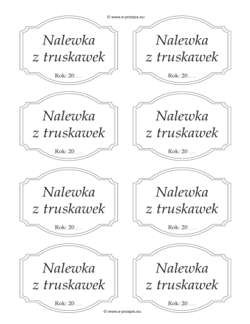 © www.e-przepis.eu Nalewka z truskawek Nalewka z truskawek Rok: 20.............. Rok: 20.............. Nalewka z truskawek Nalewka z truskawek Rok: 20.............. Rok: 20.............. Nalewka z truskawek Nalewka z truskawek Rok: 20.............. Rok: 20.............. Nalewka z truskawek Nalewka z truskawek Rok: 20.............. Rok: 20.............. © www.e-przepis.eu