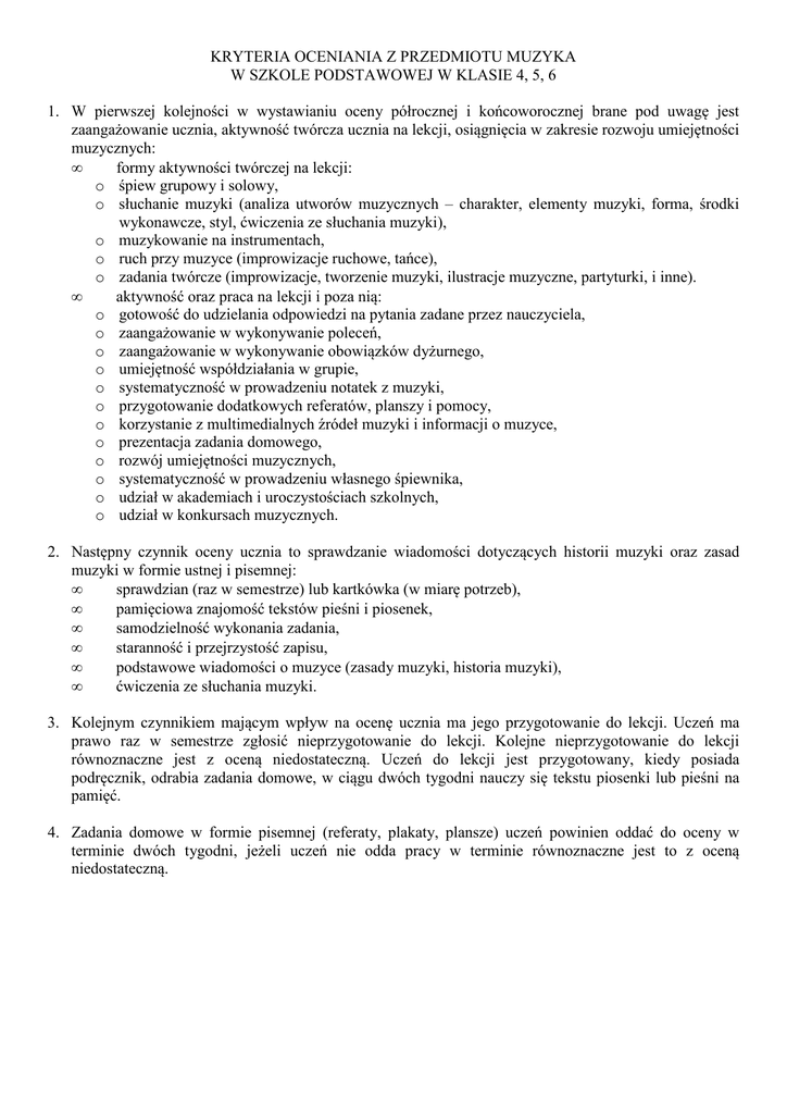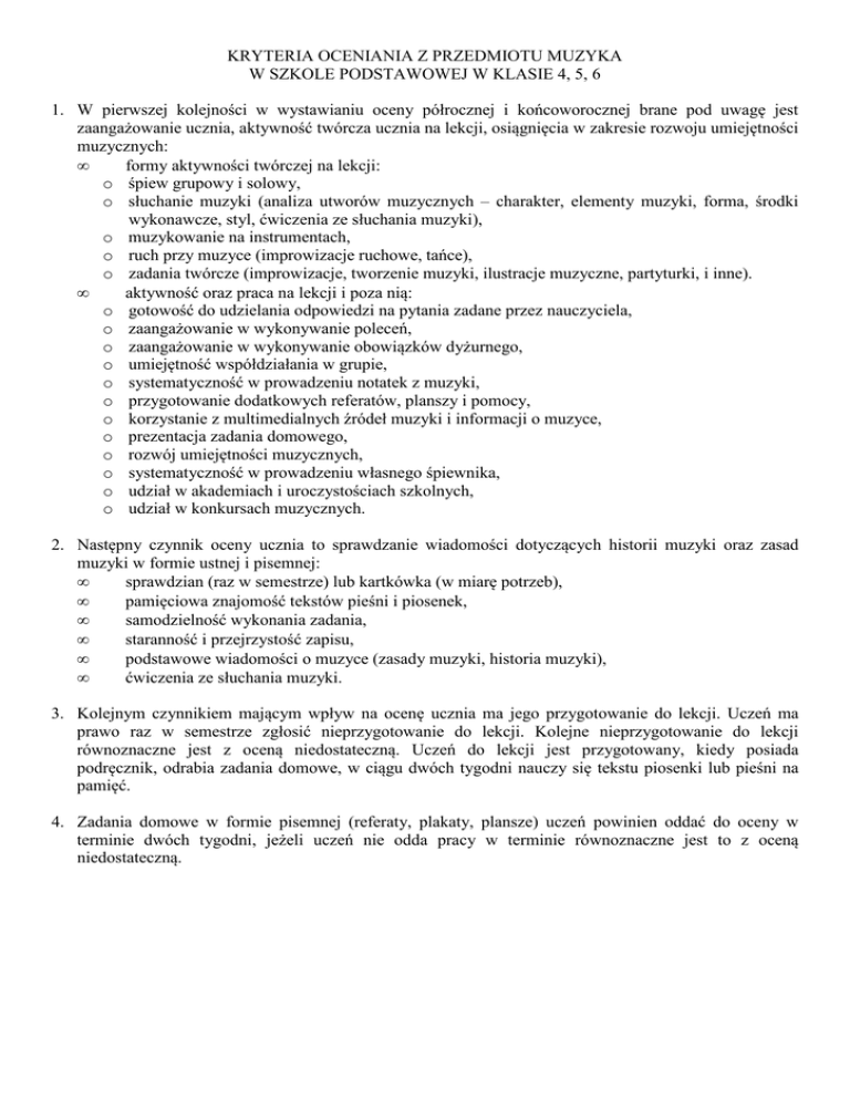 KRYTERIA OCENIANIA Z PRZEDMIOTU MUZYKA W SZKOLE PODSTAWOWEJ W KLASIE 4, 5, 6 1. W pierwszej kolejności w wystawianiu oceny półrocznej i końcoworocznej brane pod uwagę jest zaangażowanie ucznia, aktywność twórcza ucznia na lekcji, osiągnięcia w zakresie rozwoju umiejętności muzycznych: • formy aktywności twórczej na lekcji: o śpiew grupowy i solowy, o słuchanie muzyki (analiza utworów muzycznych – charakter, elementy muzyki, forma, środki wykonawcze, styl, ćwiczenia ze słuchania muzyki), o muzykowanie na instrumentach, o ruch przy muzyce (improwizacje ruchowe, tańce), o zadania twórcze (improwizacje, tworzenie muzyki, ilustracje muzyczne, partyturki, i inne). • aktywność oraz praca na lekcji i poza nią: o gotowość do udzielania odpowiedzi na pytania zadane przez nauczyciela, o zaangażowanie w wykonywanie poleceń, o zaangażowanie w wykonywanie obowiązków dyżurnego, o umiejętność współdziałania w grupie, o systematyczność w prowadzeniu notatek z muzyki, o przygotowanie dodatkowych referatów, planszy i pomocy, o korzystanie z multimedialnych źródeł muzyki i informacji o muzyce, o prezentacja zadania domowego, o rozwój umiejętności muzycznych, o systematyczność w prowadzeniu własnego śpiewnika, o udział w akademiach i uroczystościach szkolnych, o udział w konkursach muzycznych. 2. Następny czynnik oceny ucznia to sprawdzanie wiadomości dotyczących historii muzyki oraz zasad muzyki w formie ustnej i pisemnej: • sprawdzian (raz w semestrze) lub kartkówka (w miarę potrzeb), • pamięciowa znajomość tekstów pieśni i piosenek, • samodzielność wykonania zadania, • staranność i przejrzystość zapisu, • podstawowe wiadomości o muzyce (zasady muzyki, historia muzyki), • ćwiczenia ze słuchania muzyki. 3. Kolejnym czynnikiem mającym wpływ na ocenę ucznia ma jego przygotowanie do lekcji. Uczeń ma prawo raz w semestrze zgłosić nieprzygotowanie do lekcji. Kolejne nieprzygotowanie do lekcji równoznaczne jest z oceną niedostateczną. Uczeń do lekcji jest przygotowany, kiedy posiada podręcznik, odrabia zadania domowe, w ciągu dwóch tygodni nauczy się tekstu piosenki lub pieśni na pamięć. 4. Zadania domowe w formie pisemnej (referaty, plakaty, plansze) uczeń powinien oddać do oceny w terminie dwóch tygodni, jeżeli uczeń nie odda pracy w terminie równoznaczne jest to z oceną niedostateczną.