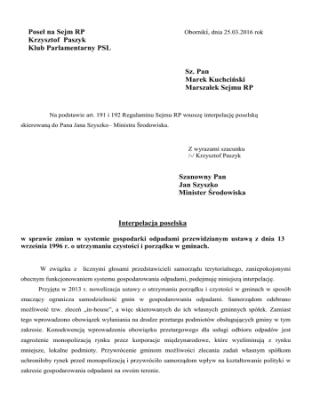Poseł na Sejm RP Krzysztof Paszyk Klub Parlamentarny PSL Oborniki, dnia 25.03.2016 rok Sz. Pan Marek Kuchciński Marszałek Sejmu RP Na podstawie art. 191 i 192 Regulaminu Sejmu RP wnoszę interpelację poselską skierowaną do Pana Jana Szyszko– Ministra Środowiska. Z wyrazami szacunku /-/ Krzysztof Paszyk Szanowny Pan Jan Szyszko Minister Środowiska Interpelacja poselska w sprawie zmian w systemie gospodarki odpadami przewidzianym ustawą z dnia 13 września 1996 r. o utrzymaniu czystości i porządku w gminach. W związku z licznymi głosami przedstawicieli samorządu terytorialnego, zaniepokojonymi obecnym funkcjonowaniem systemu gospodarowania odpadami, podejmuję niniejszą interpelację. Przyjęta w 2013 r. nowelizacja ustawy o utrzymaniu porządku i czystości w gminach w sposób znaczący ogranicza samodzielność gmin w gospodarowaniu odpadami. Samorządom odebrano możliwość tzw. zleceń „in-house”, a więc skierowanych do ich własnych gminnych spółek. Zamiast tego wprowadzono obowiązek wyłaniania na drodze przetargu podmiotów obsługujących gminy w tym zakresie. Konsekwencją wprowadzenia obowiązku przetargowego dla usługi odbioru odpadów jest zagrożenie monopolizacją rynku przez korporacje międzynarodowe, które wyeliminują z rynku mniejsze, lokalne podmioty. Przywrócenie gminom możliwości zlecania zadań własnym spółkom uchroniłoby rynek przed monopolizacją i przywróciło samorządom wpływ na kształtowanie polityki w zakresie gospodarowania odpadami na swoim terenie. Równie istotne są precyzyjne i przejrzyste kryteria ustalania wysokości stawki opłaty za gospodarowanie odpadami oraz ustalenie standardów selektywnej zbiórki. Brak takiego uszczegółowienia powoduje częste ustalanie stawek opartych na nierealistycznych przesłankach, co z kolei stanowi źródło napięć i konfliktów w lokalnych społecznościach. Kolejnym ważnym problemem z jakim spotkały się samorządy są terminy osiągnięcia odpowiednich poziomów odzysku i recyklingu. Potrzebne jest w tym zakresie przedłużenie terminów, umożliwiające gminom dostosowanie się do nowych warunków. Warte ponownego rozważeniu są też stawki opłat marszałkowskich. Ich obniżenie pozwoliłoby na redukcje kosztów całego systemu gospodarowania odpadami. Osobną kwestią jest sposób w jaki nowelizacja traktuje działkowców. W praktyce zrównano właścicieli ogródków działkowych z właścicielami domów letniskowych. Powoduje to wzrost stawek opłat ryczałtowych za odbiór odpadów na poziomie kilkuset procent. Właściciele ogródków działkowych to w przeważającej części emeryci, renciści i osoby niezamożne, podwyżki opłat dotykają ich więc w sposób szczególny. Według nowych zasad działkowcy są zobowiązani płacić za odbiór odpadów przez cały rok, mimo że wytwarzają odpady tylko w sezonie, tj. od marca do września. Zmiany w ustawie o utrzymaniu czystości i porządku w gminach powinny uwzględnić specyfikę ogródków działkowych, odmienną od nieruchomości użytkowanych przez cały rok. W związku z powyższym zwracam się do Pana ministra z następującymi pytaniami: Czy Rząd planuje działania w kierunku przywrócenia samorządom możliwości bezprzetargowego zlecania gospodarowania odpadami spółkom gminnym (in-house) ? Czy planowane są zmiany legislacyjne ukierunkowane na uszczegółowienie kryteriów ustalania stawki za gospodarowanie odpadami, oraz ustalenie standardów selektywnej zbiórki odpadów ? Czy Rząd podejmie działania ukierunkowane na przedłużenie terminów osiągnięcia przez gminy odpowiednich poziomów odzysku i recyklingu odpadów ? Co Rząd zamierza zrobić dla poprawy położenia poszkodowanych przez obecna ustawę właścicieli ogródków działkowych ? Z wyrazami szacunku /-/ Krzysztof Paszyk