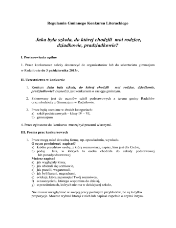 Regulamin Gminnego Konkursu Literackiego Jaka była szkoła, do której chodzili moi rodzice, dziadkowie, pradziadkowie? I. Postanowienia ogólne 1. Prace konkursowe należy dostarczyć do organizatorów lub do sekretariatu gimnazjum w Radziłowie do 3 października 2013r. II. Uczestnictwo w konkursie 1. Konkurs Jaka była szkoła, do której chodzili moi rodzice, dziadkowie, pradziadkowie? (sąsiedzi) jest konkursem o zasięgu gminnym. 2. Skierowany jest do uczniów szkół podstawowych z terenu gminy Radziłów oraz młodzieży z Gimnazjum w Radziłowie. 3. Prace będą oceniane w dwóch kategoriach: a) szkół podstawowych – klasy IV – VI, b) gimnazjum 4. Prace zgłoszone do konkursu muszą być pracami własnymi. III. Forma prac konkursowych 1. Prace mogą mieć dowolną formę, np. opowiadania, wywiadu. O czym powinieneś napisać? a) krótko przedstaw osobę, z którą rozmawiasz, napisz, kim jest dla Ciebie, b) podaj lata, w których ta osoba chodziła do szkoły podstawowej lub ponadpodstawowej Możesz napisać a) jak wyglądały klasy, b) jak ubierali się uczniowie, c) jak psocili, wagarowali, d) jak byli karani, nagradzani, e) o lekcji, którą zapamiętał Twój rozmówca, f) o nauczycielu, którego wspomina do dzisiaj, g) o przedmiotach, których nie ma w dzisiejszej szkole, Nie musisz uwzględniać w swojej pracy podanych przykładów, bo są to tylko propozycje. Możesz wybrać którąś z nich lub napisać zupełnie o czymś innym. IV. Warunkiem uczestnictwa w konkursie jest dostarczenie maszynopisu lub pracy napisanej odręcznie (czytelnie, estetycznie) w jednym egzemplarzu lub –jeśli chcesznagrania (wywiad). Prace należy podpisać imieniem i nazwiskiem autora. Trzeba również podać nazwę szkoły. V. Wyłanianie nagrodzonych prac 1. Wyboru najciekawszych prac dokona jury powołane spośród nauczycieli Gimnazjum w Radziłowie. 2. Zakłada się przyznanie trzech nagród książkowych w kategorii gimnazjum oraz w kategorii szkół podstawowych. Przewiduje się zwiększenie liczby nagród w przypadku pozyskania sponsorów. 3. Informacja o przyznaniu nagród i wyróżnień zostanie przesłana do szkół do10 października 2013 r. Organizatorzy: Beata Ziemkiewicz Sławomir Modzelewski