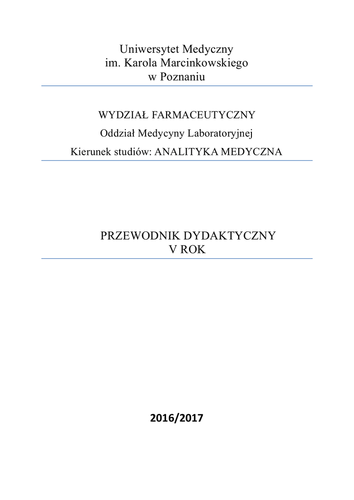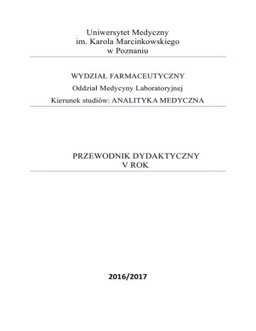 Uniwersytet Medyczny im. Karola Marcinkowskiego w Poznaniu WYDZIAŁ FARMACEUTYCZNY Oddział Medycyny Laboratoryjnej Kierunek studiów: ANALITYKA MEDYCZNA PRZEWODNIK DYDAKTYCZNY V ROK 2016/2017 Spis treści PRZEDMIOTY OBOWIĄZKOWE ................................................................................................................................ 3 DIAGNOSTYKA LABORATORYJNA .............................................................................................................. 4 ETYKA ZAWODOWA ......................................................................................................................................... 6 ORGANIZACJA MEDYCZNYCH LABORATORIÓW DIAGNOSTYCZNYCH....................................... 7 PRAKTYCZNA NAUKA ZAWODU .................................................................................................................. 8 PROPEDEUTYKA MEDYCYNY..................................................................................................................... 10 PROPEDEUTYKA PEDIATRII ...................................................................................................................... 12 SYSTEMY JAKOŚCI I AKREDYTACJA LABORATORIÓW ................................................................... 15 ĆWICZENIA SPECJALISTYCZNE I METODOLOGIA BADAŃ ............................................................ 16 2 PRZEDMIOTY OBOWIĄZKOWE V rok Rok / semestr Przedmioty (kod przedmiotu, osoba odpowiedzialna za przedmiot) Liczba godzin Punkty ECTS Forma zaliczenia Wykł. Ćw. Sem. V / IX Diagnostyka laboratoryjna MK_37 Dr hab. Ewa Wysocka - 60 - 7 Egzamin V / IX Etyka zawodowa MK_29 Dr Leszek Bartkowiak - - 15 1 Zaliczenie V / IX Organizacja medycznych laboratoriów diagnostycznych MK_30 Prof. dr hab. Zygmunt Kopczyński - - 15 1 Zaliczenie V / IX Praktyczna nauka zawodu MK_49 Dr hab. Ewa Wysocka - 90 - 6 Egzamin V / IX Propedeutyka medycyny MK_26 Prof. dr hab. Danuta Pupek - Musialik 15 50 25 7 Egzamin V / IX Propedeutyka pediatrii MK_28 Prof. dr hab. Jarosław Walkowiak - 10 5 1 Zaliczenie V / IX Systemy jakości i akredytacja laboratoriów MK_32 Prof. dr hab. Zygmunt Kopczyński - - 30 2 Zaliczenie V/X Ćwiczenia specjalistyczne i metodologia badań MK_36 - 375 - 35 Egzamin 15 590 85 60 Łącznie przedmioty obowiązkowe Łącznie do zaliczenia V roku 60 3 Kod przedmiotu/modułu MK_37 Punkty ETCS: 8 Nazwa przedmiotu: Diagnostyka laboratoryjna Jednostka: Katedra i Zakład Diagnostyki Laboratoryjnej, ul. Szamarzewskiego 82/84, 60-569 Poznań Osoba odpowiedzialna za przedmiot: dr hab. Ewa Wysocka [email protected] Wymiar zajęć Wykłady Ćwiczenia Łącznie 30 h 60 h 90 h Warunki wstępne Podstawowa wiedza z zakresu patofizjologii człowieka. Znajomość rutynowych badań laboratoryjnych wykorzystywanych w diagnostyce różnych stanów chorobowych; Przedmioty, które należy wcześniej zaliczyć – ogólna analityka i techniki pobierania materiału, biochemia, patofizjologia, biochemia kliniczna, chemia kliniczna. Cel kształcenia Zdobycie wiedzy w zakresie patobiochemii rozwoju chorób wewnętrznych i umiejętności doboru optymalnego panelu badań diagnostycznych, interpretacji wyników oraz posługiwania się algorytmami postępowania diagnostycznego w różnych stanach klinicznych. Forma i warunki zaliczenia Wykłady – uzyskanie pozytywnej oceny z testowego sprawdzianu końcowego Ćwiczenia – uzyskanie pozytywnej oceny ze sprawdzianu końcowego na każdym ćwiczeniu. Uzyskanie pozytywnej oceny z egzaminu końcowego. Literatura podstawowa 1. Kopczyński Z. (red), Wybrane zagadnienia z laboratoryjnej diagnostyki medycznej, Wydawnictwo Naukowe Uniwersytetu Medycznego w Poznaniu, Poznań 2014. 2. Dembińska A., Naskalski J. (red.), Diagnostyka laboratoryjna z elementami biochemii klinicznej, Elsevier Urban & Partner, Wrocław 2010. 3. Kokot F., Diagnostyka różnicowa objawów chorobowych, PZWL, Warszawa 1990. 4. Kopczyński Z., Adam W., Wybrane zagadnienia z diagnostyki laboratoryjnej: skrypt dla studentów V roku Oddziału Analityki Medycznej, Wyd. Ucz. Akademii Medycznej w Poznaniu, Poznań 1994. 5. Brunzel N.A., Kemona H., Mantur M. (red.pol.), Diagnostyka laboratoryjna, Elsevier Urban & Partner, 2010. Literatura uzupełniająca 1. Angielski S., Dominiczak M.H., Jakubowski Z.,: Biochemia kliniczna, Wyd. Perseusz, Sopot 2000. 2. Tomaszewski. J., Diagnostyka Laboratoryjna. Podręcznik dla studentów medycyny, PZWL, Warszawa 2001. 4 Organizacja zajęć, regulamin i program zajęć Wykłady Zagadnienia z zakresu diagnostyki laboratoryjnej zaburzeń przemiany lipidowej, zawału mięśnia sercowego, zaburzeń wodno – elektrolitowych, zaburzeń równowagi kwasowo – zasadowej, chorób trzustki, żółtaczki hemolitycznej i zaporowej, wirusowego zapalenia wątroby, zaburzeń przemiany węglowodanowej oraz chorób nowotworowych i endokrynologii. Ćwiczenia Diagnostyka laboratoryjna wrodzonych chorób metabolicznych. Rola badań laboratoryjnych w diagnostyce różnicowej wstrząsu oraz laboratoryjne różnicowanie drgawek. Diagnostyka laboratoryjna porfirii. Interpretacja wyników badań laboratoryjnych wykonywanych u noworodków, u kobiet w okresie ciąży oraz u pacjentów w wieku starszym. Diagnostyka laboratoryjna osteoporozy. Metody badawcze w biochemicznej diagnostyce medycznej. Diagnostyka laboratoryjna zespołu złego wchłaniania. Diagnostyka laboratoryjna skaz krwotocznych. Diagnostyka laboratoryjna chorób alergicznych. Badanie laboratoryjne płynu stawowego. Diagnostyka laboratoryjna kiły i HIV. Diagnostyka laboratoryjna grzybic. Regulamin i organizacja zajęć znajdują się na platformie WISUS 5 Kod przedmiotu/modułu MK_29 Punkty ETCS: 1 Nazwa przedmiotu: Etyka zawodowa Jednostka: Zakład Zdrowia Publicznego, ul. Dąbrowskiego 79, 60-529 Poznań, Coll. A. Wrzoska Osoba odpowiedzialna za przedmiot: dr Leszek Bartkowiak [email protected] Wymiar zajęć Seminaria 15 h Łącznie 15 h Warunki wstępne Studen