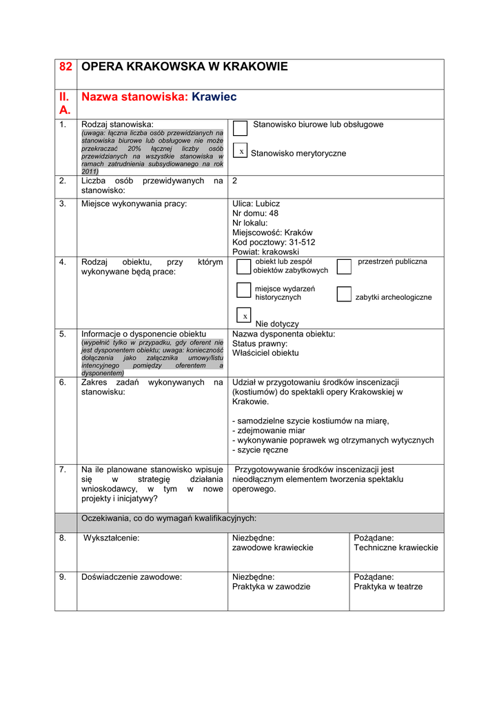 82 OPERA KRAKOWSKA W KRAKOWIE II. Nazwa stanowiska: Krawiec A. 1. Rodzaj stanowiska: Stanowisko biurowe lub obsługowe (uwaga: łączna liczba osób przewidzianych na stanowiska biurowe lub obsługowe nie może przekraczać 20% łącznej liczby osób przewidzianych na wszystkie stanowiska w ramach zatrudnienia subsydiowanego na rok 2011) 2. Liczba osób stanowisko: przewidywanych 3. Miejsce wykonywania pracy: 4. Rodzaj obiektu, przy wykonywane będą prace: na x Stanowisko merytoryczne 2 Ulica: Lubicz Nr domu: 48 Nr lokalu: Miejscowość: Kraków Kod pocztowy: 31-512 Powiat: krakowski obiekt lub zespół obiektów zabytkowych którym miejsce wydarzeń historycznych przestrzeń publiczna zabytki archeologiczne x 5. Informacje o dysponencie obiektu (wypełnić tylko w przypadku, gdy oferent nie jest dysponentem obiektu; uwaga: konieczność dołączenia jako załącznika umowy/listu intencyjnego pomiędzy oferentem a dysponentem) 6. Zakres zadań stanowisku: wykonywanych na Nie dotyczy Nazwa dysponenta obiektu: Status prawny: Właściciel obiektu Udział w przygotowaniu środków inscenizacji (kostiumów) do spektakli opery Krakowskiej w Krakowie. - samodzielne szycie kostiumów na miarę, - zdejmowanie miar - wykonywanie poprawek wg otrzymanych wytycznych - szycie ręczne 7. Na ile planowane stanowisko wpisuje się w strategię działania wnioskodawcy, w tym w nowe projekty i inicjatywy? Przygotowywanie środków inscenizacji jest nieodłącznym elementem tworzenia spektaklu operowego. Oczekiwania, co do wymagań kwalifikacyjnych: 8. Wykształcenie: Niezbędne: zawodowe krawieckie Pożądane: Techniczne krawieckie 9. Doświadczenie zawodowe: Niezbędne: Praktyka w zawodzie Pożądane: Praktyka w teatrze 10. Umiejętności: Niezbędne Zdolności manualne Szycie ręczne Szycie maszynowe Pożądane: Zdolności plastyczne Specjalizacja w krawiectwie męskim lub damskim 11. Cechy osobowe: Niezbędne: samodzielność punktualność, bezkonfliktowość komunikatywność Pożądane: kreatywność entuzjazm łatwość uczenia się 12. Oferta jest kierowana również do osób z niepełnosprawnością Wstępne wymagania dotyczące sprawności kandydata (np. stopień sprawności fizycznej, intelektualnej, wzroku, słuchu, odporność na stres itp.) x Tak Nie Możliwe niewielkie upośledzenie zdolności słyszenia 13. Umiejętności, które osoba nabędzie na stanowisku: Umiejętność pracy w zespole, szycia kostiumów o wysokim stopniu skomplikowania 14. Sposób wprowadzenia osoby na stanowisko (szkolenia wewnętrzne, instruktaże): Szkolenie w zakresie bhp, p.poż, korzystania z obiektu – realizowane przez odpowiednie służby Opery Szkolenie na stanowisku pracy – realizowane przez opiekuna stażu – Weronikę Kowalczyk – Z-cę Kierownika ds. Produkcji 15. Sposób nadzoru/ monitorowania pracy na stanowisku: 16. Sposób organizacji pracy – czas pracy, np. Czy stanowisko wymaga dyspozycyjności w soboty/ niedzielę/ święta? 17. Czy istnieje możliwość zatrudnienia przez Wnioskodawcę po zatrudnieniu subsydiowanym? W stosunku do ilu osób zgłaszanych na stanowisko objęte niniejszą ofertą Wnioskodawca deklaruje możliwość zatrudnienia. 18. Dodatkowe informacje, które mogą być istotne przy ocenie oferty: Instruktaż uzupełniony prezentacją kostiumów o wysokim stopniu skomplikowania wraz z omówieniem technik wykonania. Wykonana praca będzie każdorazowo monitorowana i odbierana przez Brygadiera Pracowni Krawieckiej Męskiej – Ewe Durę lub Damskiej – Katarzynę Kłębczyk Zasadniczo praca w stałych godzinach (7.00 – 15.00 od poniedziałku do piątku), czasami konieczność pracy w sobotę lub nadgodzinach. x Tak Nie Liczba osób: 1 Wnioskodawca planuje przyjęcie w ramach zatrudnienia subsydiowanego jednego Krawca Damskiego i jednego Krawca Męskiego. W okresie przerwy artystycznej tj. od. ok. 15.07 do 30.08 – brak możliwości zapewniania pracy w pełnym wymiarze – w tym okresie zmniejszony wymiar czasu pracy/ urlop lub przestój.